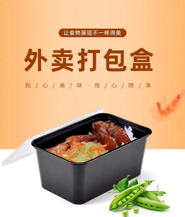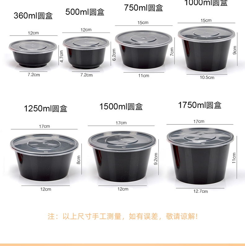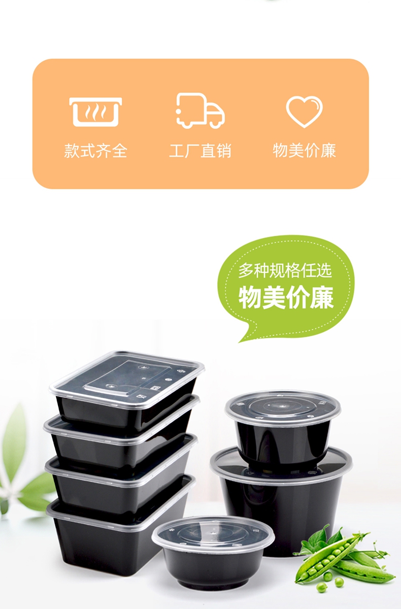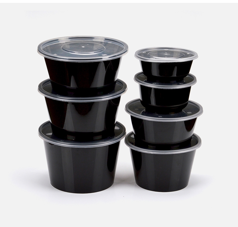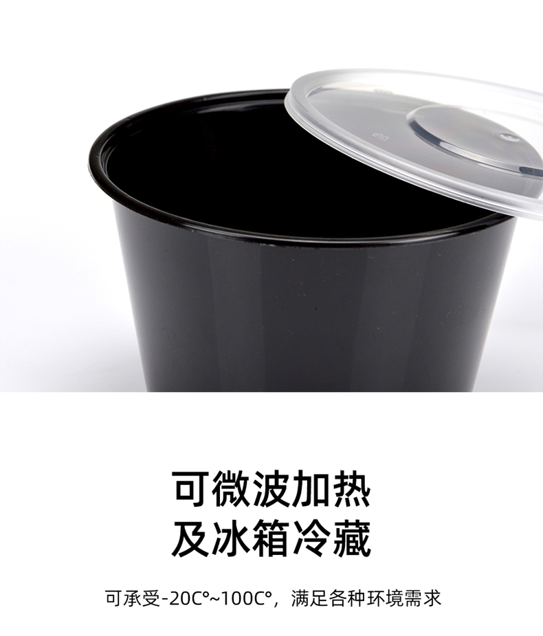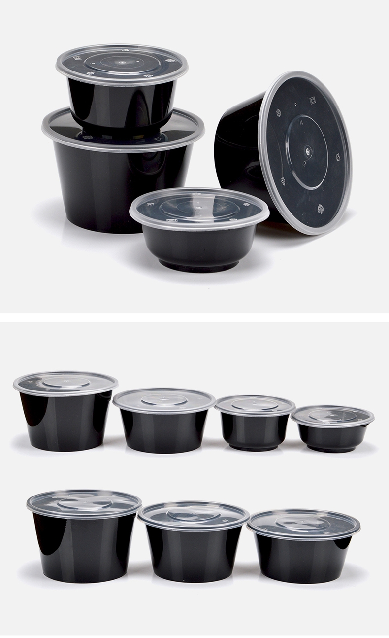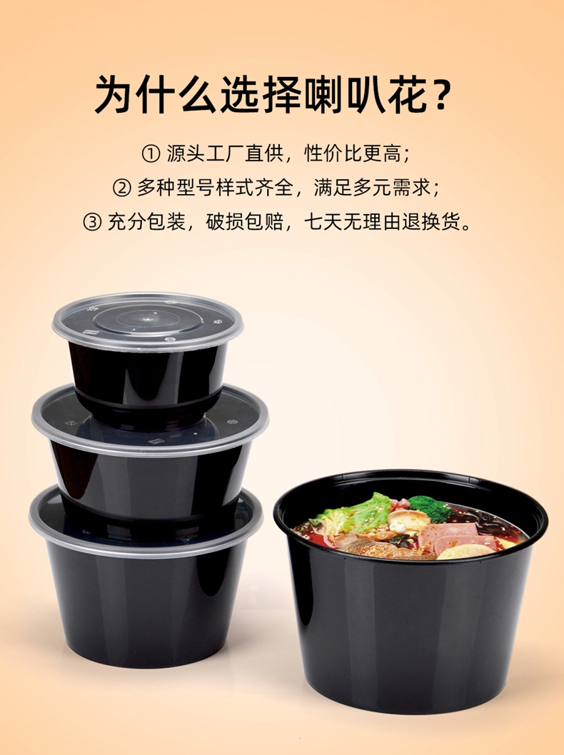 喇叭花打包盒一次性圆形塑料餐盒外卖碗黑色饭盒餐盒带盖50套