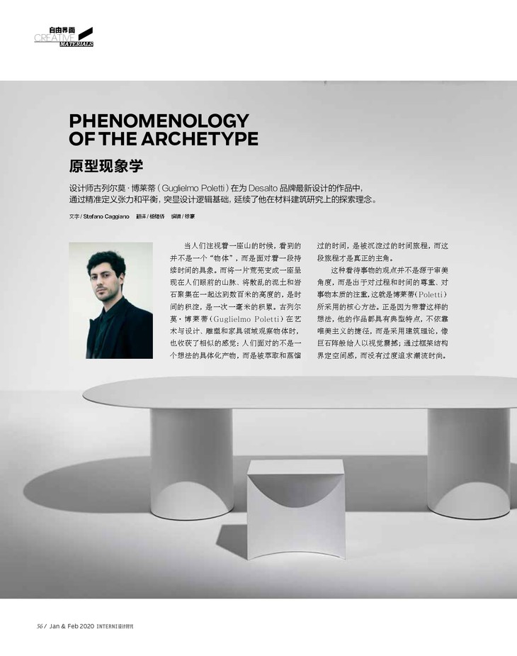 在此次专题中,我们以“自由界面”为题,意图表达材料在物理性和技术性方面的诸多潜力,这体现在材料之于功能、心理、美学、装饰、质地、制造过程、设计趋势、市场营销等方面的价值和意义;同时延伸至材料在社会性和文化性等更深层次的隐喻表达,这体现在其雕塑感、艺术性、现代性、在地性、怀旧感、可持续性和时代精神等。