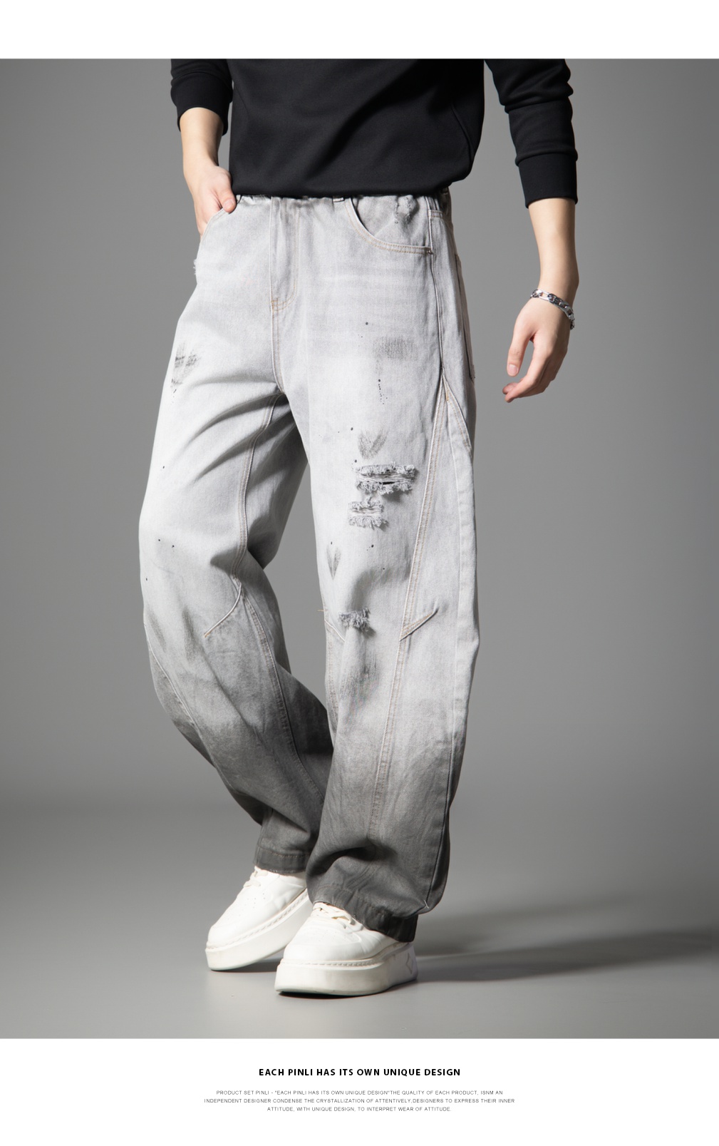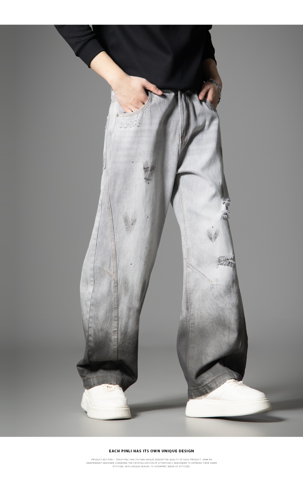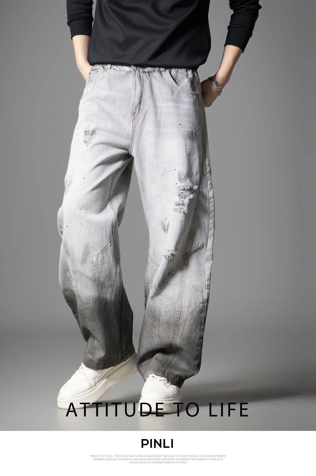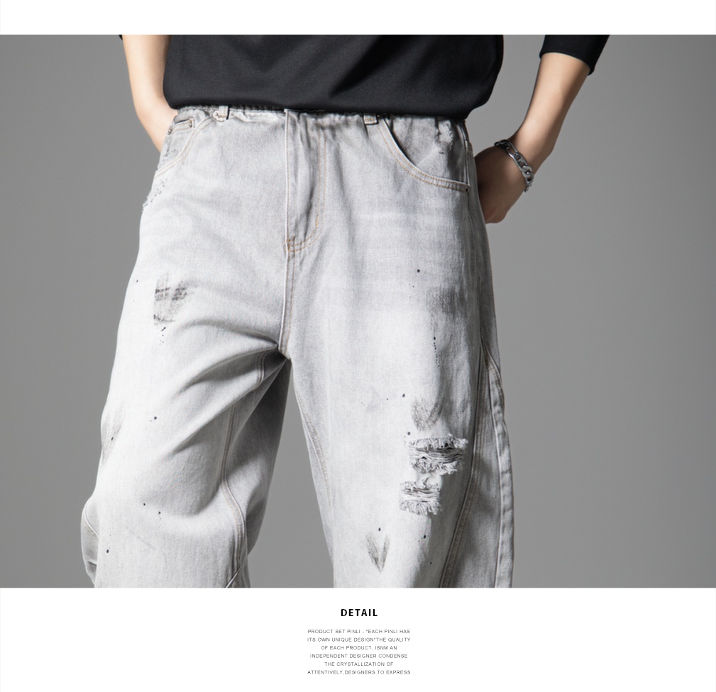 PINLI品立2025秋季新款男士宽松美式高街破洞直筒休闲牛仔长裤潮GD253116139