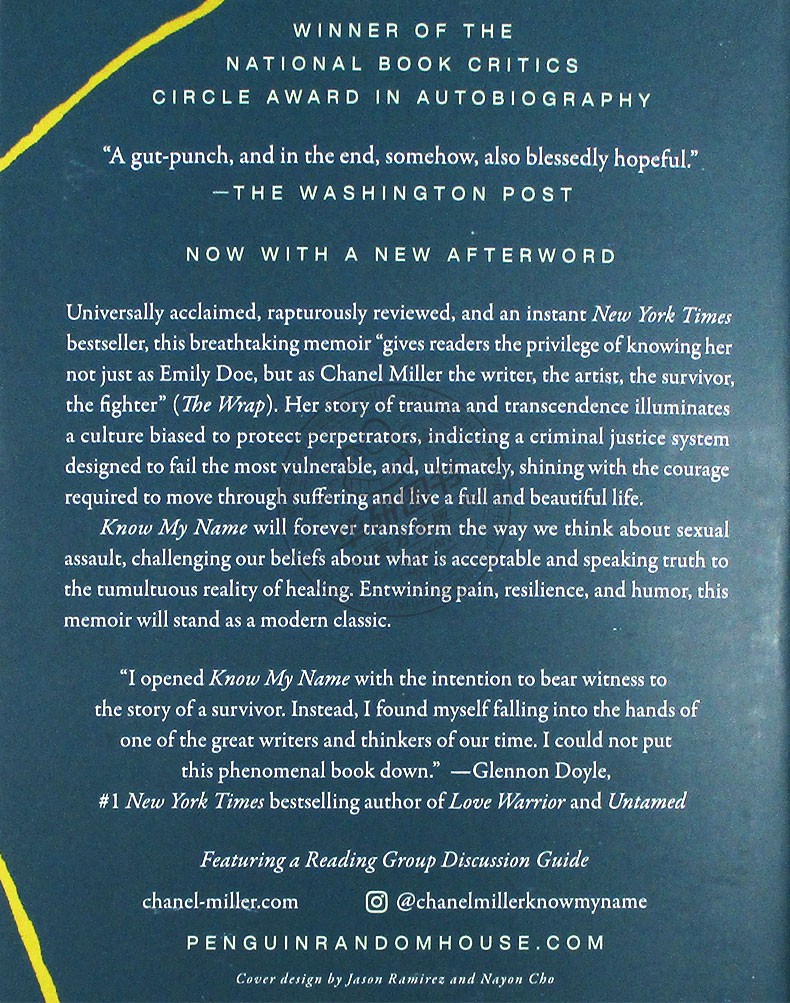 Know My Name is an act of reclamation. On every page, Miller unflattens herself, returning from Victim or Emily Doe to Chanel, a beloved daughter and sister...Know My Name marks the debut of a gifted young writer. Miller's words are purpose. They are maps. And she is a treasure who has prevailed.─Jennifer Weiner, The New York Times