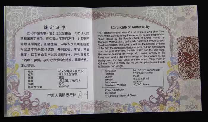 中国人民银行在2016年发行的5盎司猴年本色银币,带原盒及官方证书!