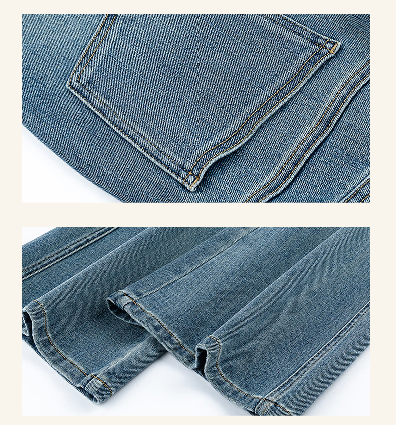 高腰的设计能提升腰线,纵向拉长腿部线条,从而打造三七完美比例,我们特意在裤子前幅做了猫须、马骝痕处理,既增加了复古真是的牛仔味道,也能几种视觉焦点,达到显瘦效果。