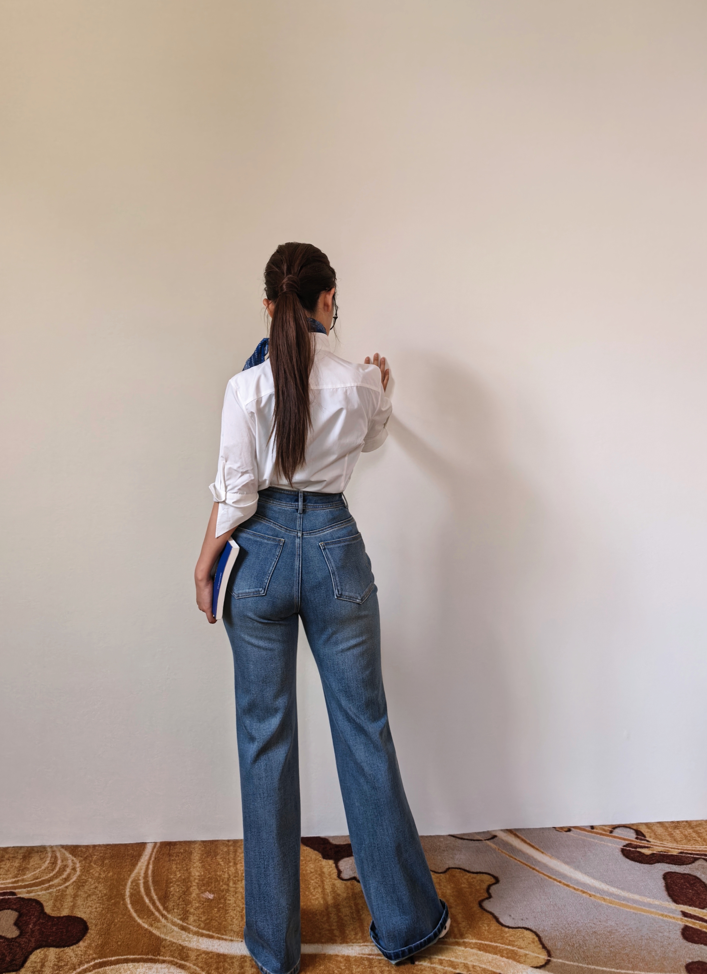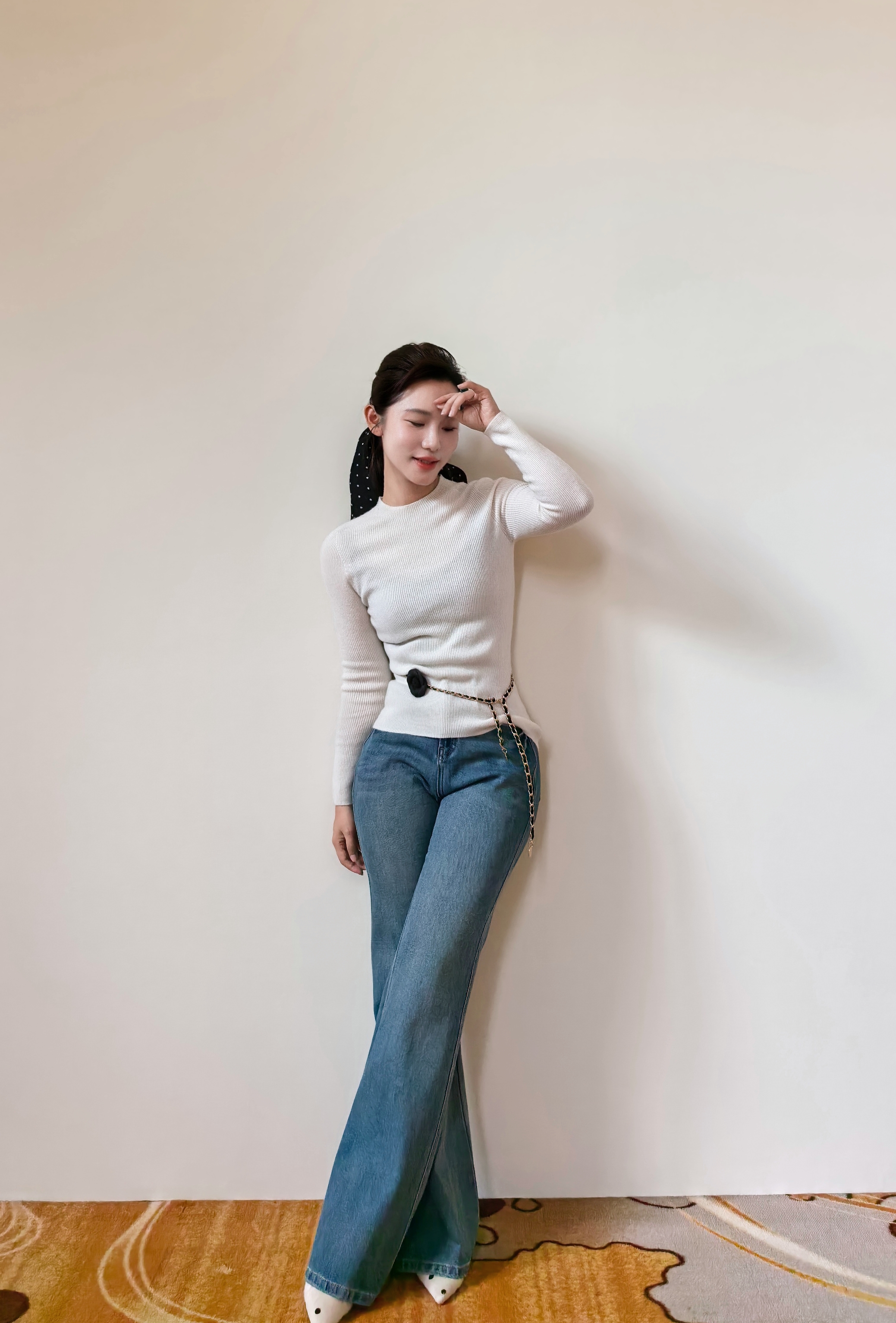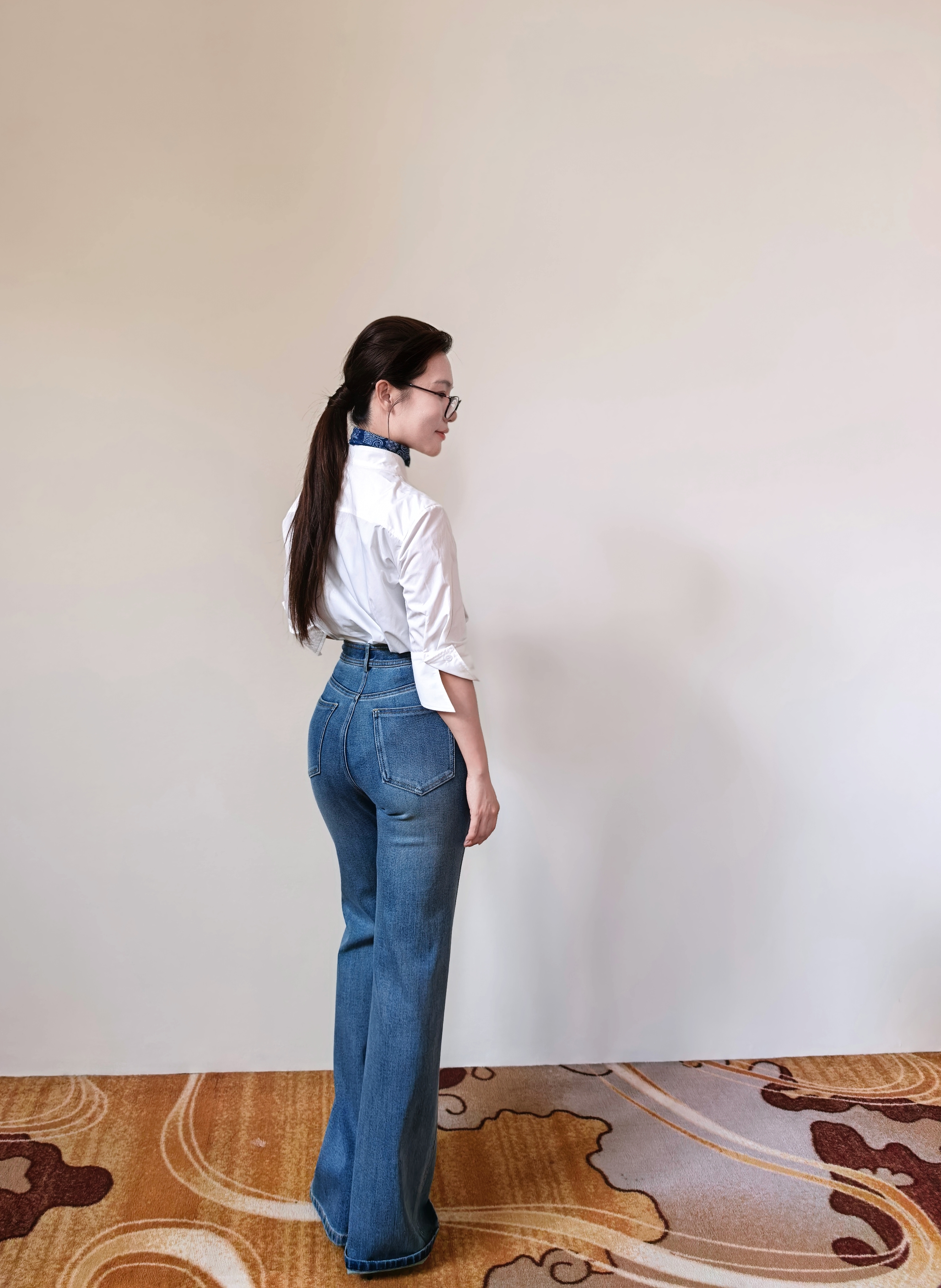 这条牛仔裤是微喇的版型,没有传统的喇叭裤那么挑人,最大的优点就是修饰小腿线条,把大小腿的比例做矫正,显得腿部上下一样的笔直纤细。