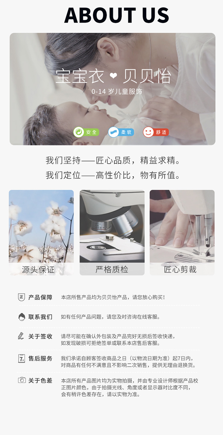 - 贝贝怡专注0-6岁婴幼儿服饰,坚持安全、柔软、舒适的产品理念,为千万中国家庭提供超高品质、安全可靠的婴幼儿服饰产品,妈妈放心,宝宝开心!
