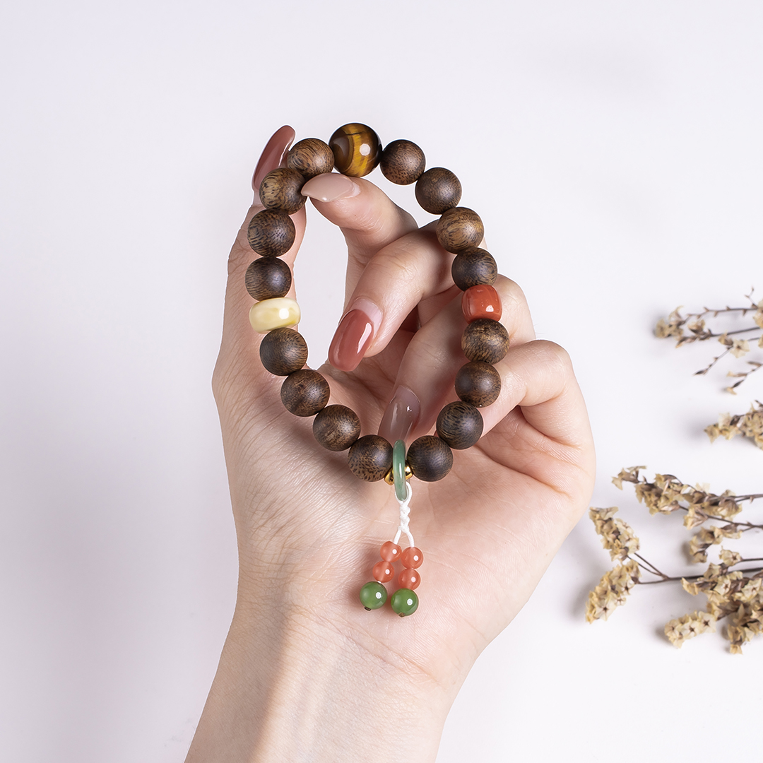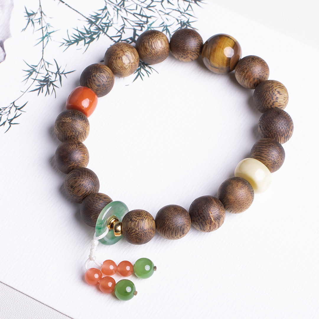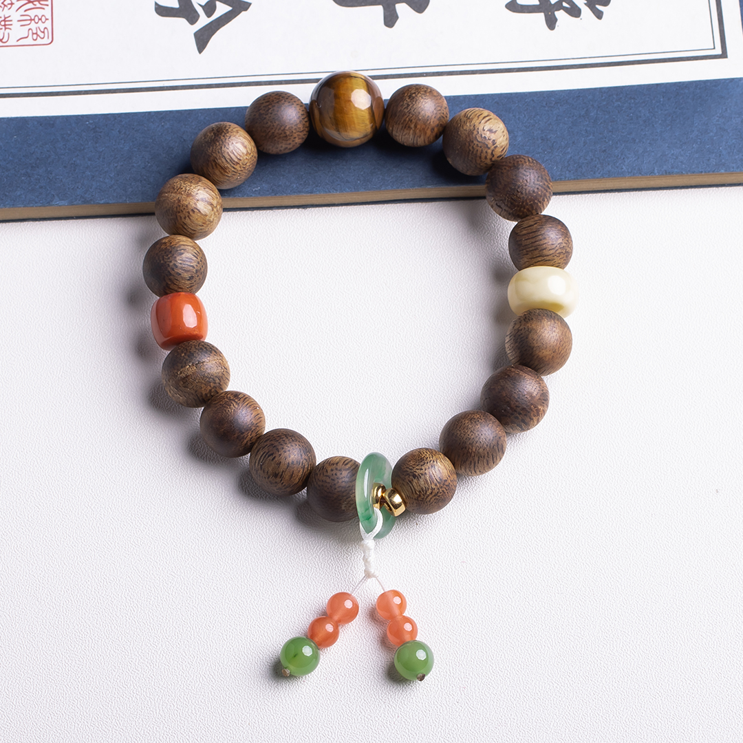 xy0411沉香+南红蜜蜡虎睛石手串.银,天然沉香约10.3mm,原色原味,香味自然清甜,南红蜜蜡虎睛石碧玉,一枚冰飘花的平安扣连接弟子珠流苏,款式新颖时尚,上手显个性,吉祥好运。