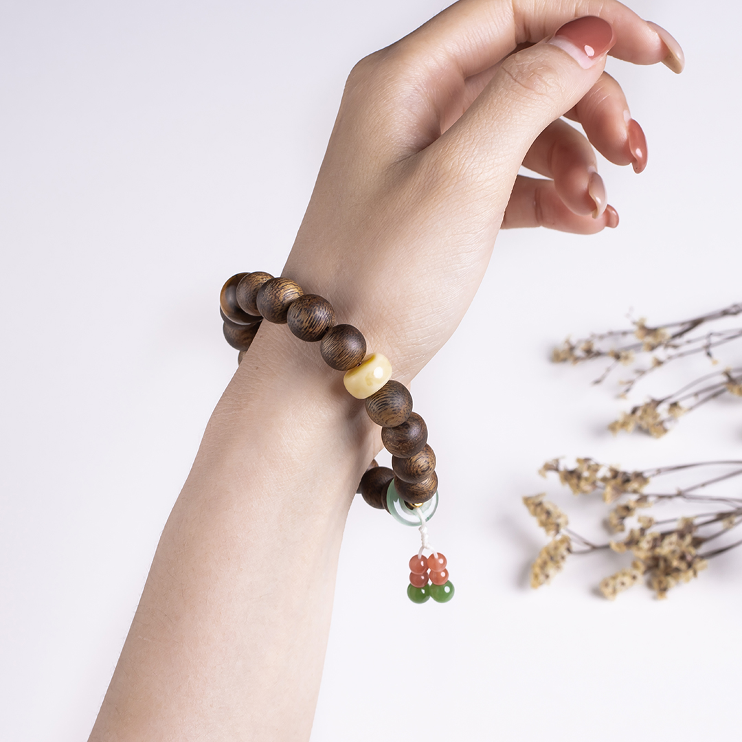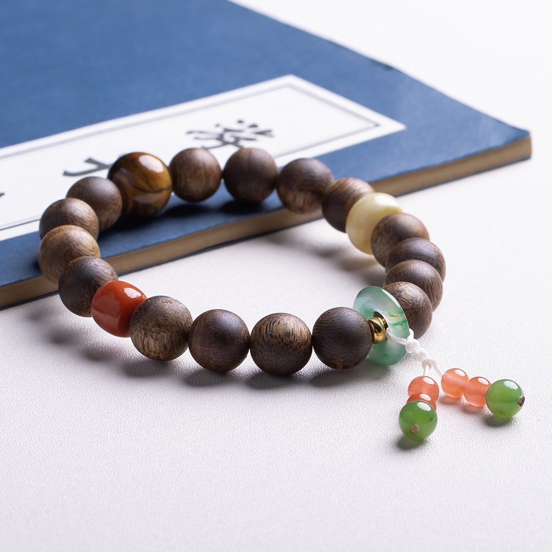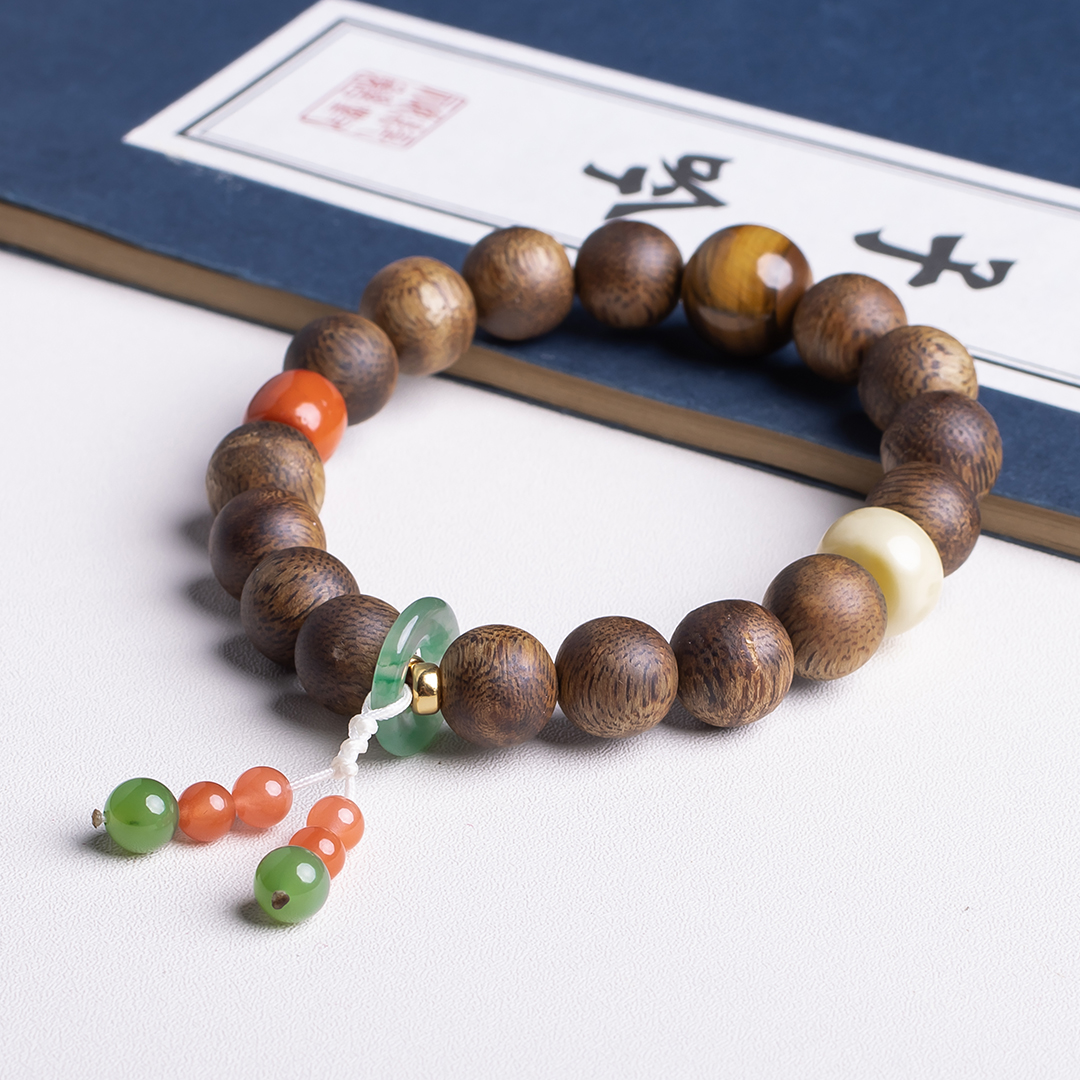 xy0411沉香+南红蜜蜡虎睛石手串.银,天然沉香约10.3mm,原色原味,香味自然清甜,南红蜜蜡虎睛石碧玉,一枚冰飘花的平安扣连接弟子珠流苏,款式新颖时尚,上手显个性,吉祥好运。