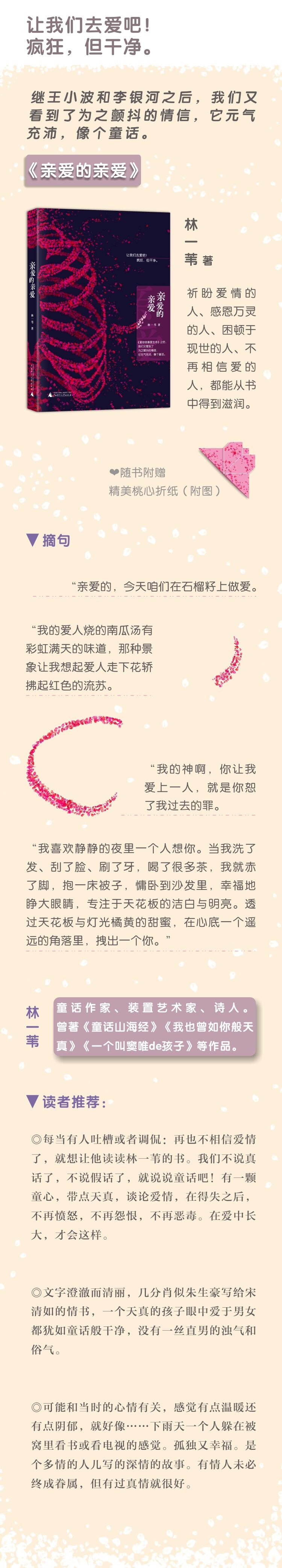林一苇从对爱人的渴慕和思念写起,以情书、日记、散文、诗歌、童话等形式充沛地表现了爱情百转千回的各种面貌,或蜜里调油或深切动人。然,后续又延展出对亲人、世人,对自然和世界的爱与情谊。近代作品中,继沈从文写给张兆和、王小波写给李银河的情信后,这是又一部让人很难忘却的关于爱情绮丽而深刻样貌的作品。