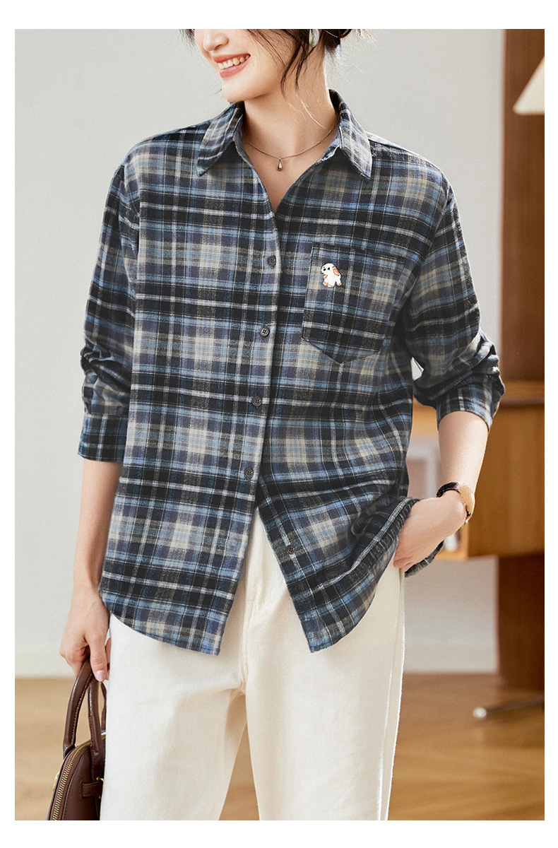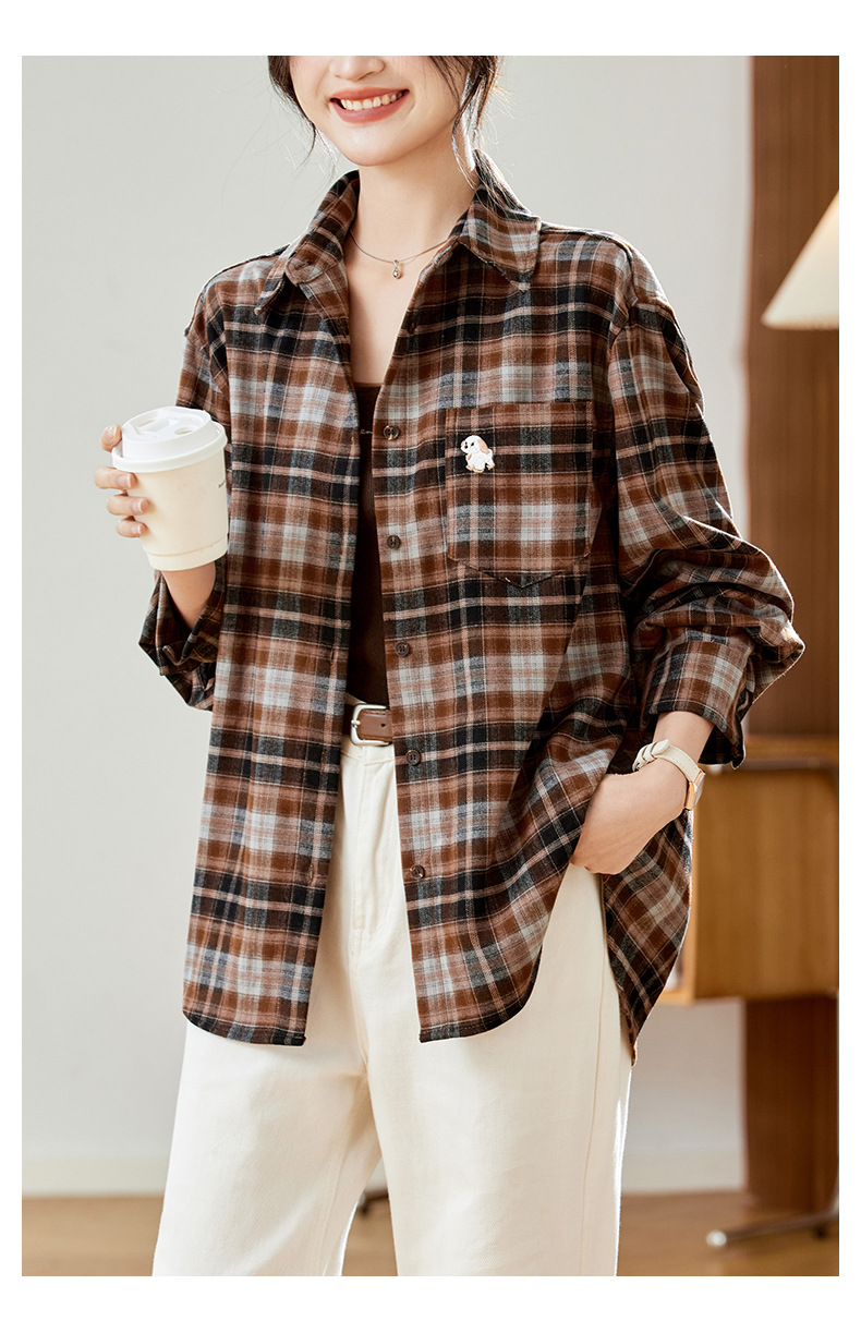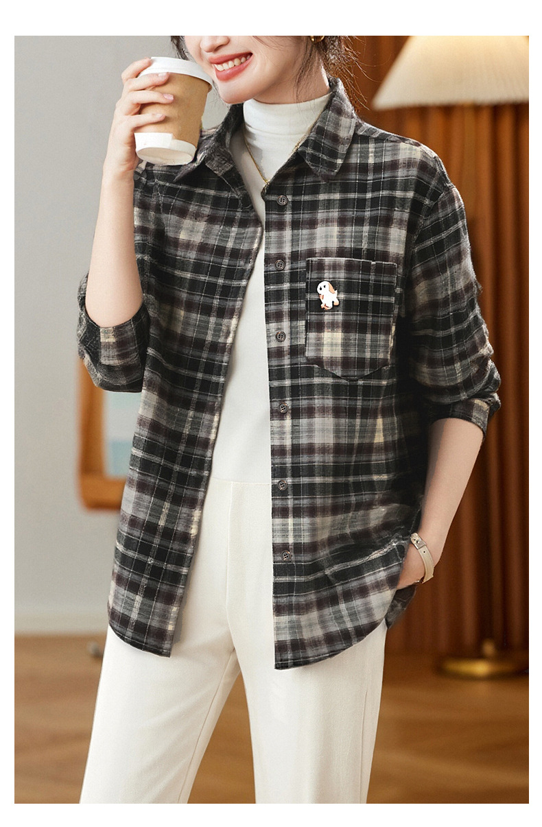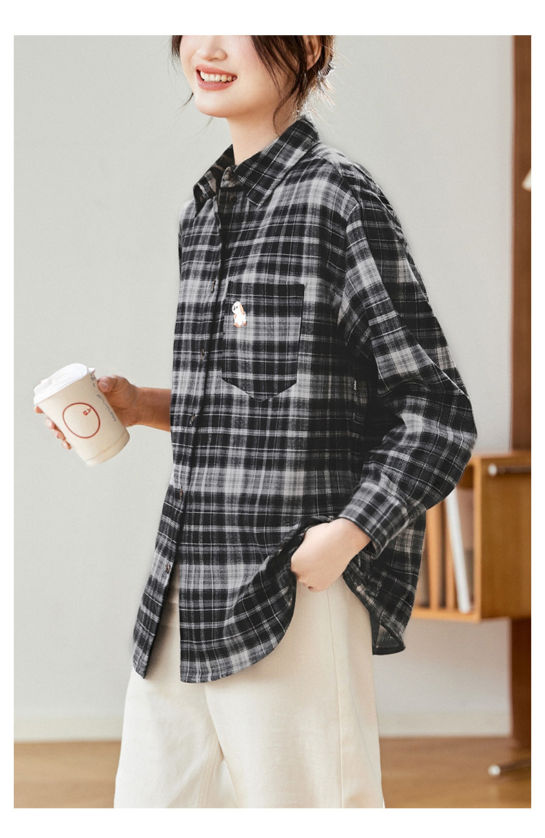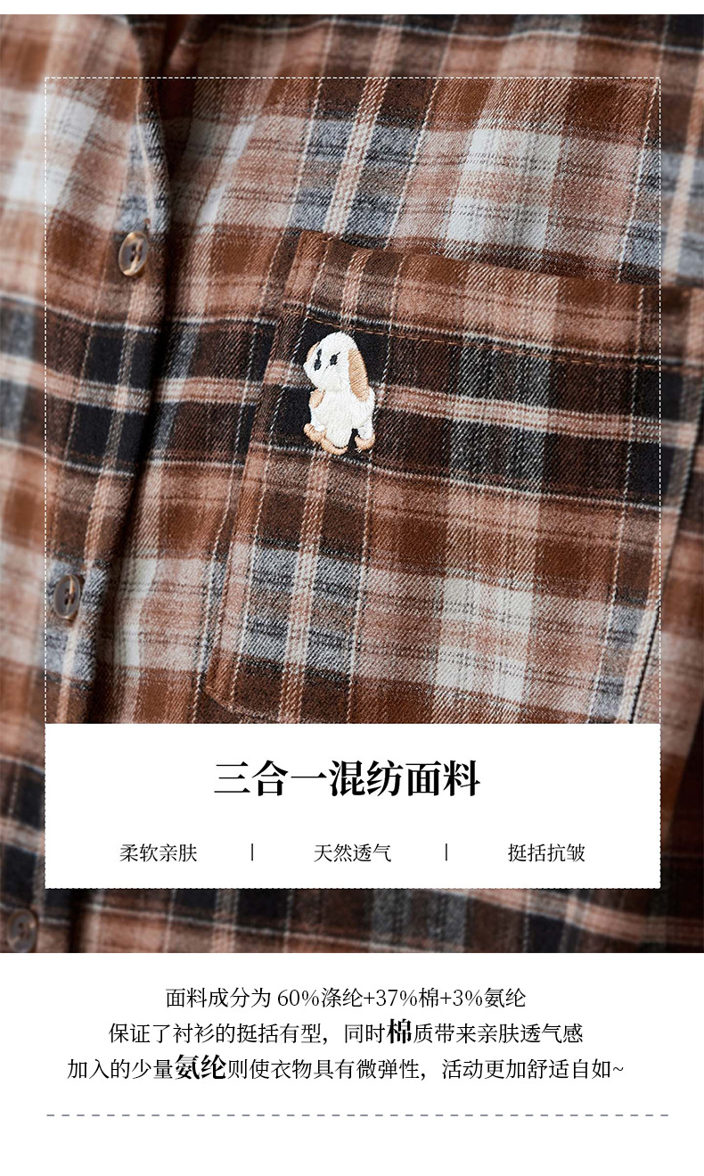 馥迦休闲百搭小狗刺绣磨毛格子衬衫