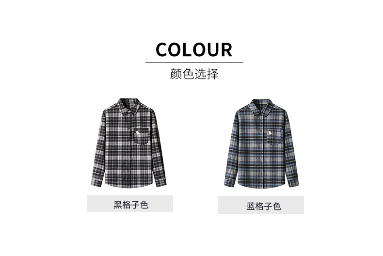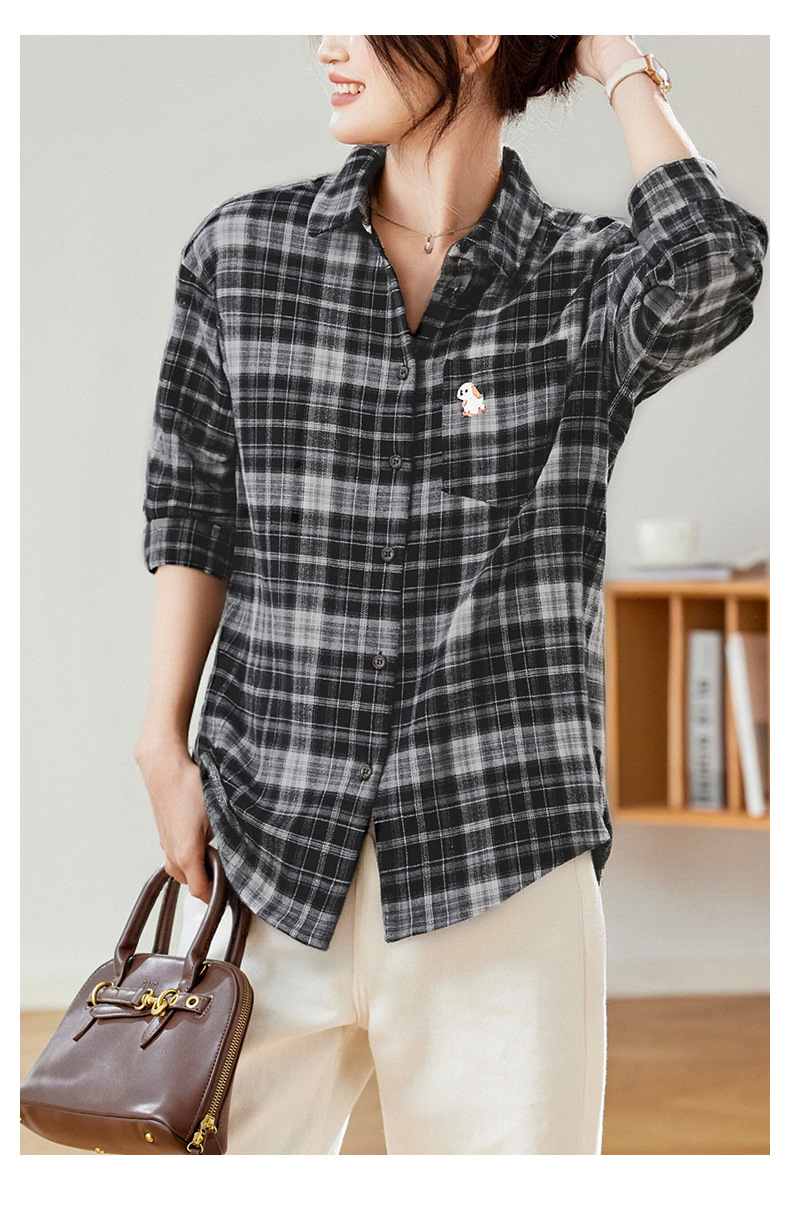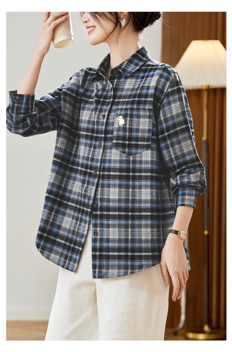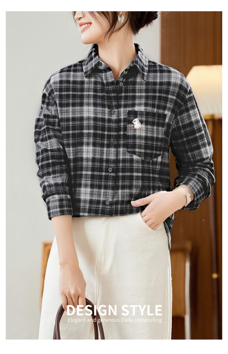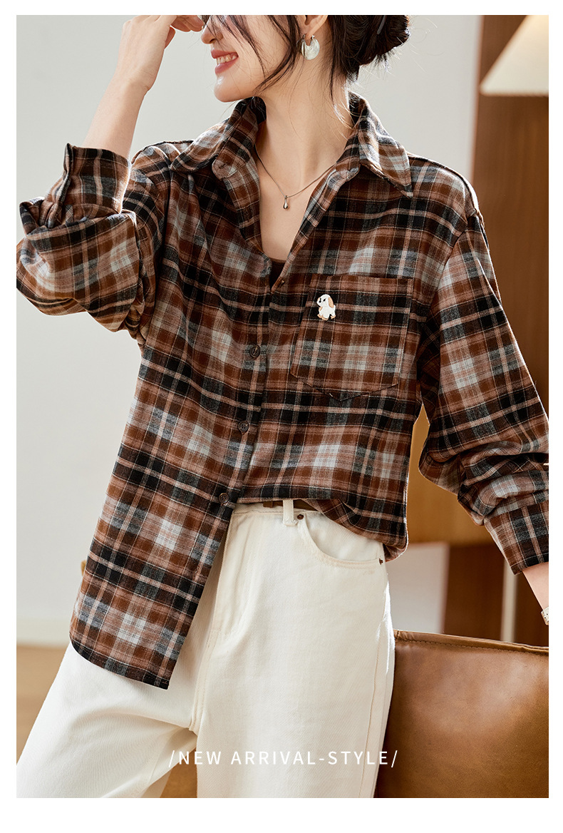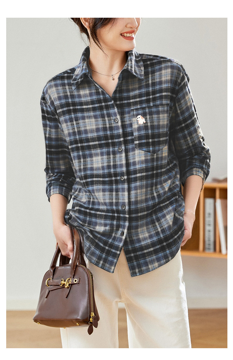 馥迦休闲百搭小狗刺绣磨毛格子衬衫