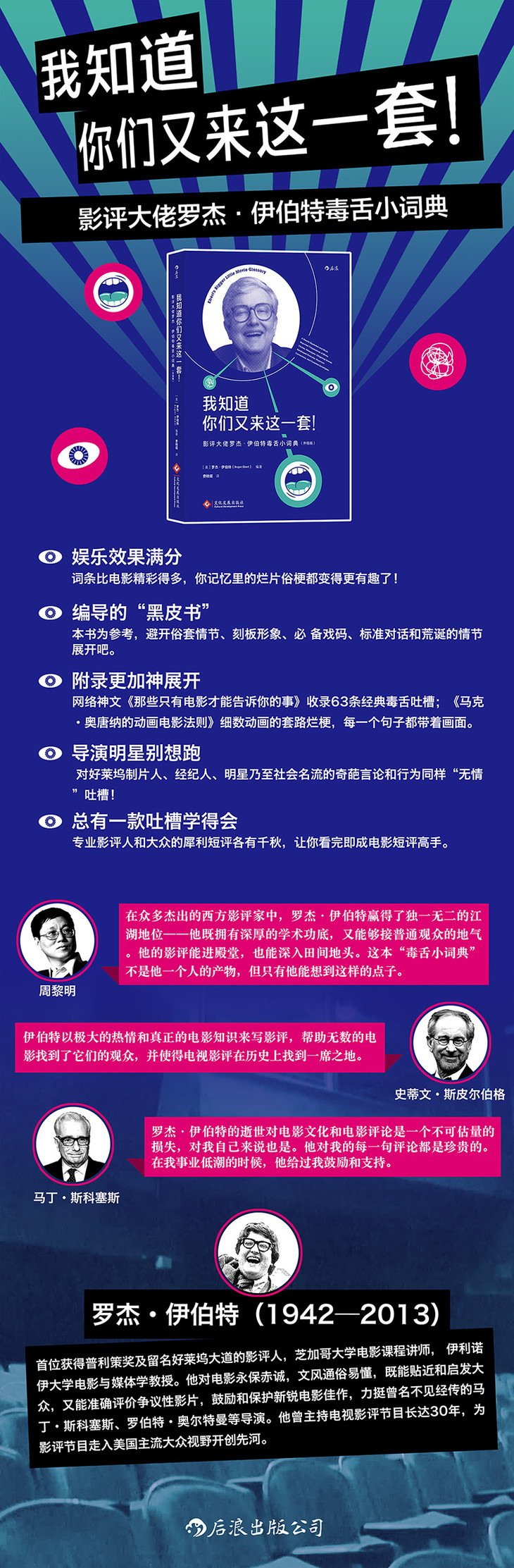 在众多杰出的西方影评家中,罗杰·伊伯特赢得了独一无二的江湖地位——他既拥有深厚的学术功底,又能够接普通观众的地气。他的影评能进殿堂,也能深入田间地头。这本“毒舌小词典”不是他一个人的产物,但只有他能想到这样的点子。