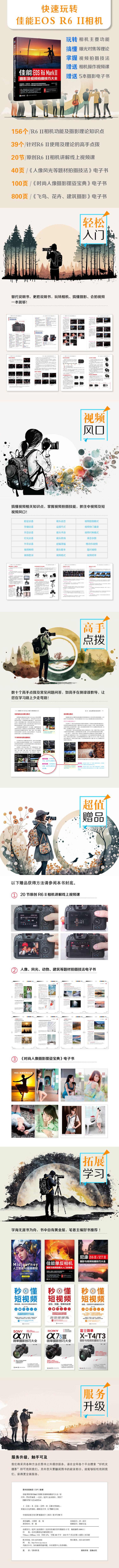 本书讲解了佳能EOSR6MarkⅡ相机的各项实用功能、曝光技巧及在各类题材中的实拍技巧等,让读者先学习相机结构、菜单功能,再接着学习曝光功能、器材等方面的知识,最后学习生活中常见的题材拍摄技巧,从而迅速上手佳能EOSR6MarkⅡ。随着短视频和直播平台的发展,越来越多的人开始使用相机录视频、做直播,因此,本书专门通过数章内容讲解了拍摄短视频需要的器材、需要掌握的参数功能、镜头运用方式,以及使用佳能EOSR6MarkⅡ相机拍摄视频的基本操作与菜单设置,让读者紧跟潮流玩转新媒体。相信通过本书的学习,读者可以全面掌握佳能EOSR6MarkⅡ相机的拍摄功能,既能拍美图,成为朋友圈靓丽的风景线,又能拍好短视频,一举抓住视频创业风口。本书附赠一本人像摆姿摄影电子书(PDF)、一本花卉摄影欣赏电子书(PDF)、一本鸟类摄影欣赏电子书(PDF),以及一本摄影常见题材拍摄技法及佳片赏析电子书(PDF)。