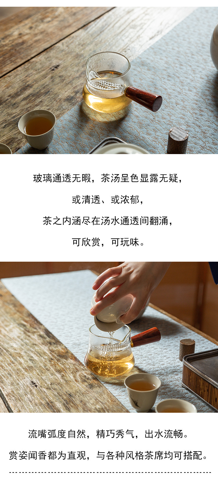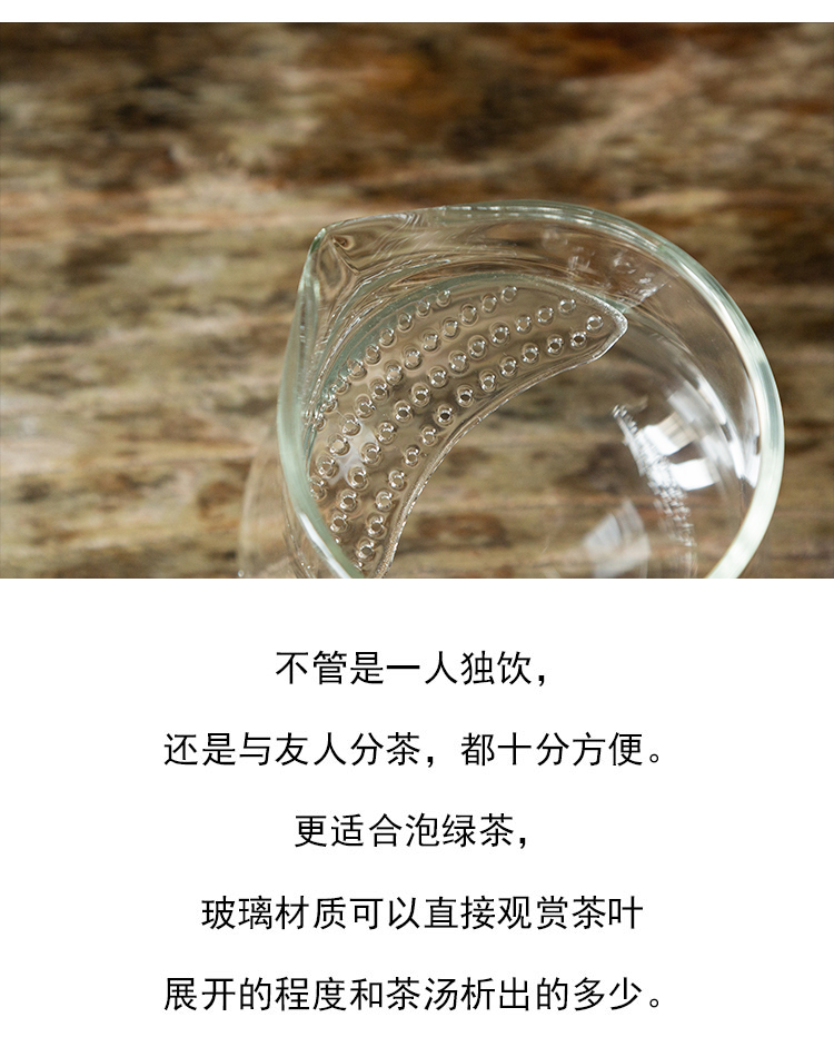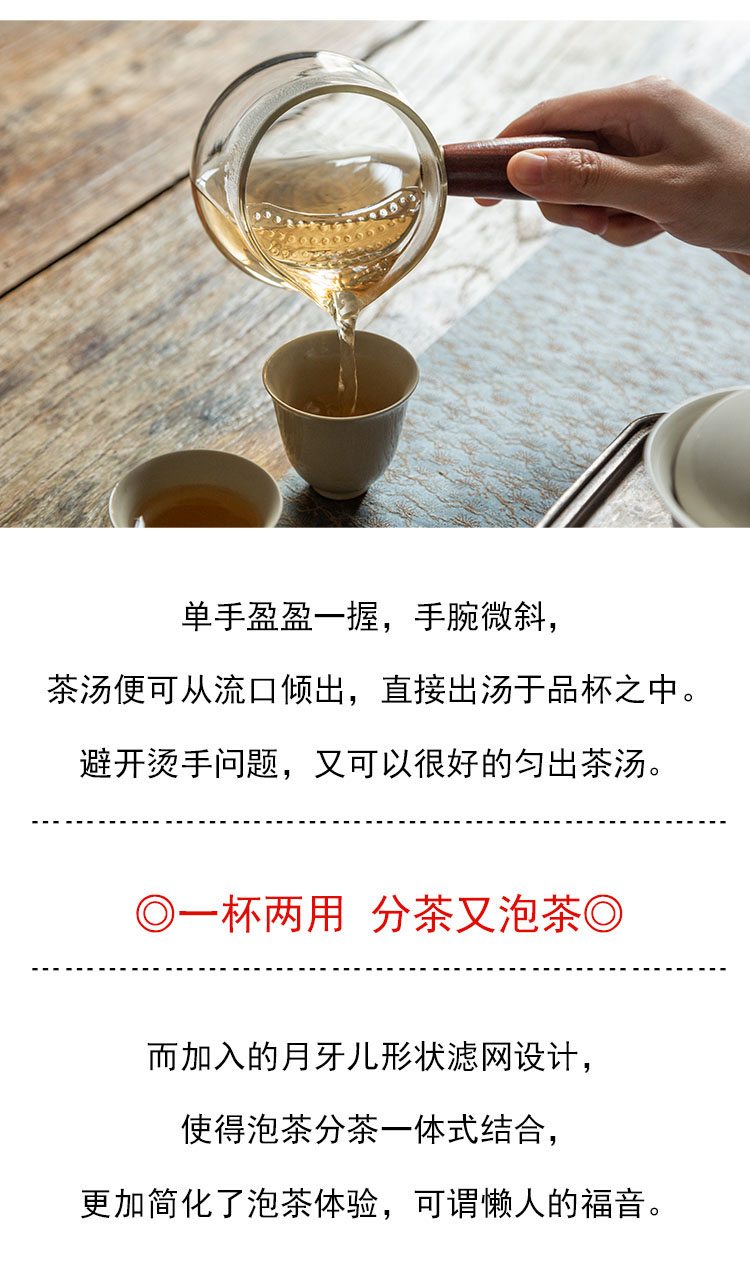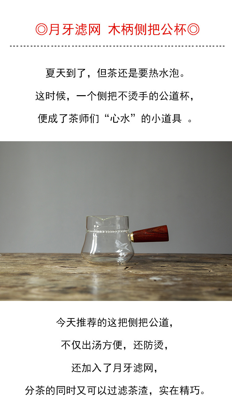 茶香记 耐热玻璃 月牙滤网 木柄侧把公杯 公道杯 茶具 分茶器 好用不烫手