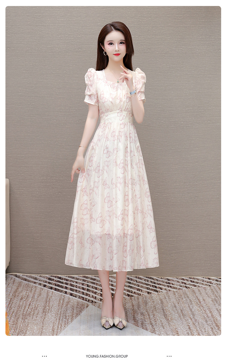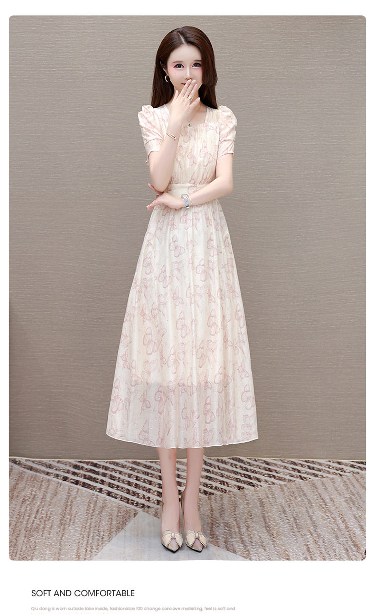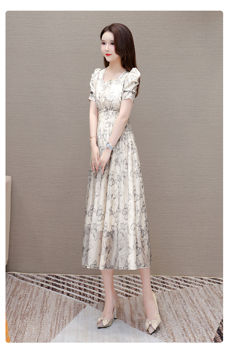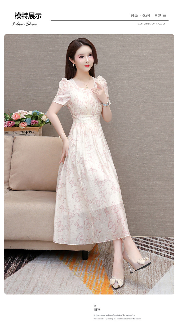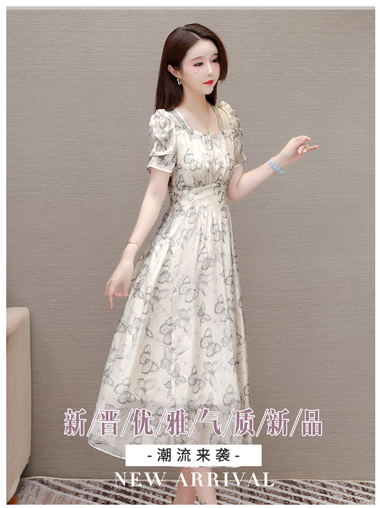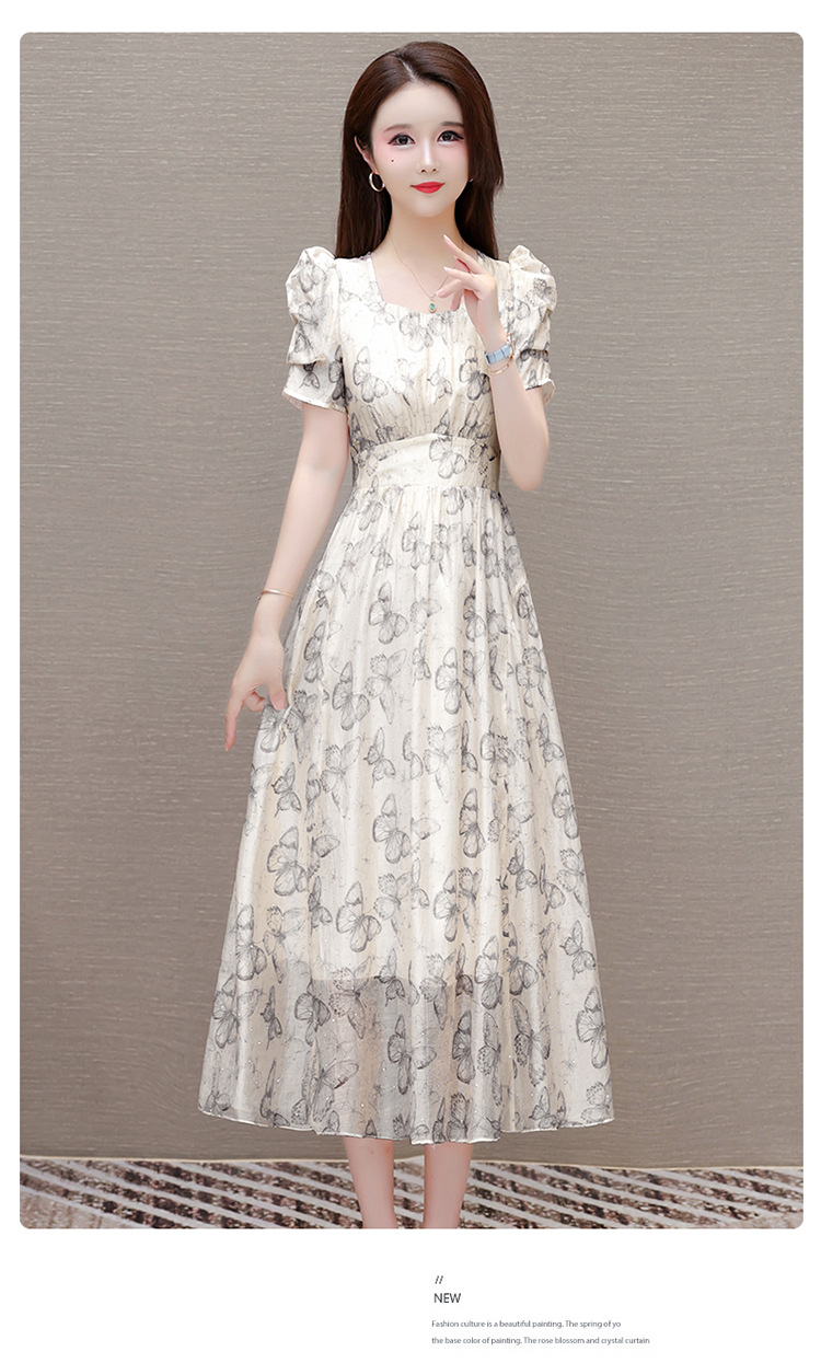 QYMOMS-PA475-L蝴蝶印花长款修身时尚大摆连衣裙24年夏款短袖方领收腰显瘦 商品图0