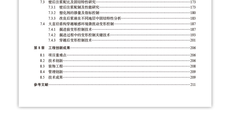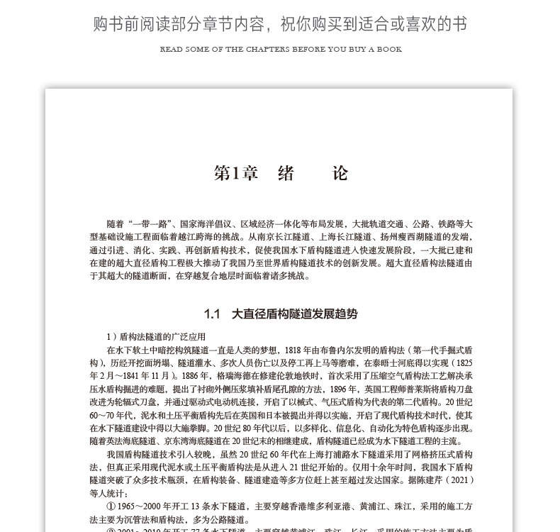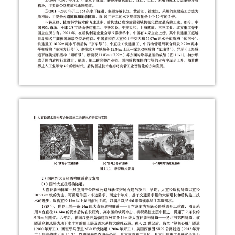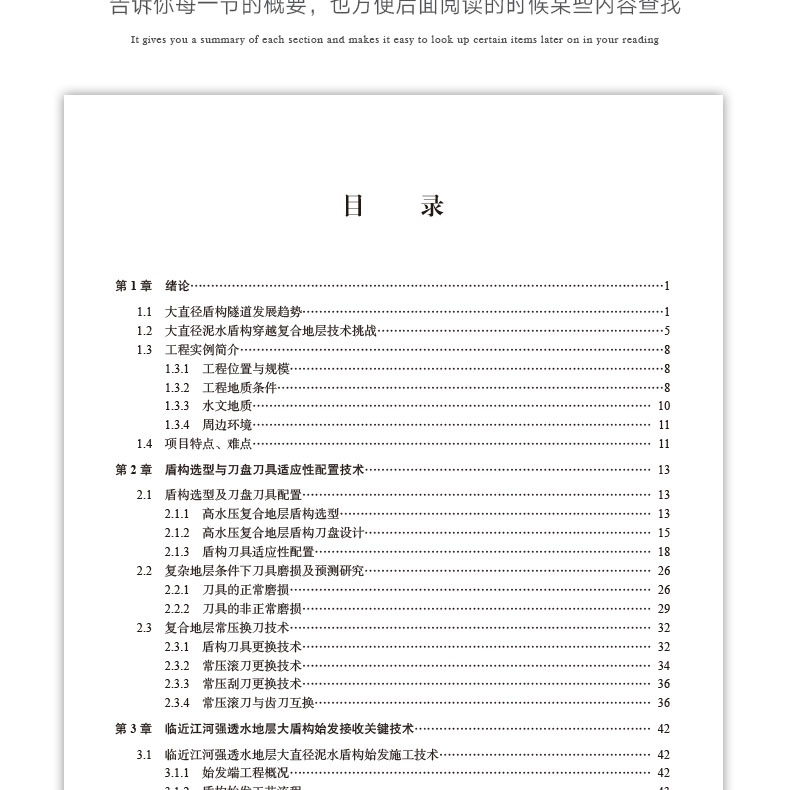 本书内容包括:盾构选型及刀盘刀具配置合理性研究、高水压复合地层盾构开挖面稳定性分析、大直径泥水盾构同步快速施工及复合式衬砌力学性能分析、大直径泥水盾构穿越复杂环境变形控制材料研发、大直径盾构穿越敏感环境微扰动变形控制研究、大直径盾构工作井深基坑始发、接收等关键技术。由于本书总结了大直径泥水盾构土岩复合地层施工技术,因此,对从事隧道建设的技术人员而言,本书极具参考价值。 该工程常压下盾构滚刀、齿刀互换技术在世界上首次应用,为我国交通隧道领域第一座设置双层衬砌的水下隧道,是国内最长的水下交通隧道,也是目前国内最大的“单洞双线”地铁盾构隧道,显著提高了土岩复合地层和复杂困难条件下大型盾构隧道修建技术水平。
