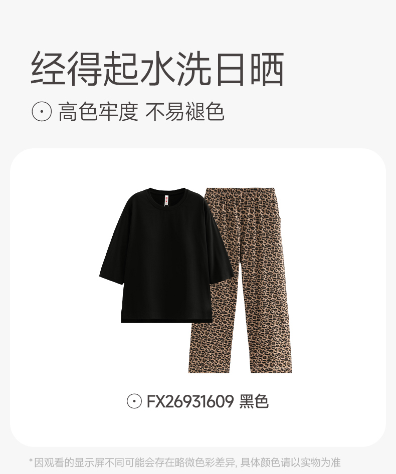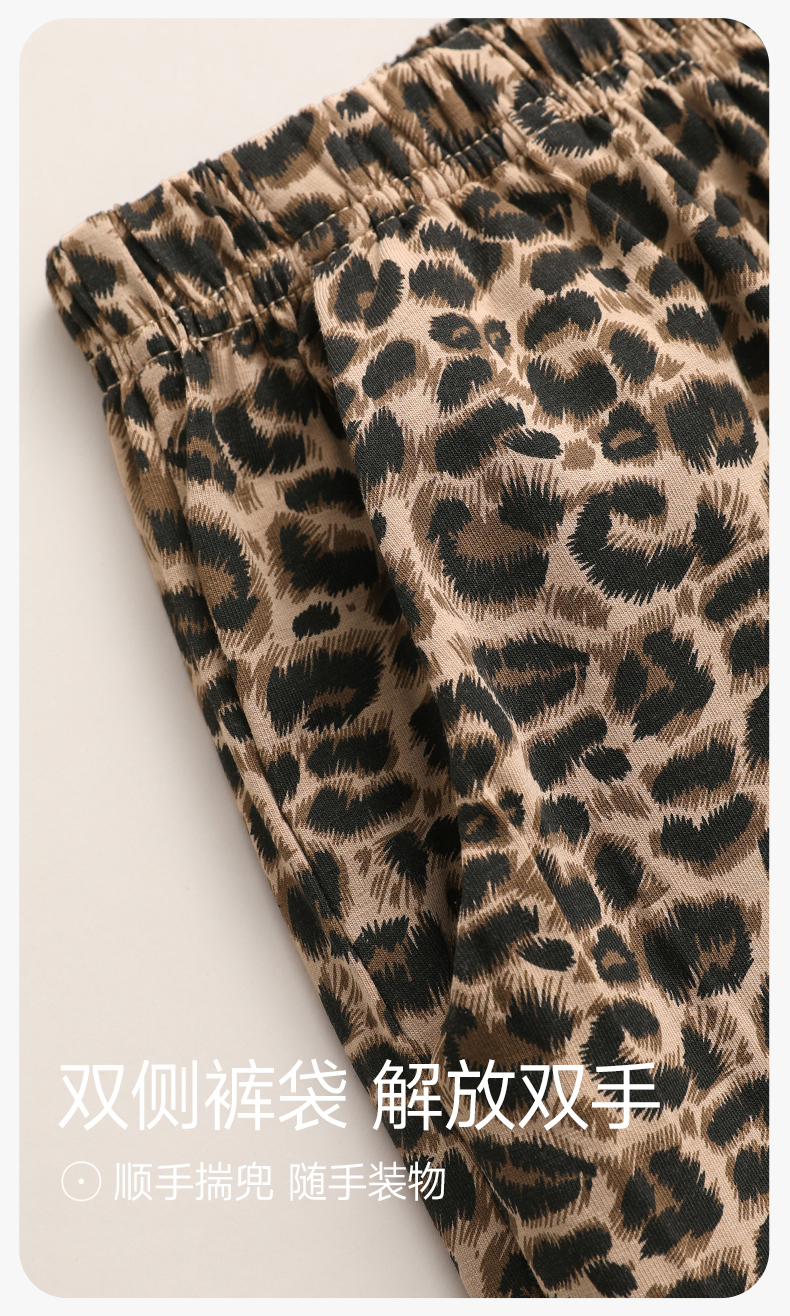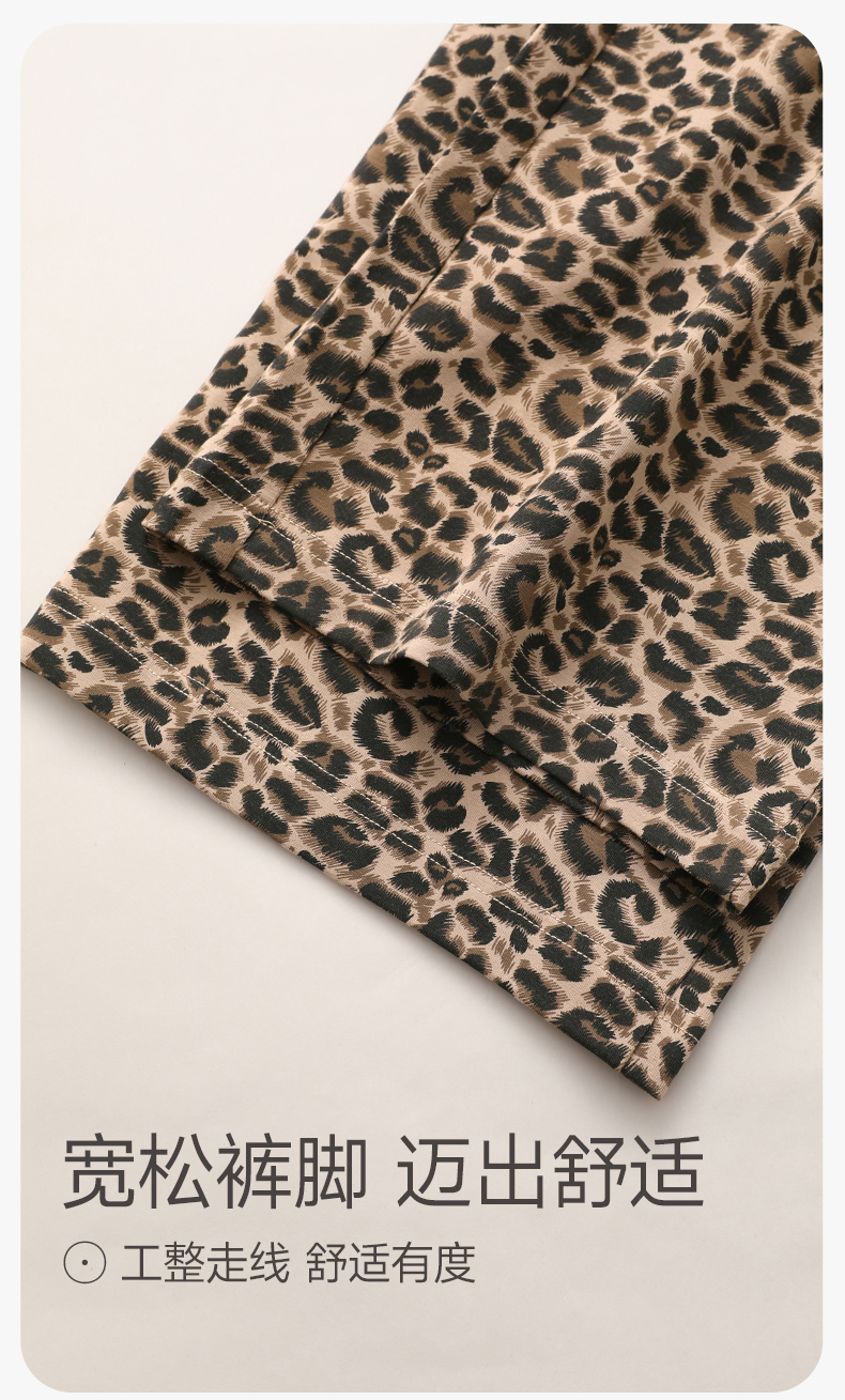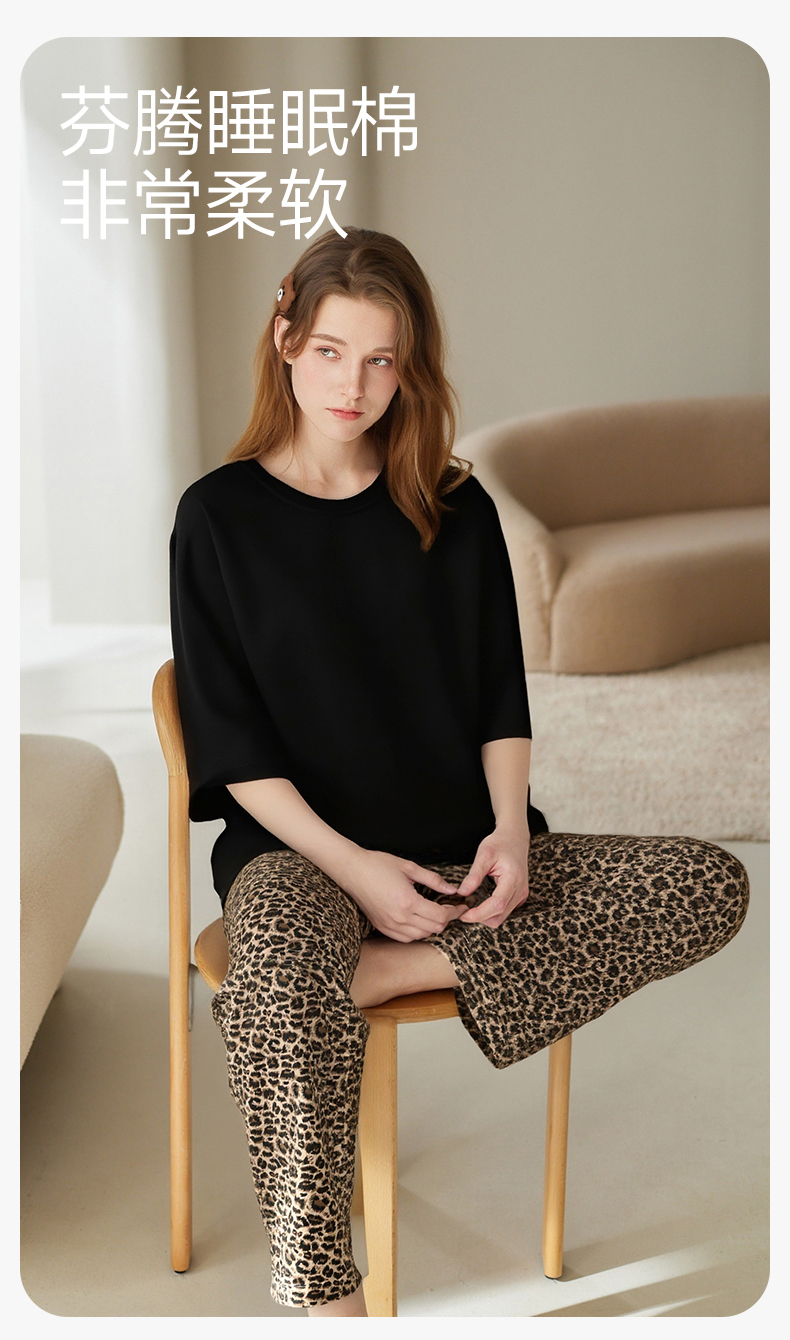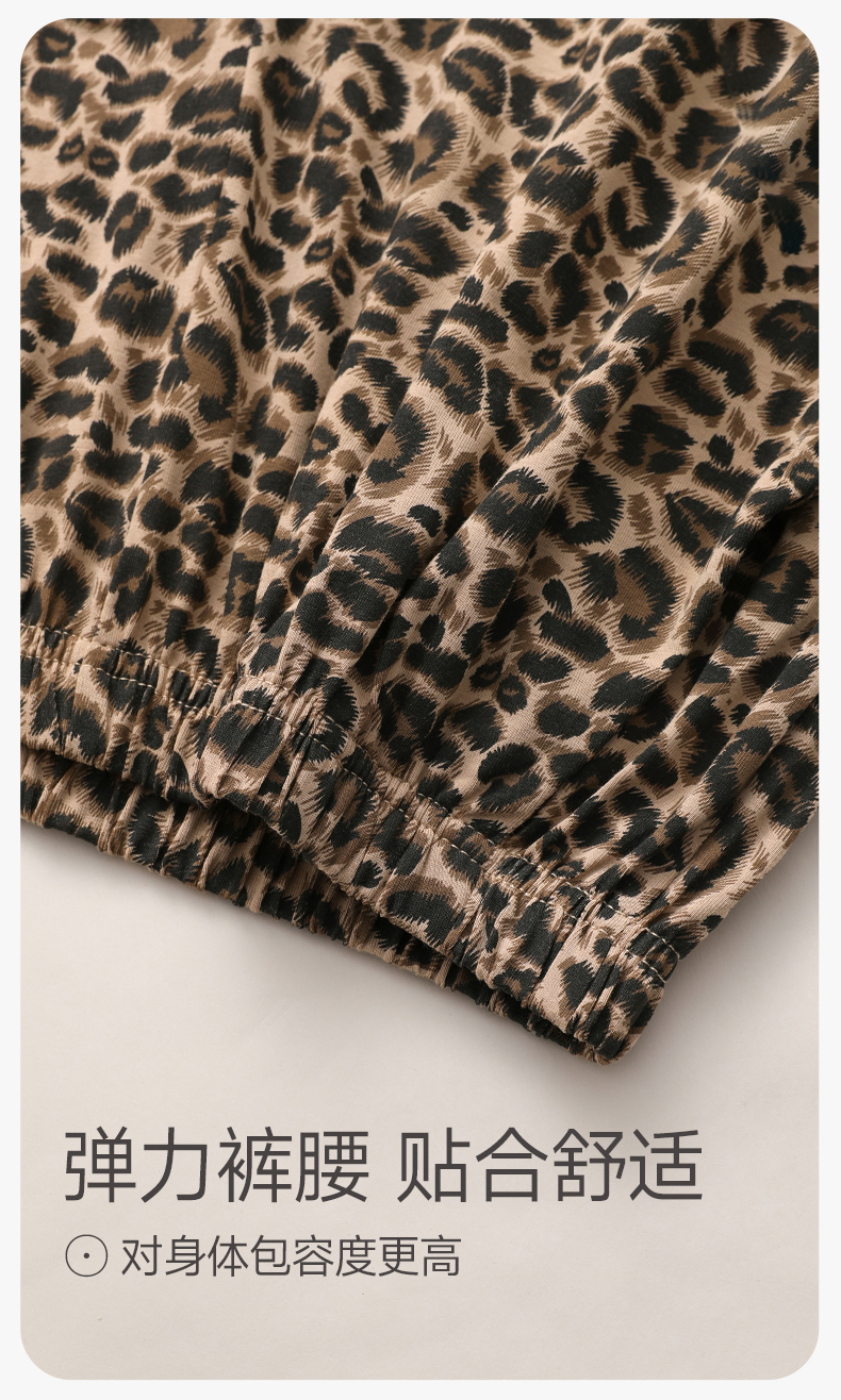 芬腾防凸点女士睡衣春秋季纯棉带胸垫长袖套装豹纹加大码家居服