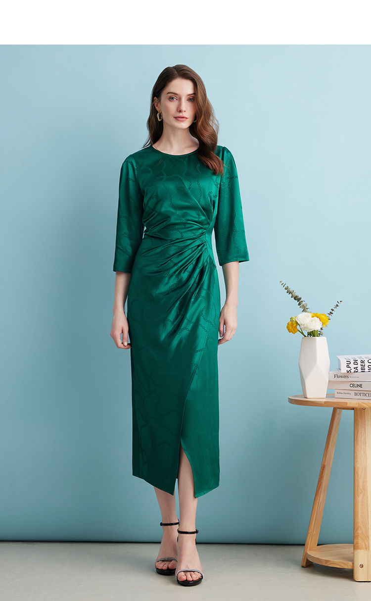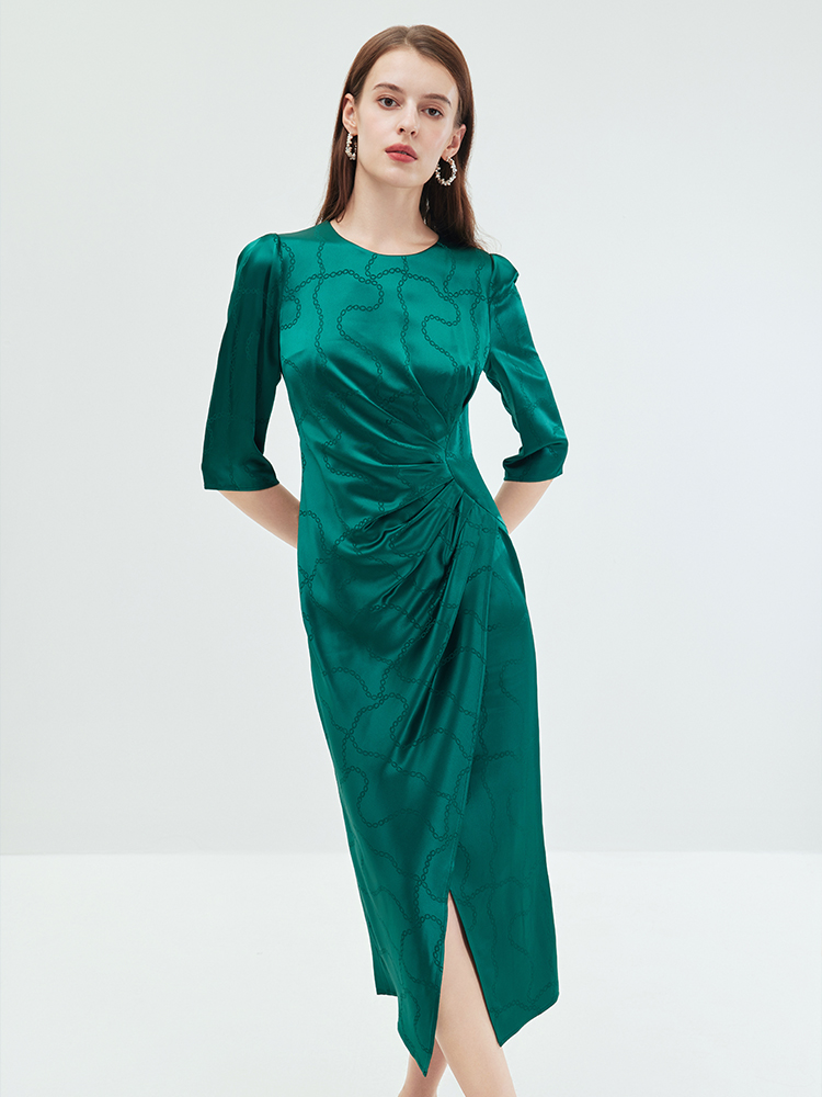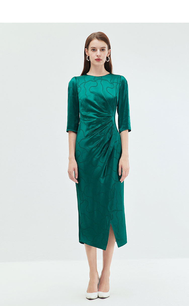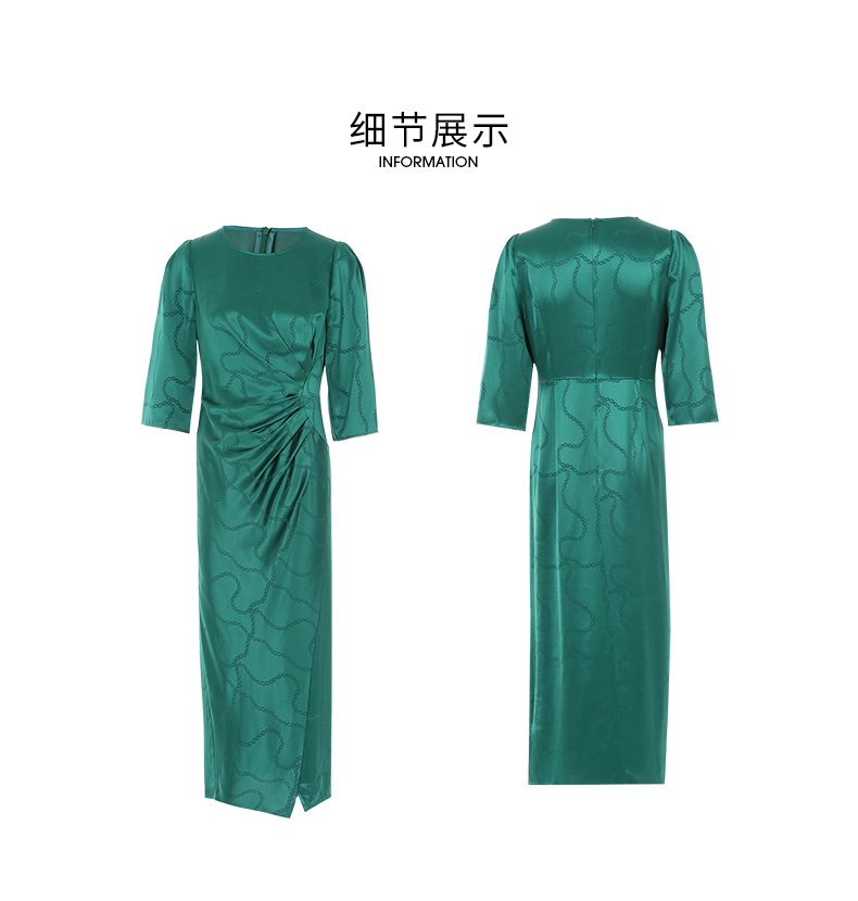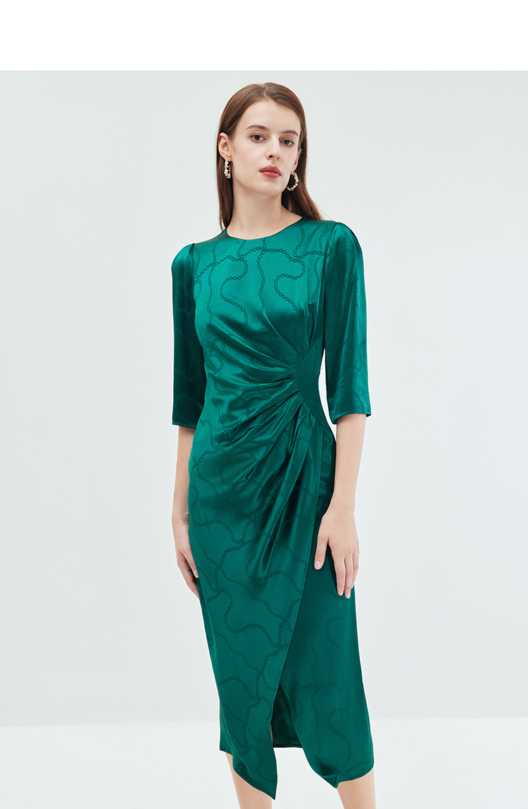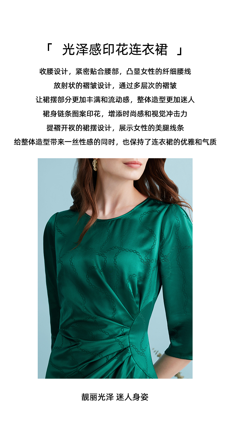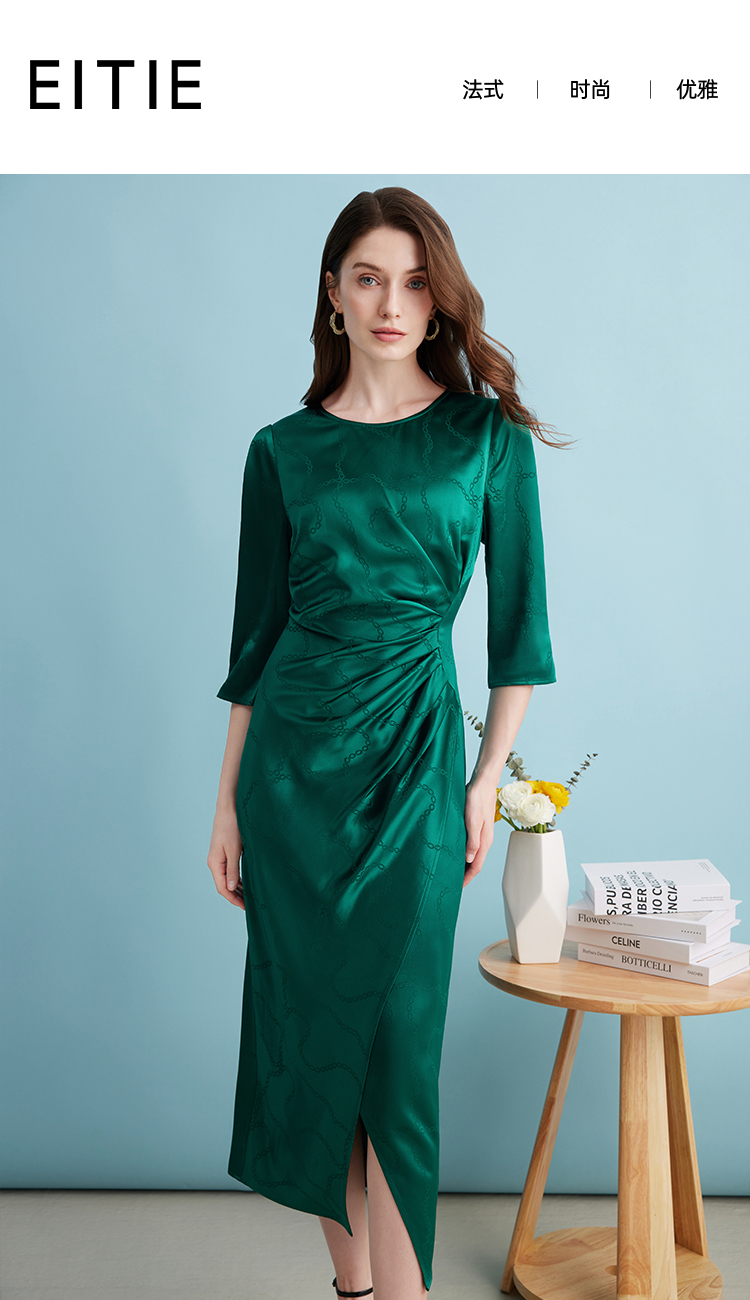 EITIE连衣裙精致大方圆领提褶收腰开叉绿色印花连衣裙秋季新款C2307250