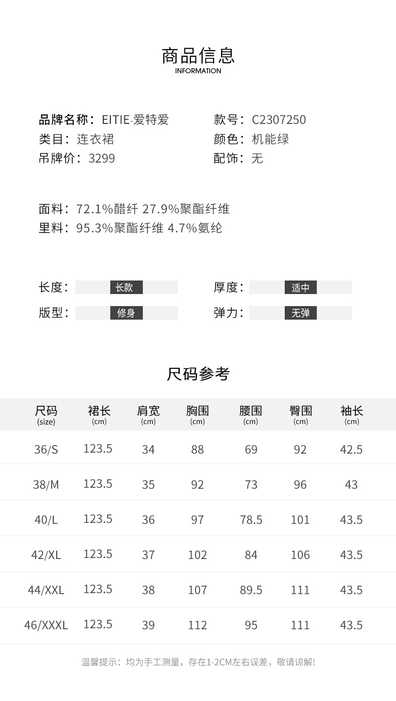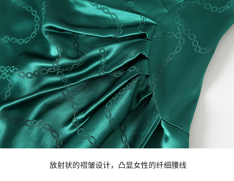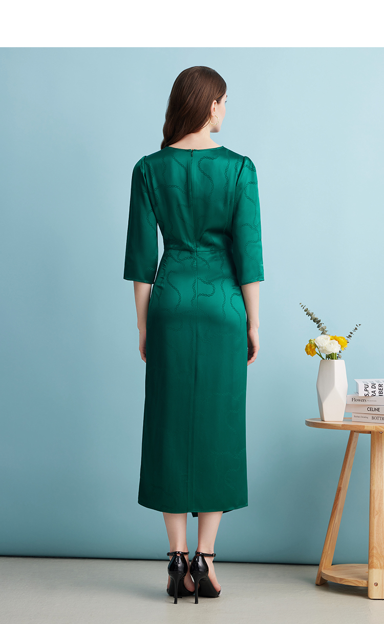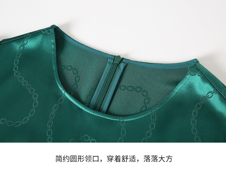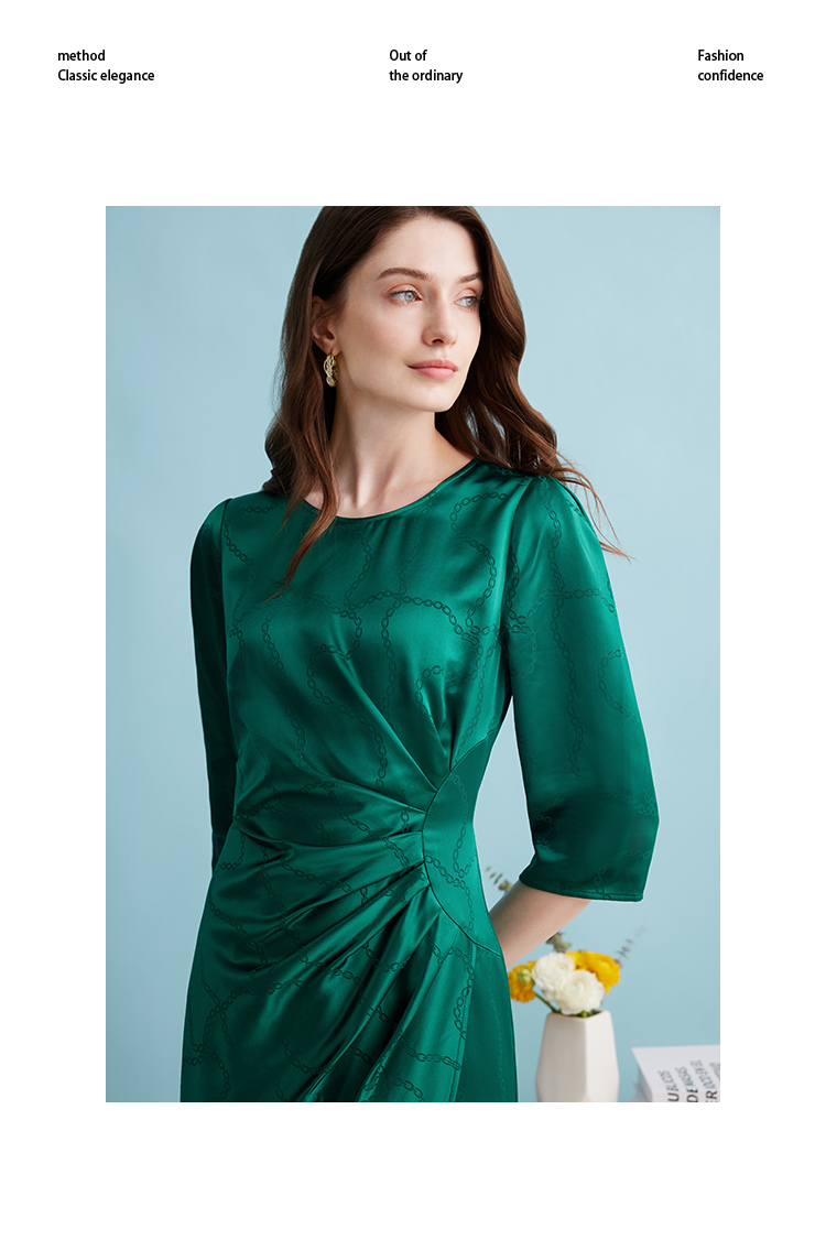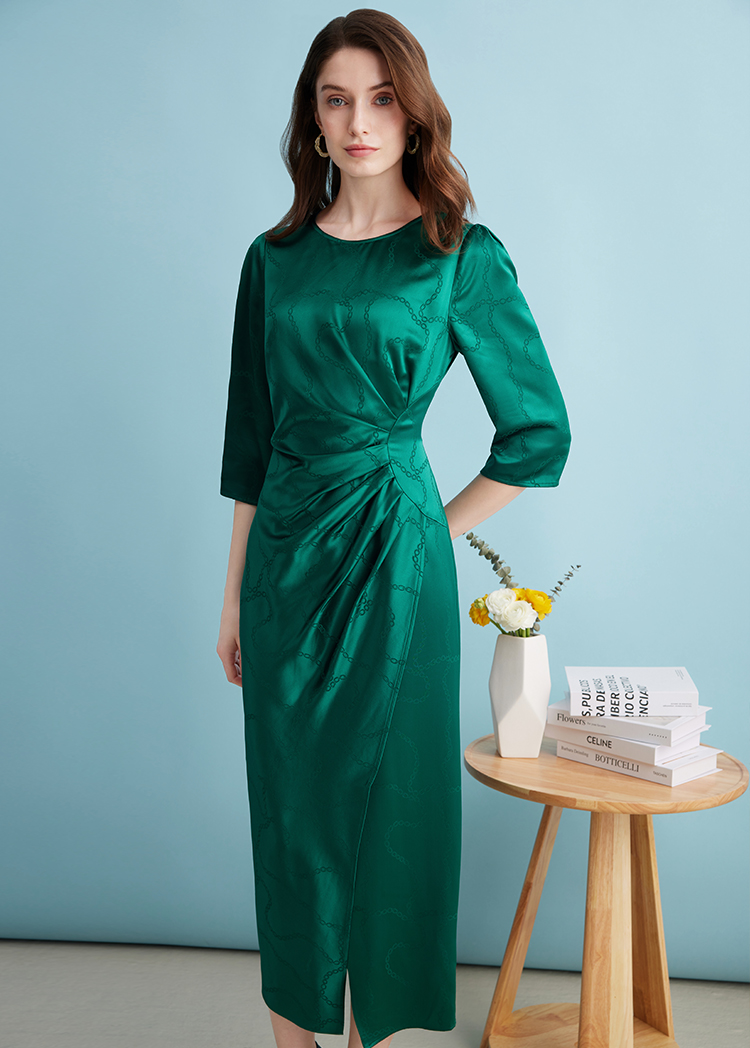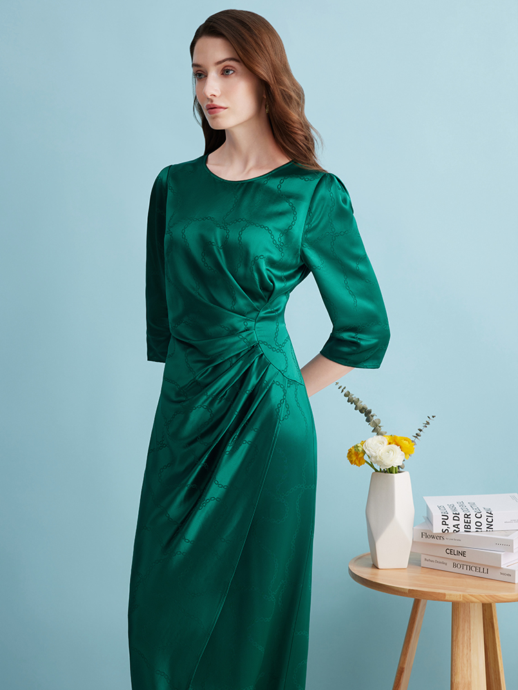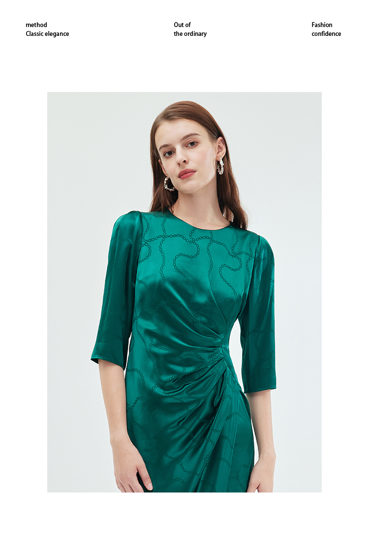 EITIE连衣裙精致大方圆领提褶收腰开叉绿色印花连衣裙秋季新款C2307250