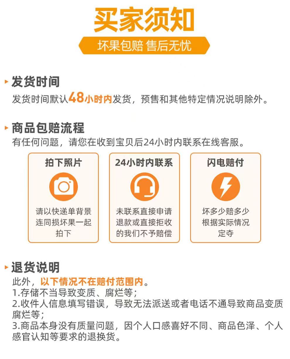特别说明:由于生鲜水果市场价格波动较大,价保时间为:付款成功之后72小时之内联系客服有效,以付款成功的时间为准。