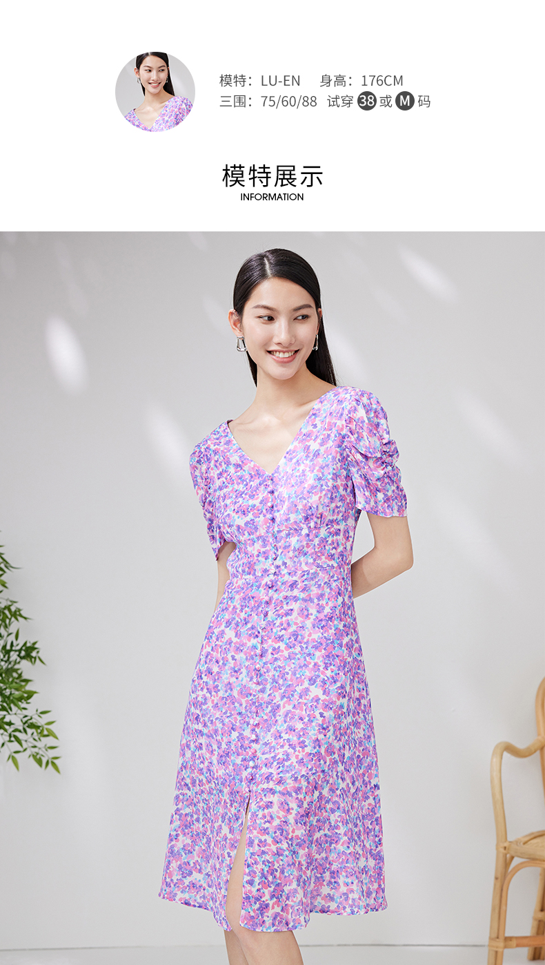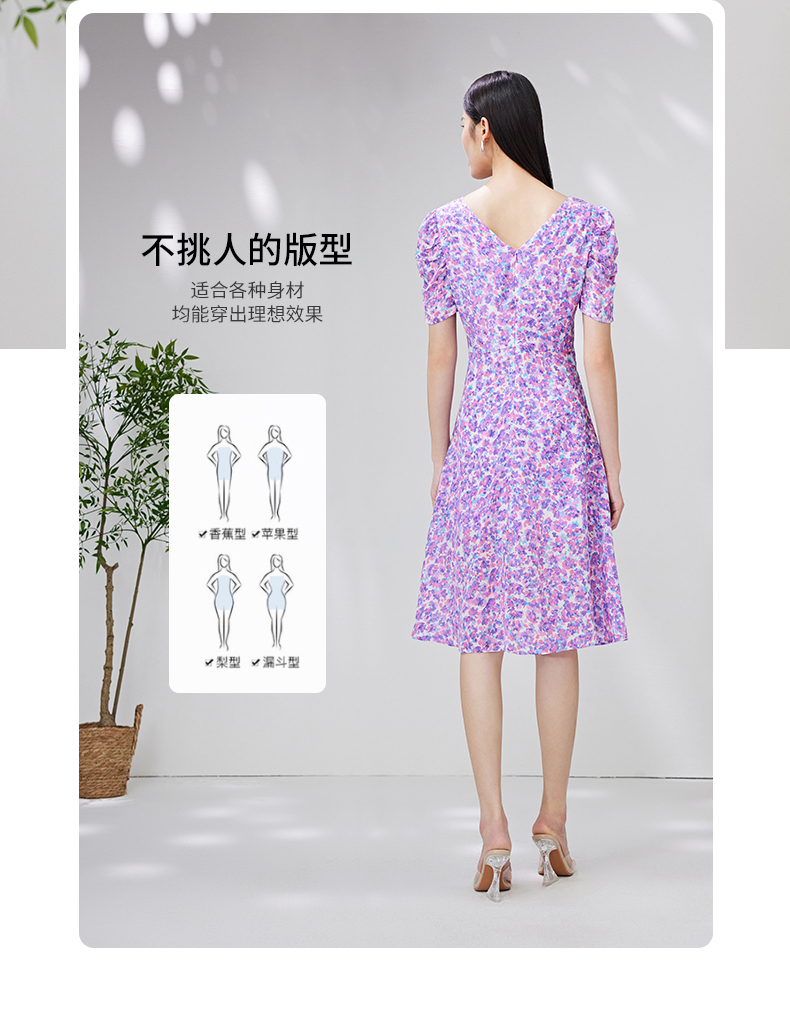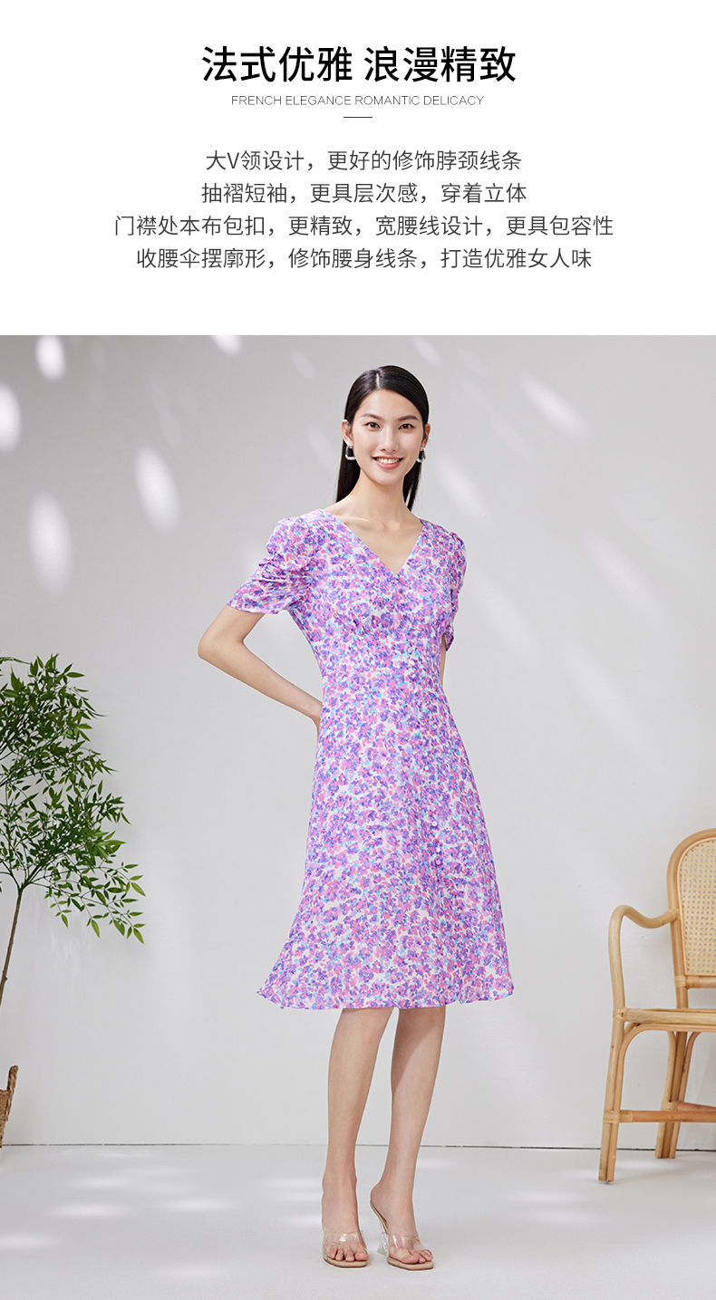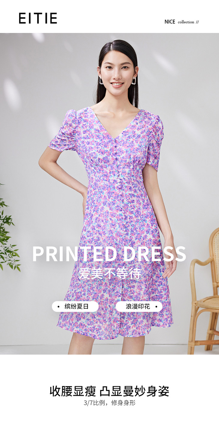 EITIE爱特爱夏款新品优雅V领显瘦高腰舒适泡泡袖印花连衣裙7007753