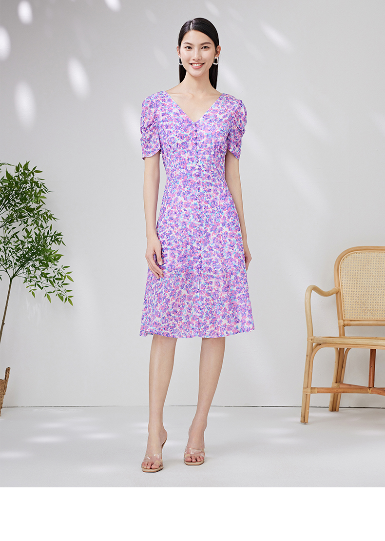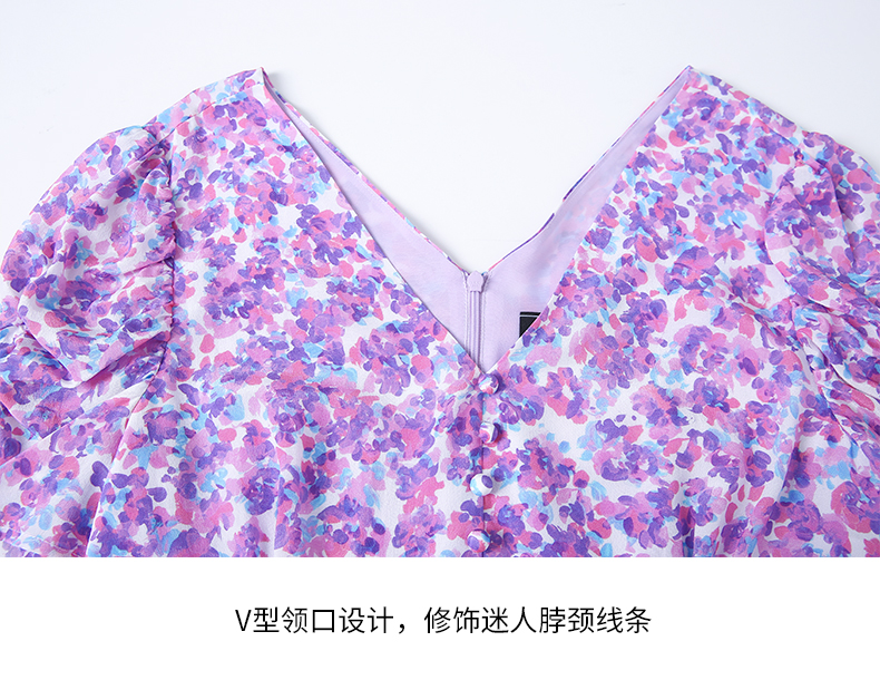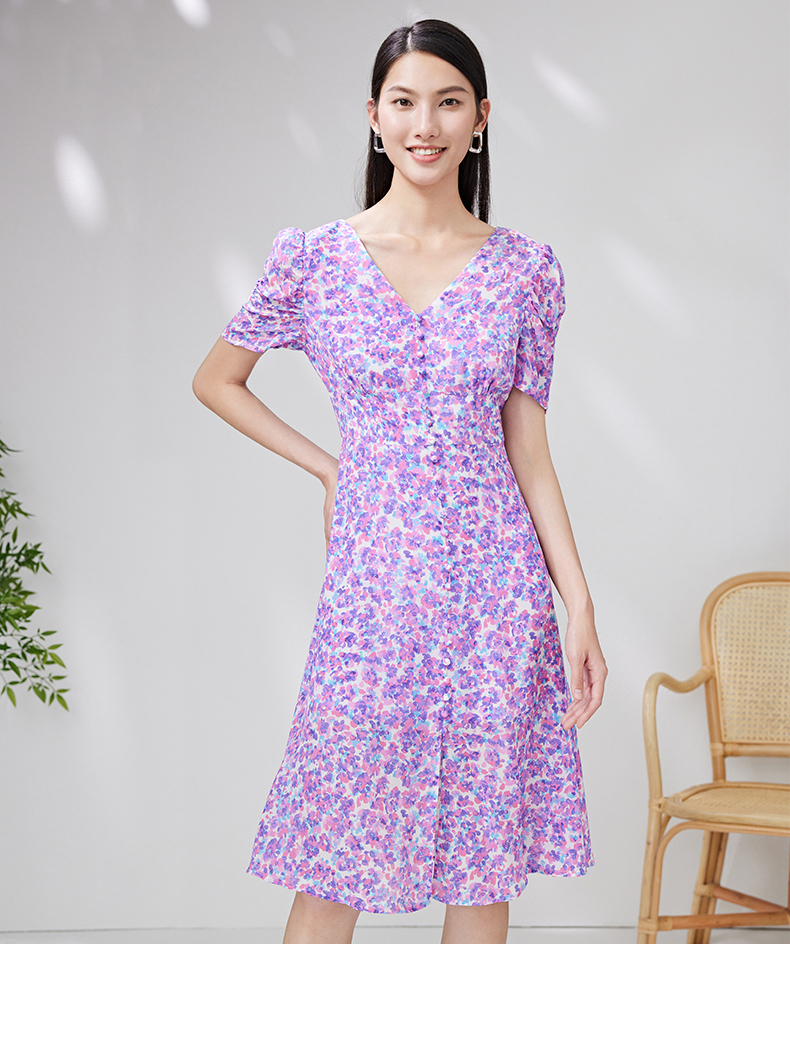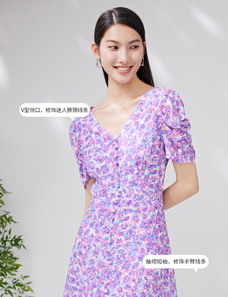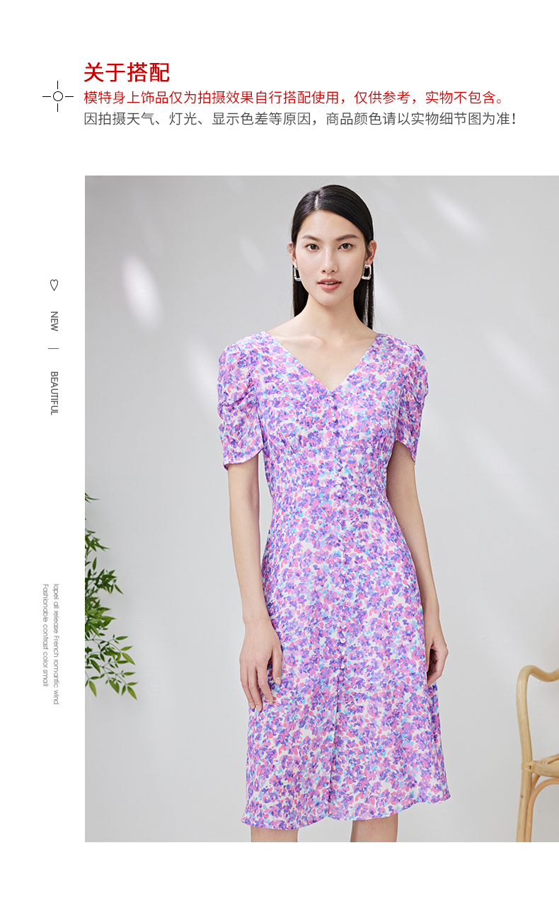 EITIE爱特爱夏款新品优雅V领显瘦高腰舒适泡泡袖印花连衣裙7007753