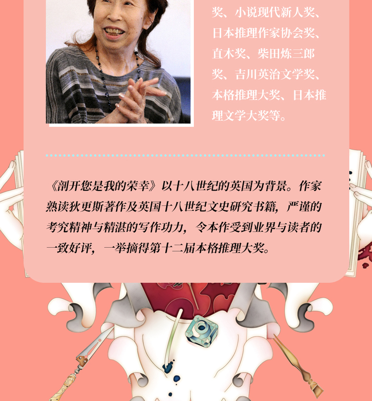 《剖开您是我的荣幸》以十八世纪的英国为背景。作家熟读狄更斯著作及英国十八世纪文史研究书籍,严谨的考究精神与精湛的写作功力,令本作受到业界与读者的一致好评,一举摘得第十二届本格推理大奖。