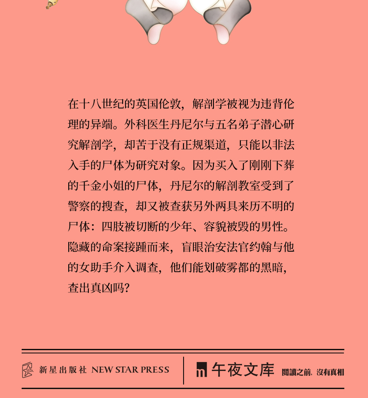 在十八世纪的英国伦敦,解剖学被视为违背伦理的异端。外科医生丹尼尔与五名弟子潜心研究解剖学,却苦于没有正规渠道,只能以非法入手的尸体为研究对象。因为买入了刚刚下葬的千金小姐的尸体,丹尼尔的解剖教室受到了警察的搜查,却又被查获另外两具来历不明的尸体:四肢被切断的少年、容貌被毁的男性。隐藏的命案接踵而来,盲眼治安法官约翰与他的女助手介入调查,他们能划破雾都的黑暗,查出真凶吗?