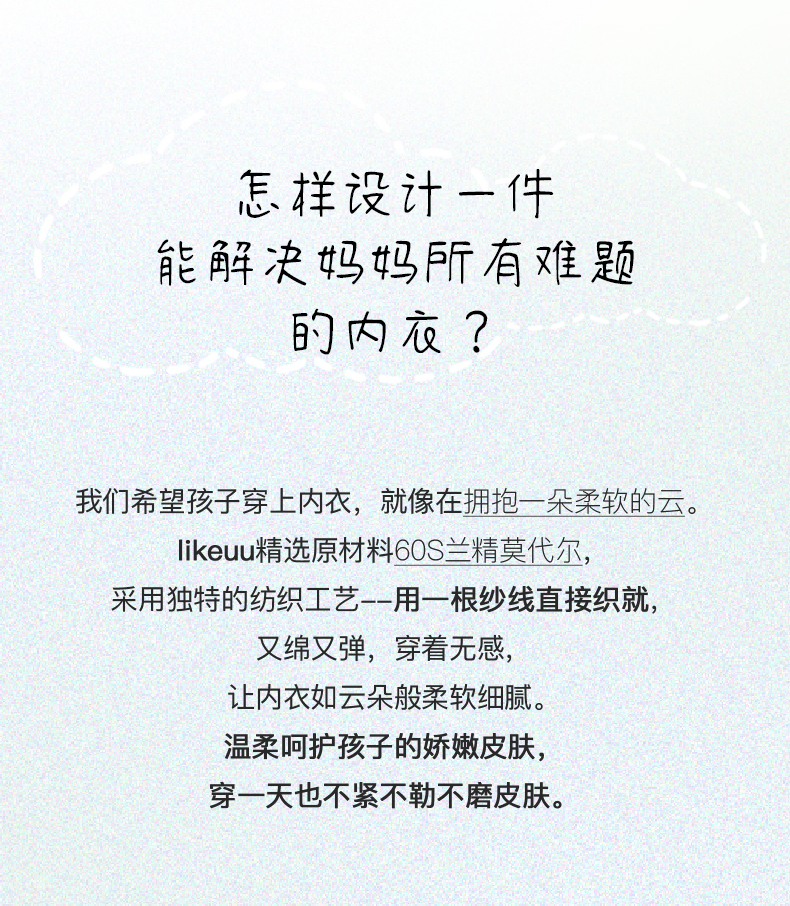 - likeuu是专注于为6~15岁的青少年创造柔软、无束缚的成长体验,以好奇心为灵感的成长发育期贴身衣物品牌。likeuu的产品覆盖内衣、内裤、保暖衣、家居服、运动等品类。
