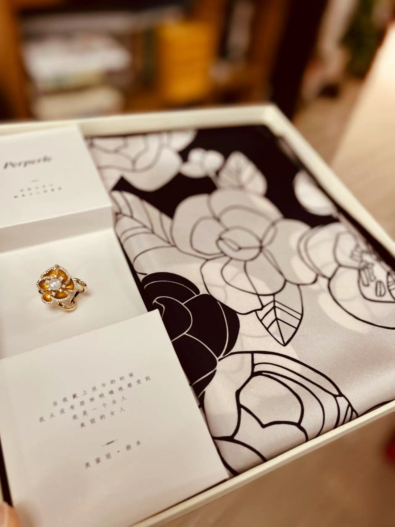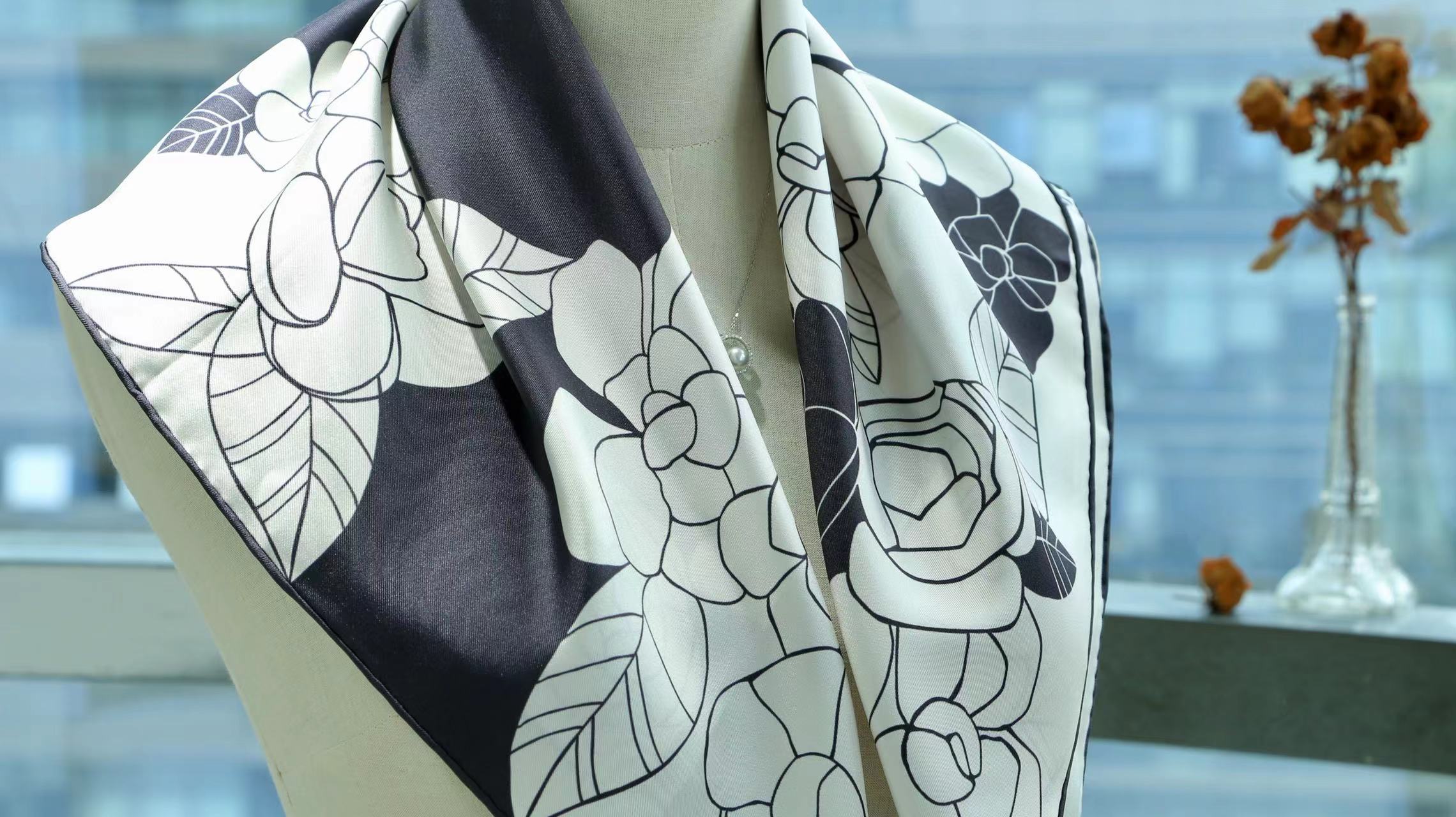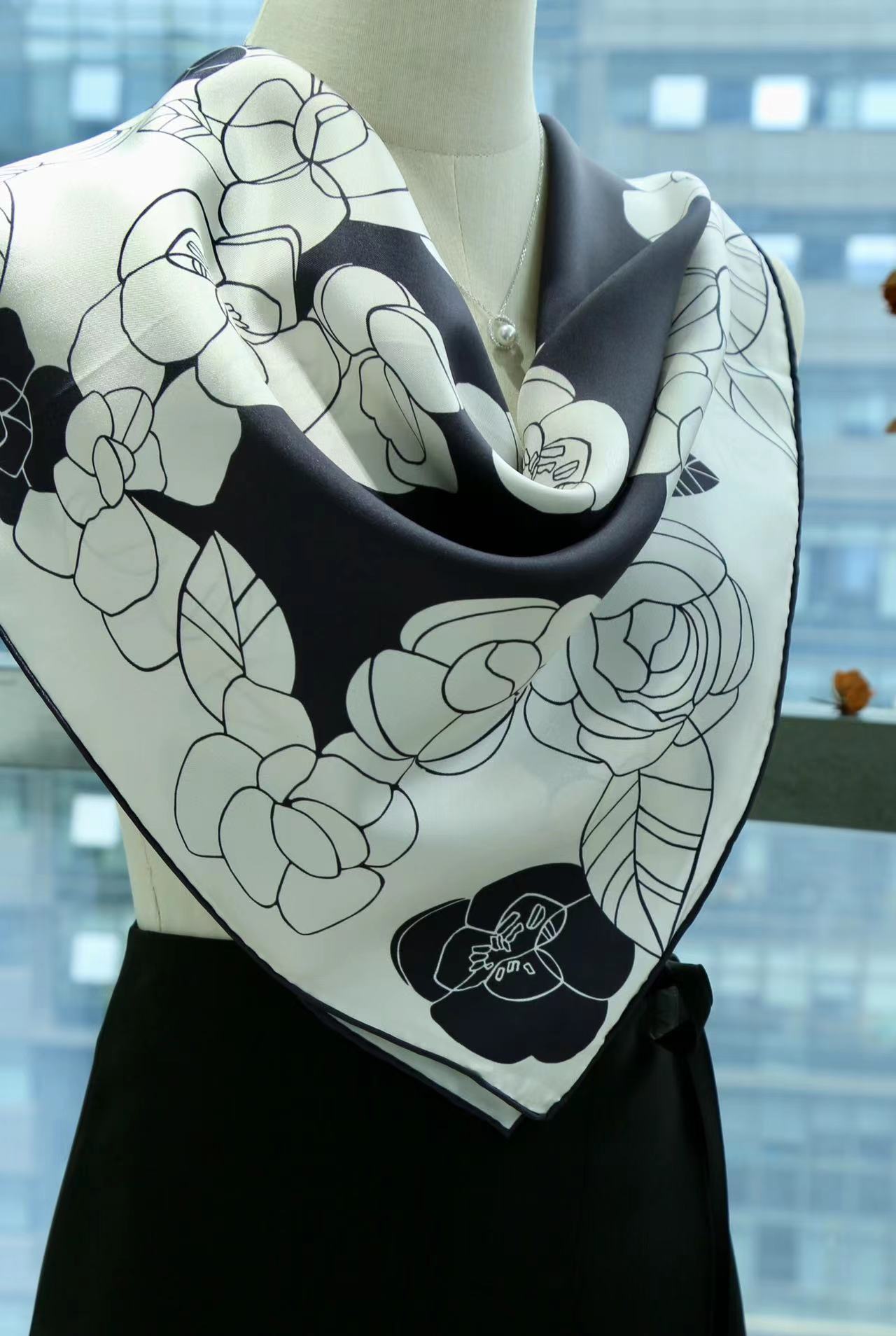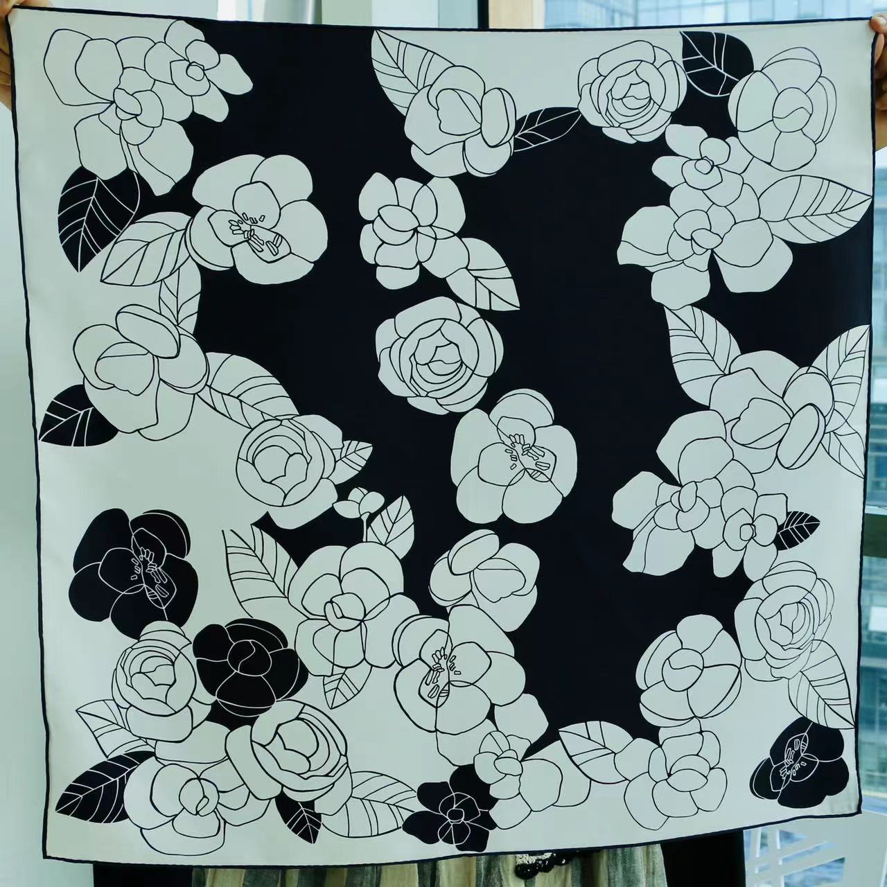 【甄珠贝·花卉系列】70*70cm斜纹绸【黑白山茶花】丝巾和【山茶花】丝巾扣