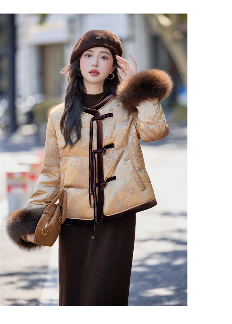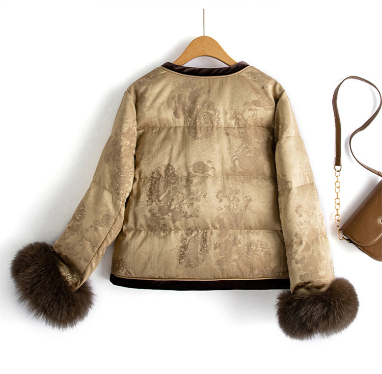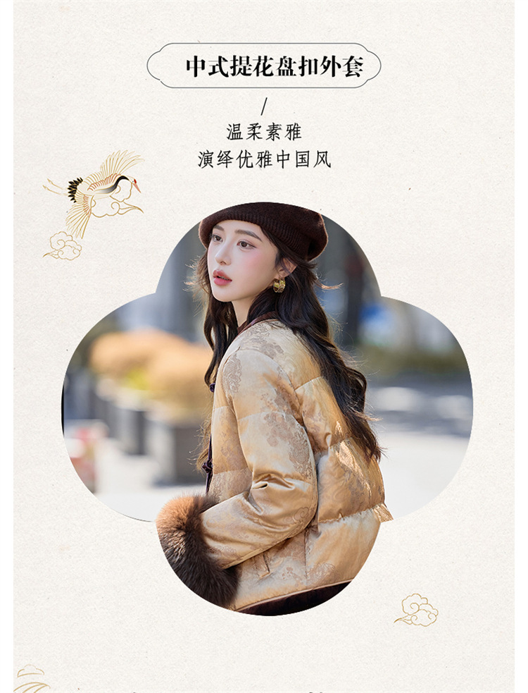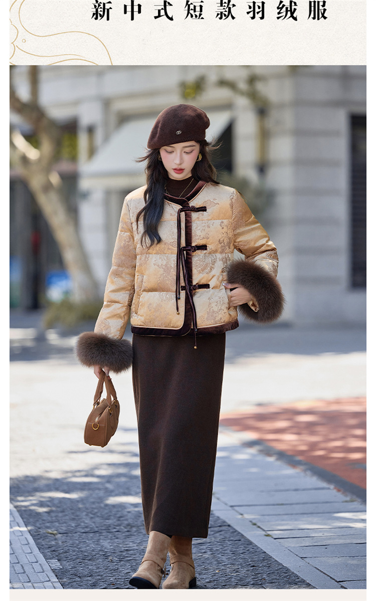 圆领提花料新中式,真狐狸毛袖短款女式羽绒服HR-SYY2693