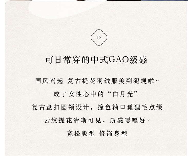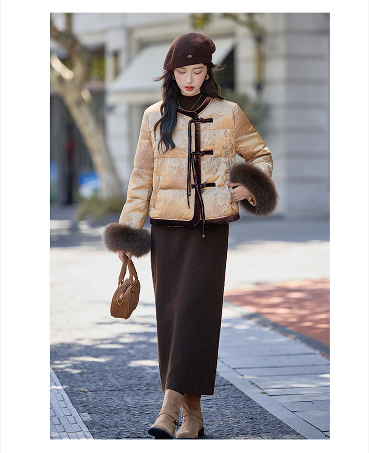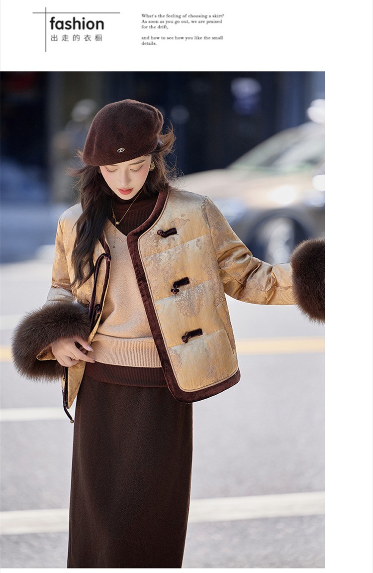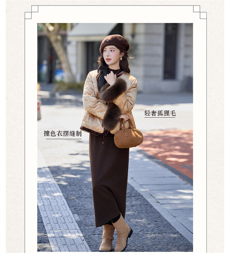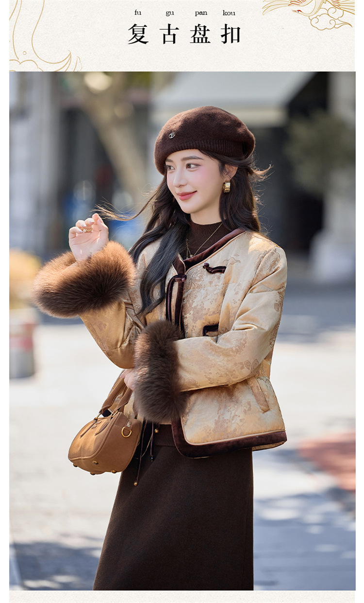 圆领提花料新中式,真狐狸毛袖短款女式羽绒服HR-SYY2693