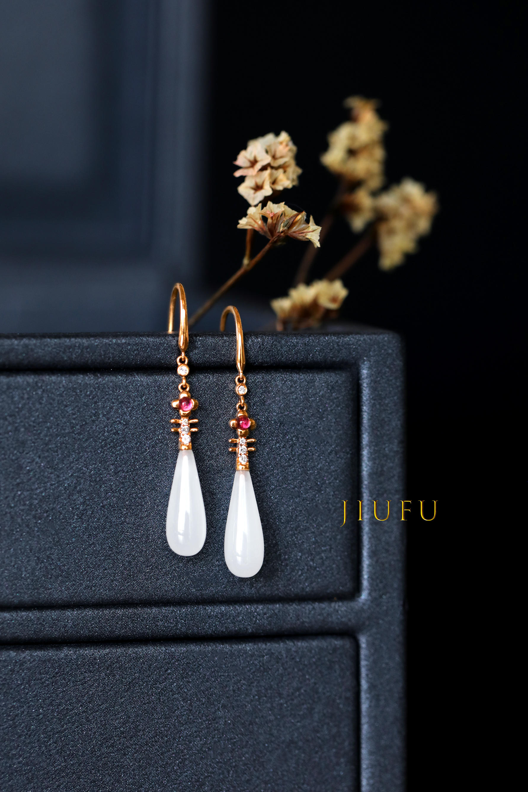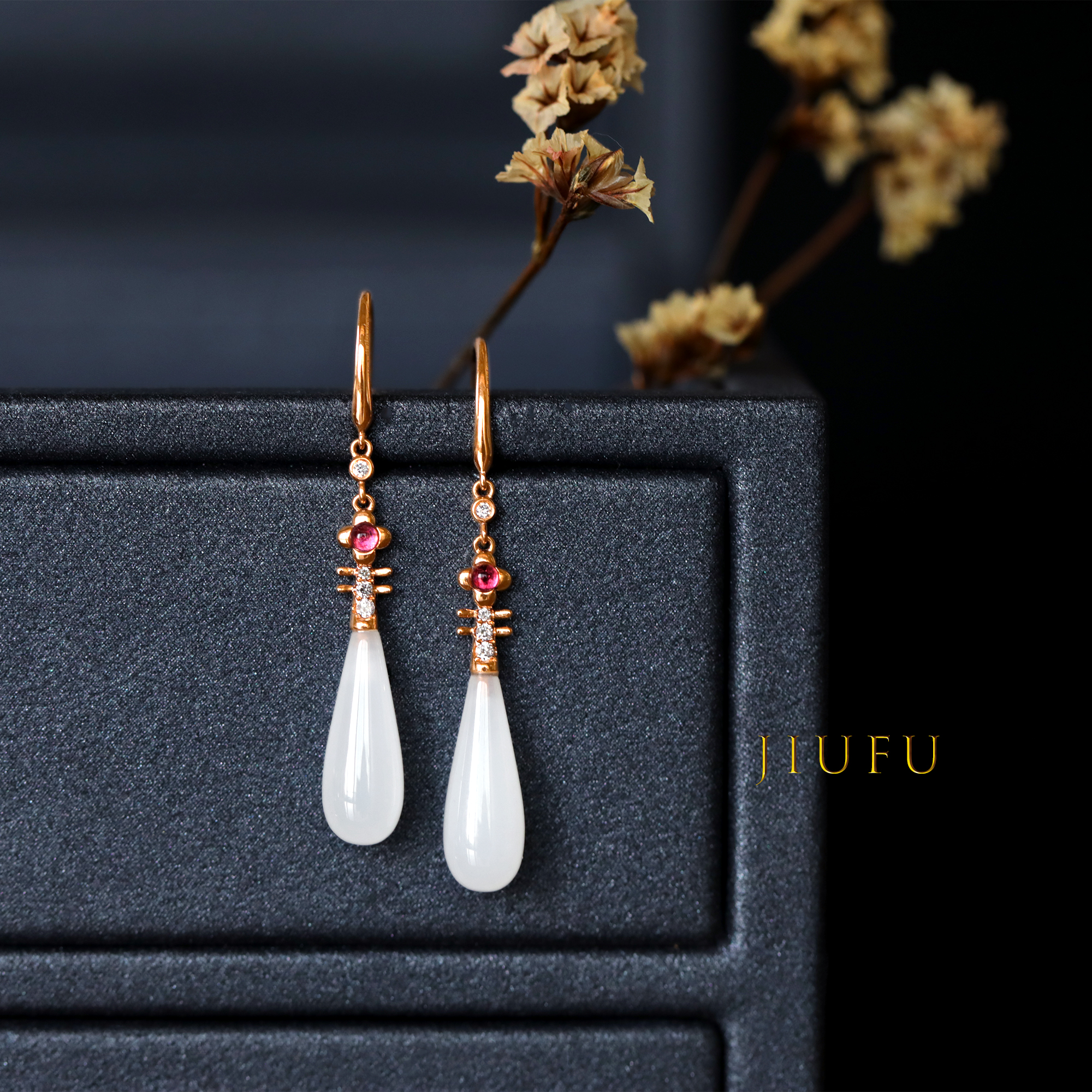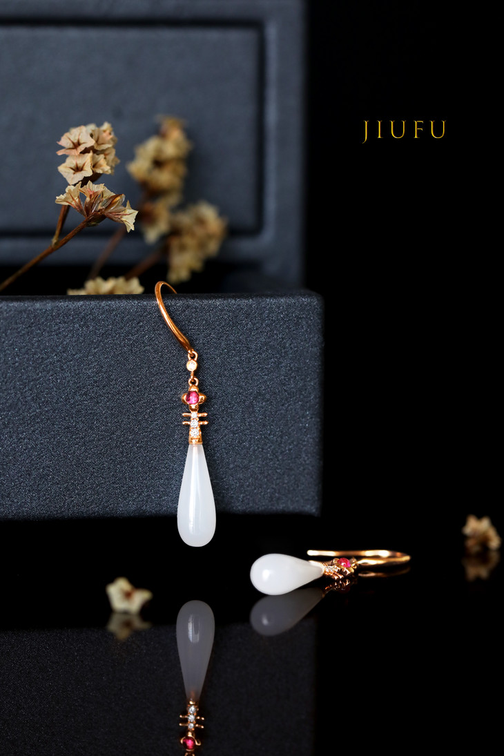 18K玫瑰金和田玉(白玉)耳饰