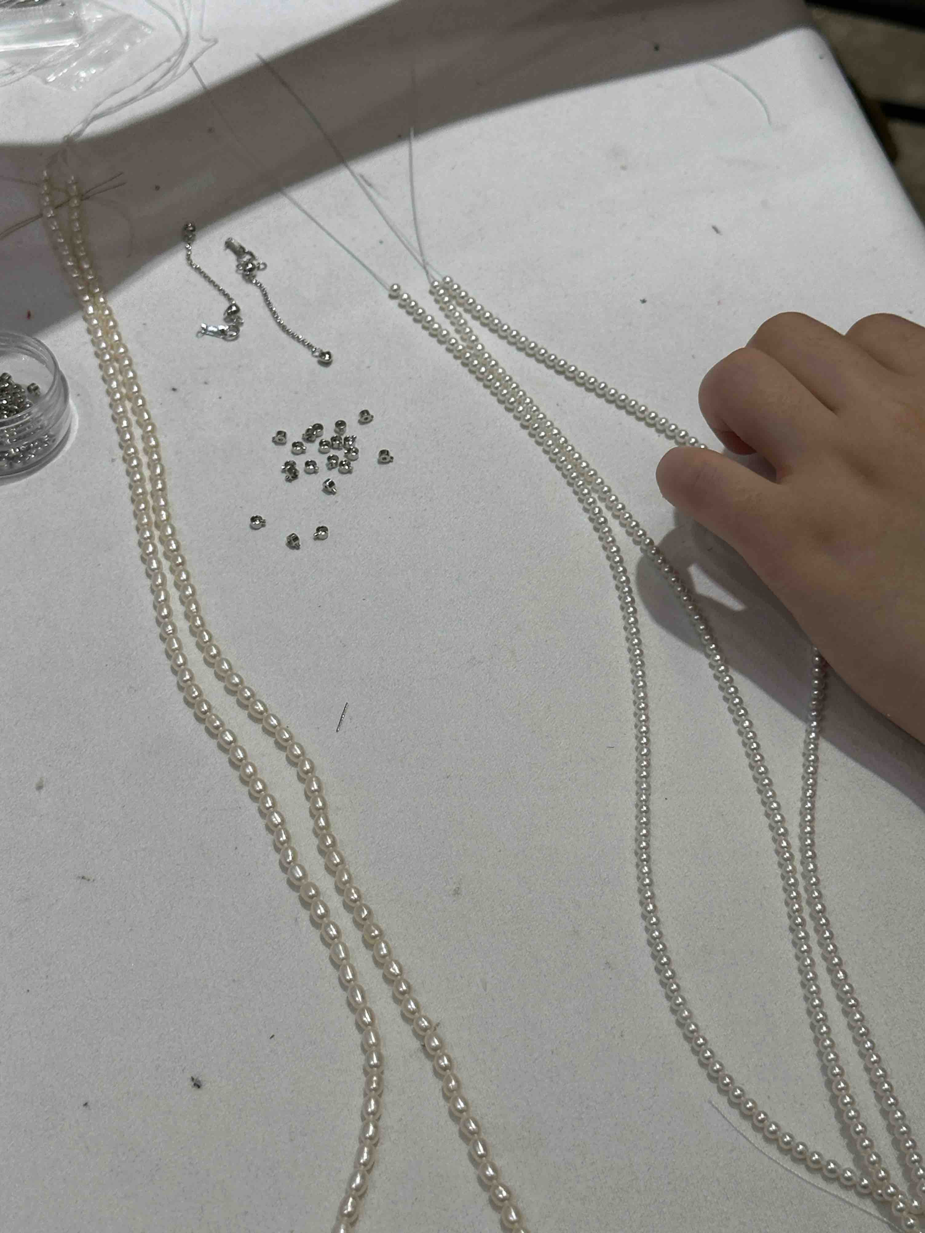 以下是挑选珠串,因为我是直接挑好了做成品,所以中间没有拍太多,下图是从一大把3-3.5mm的珠串中挑了3条,柜台正在上扣做成品
