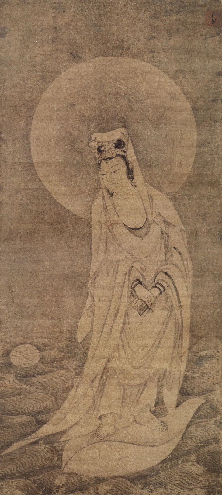 宝相庄严,脚踩莲花,水天一色,明月高悬。