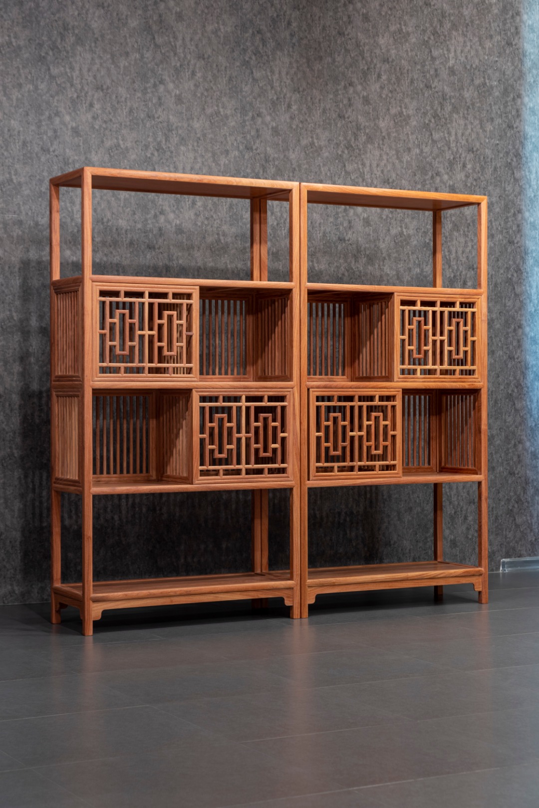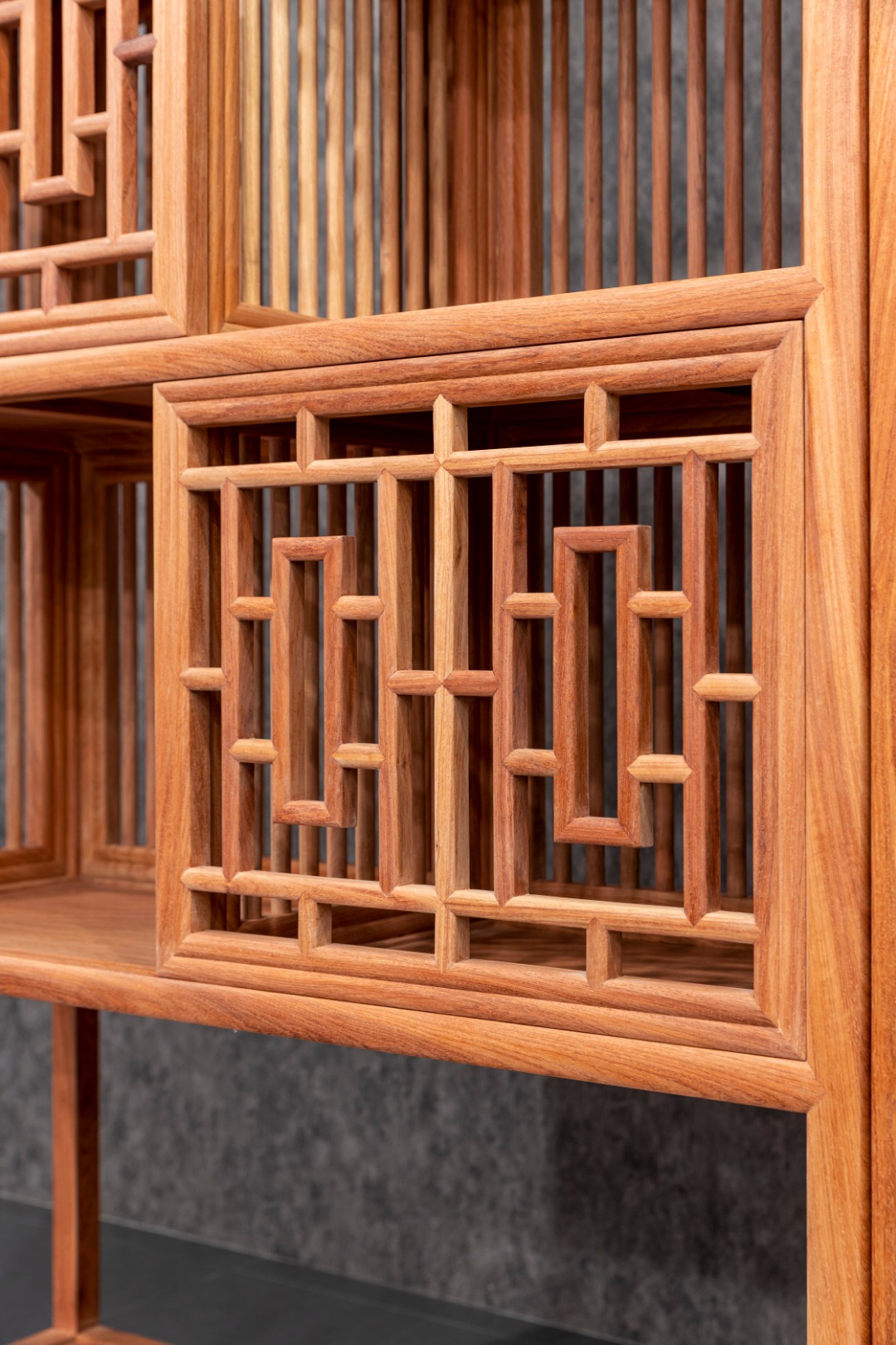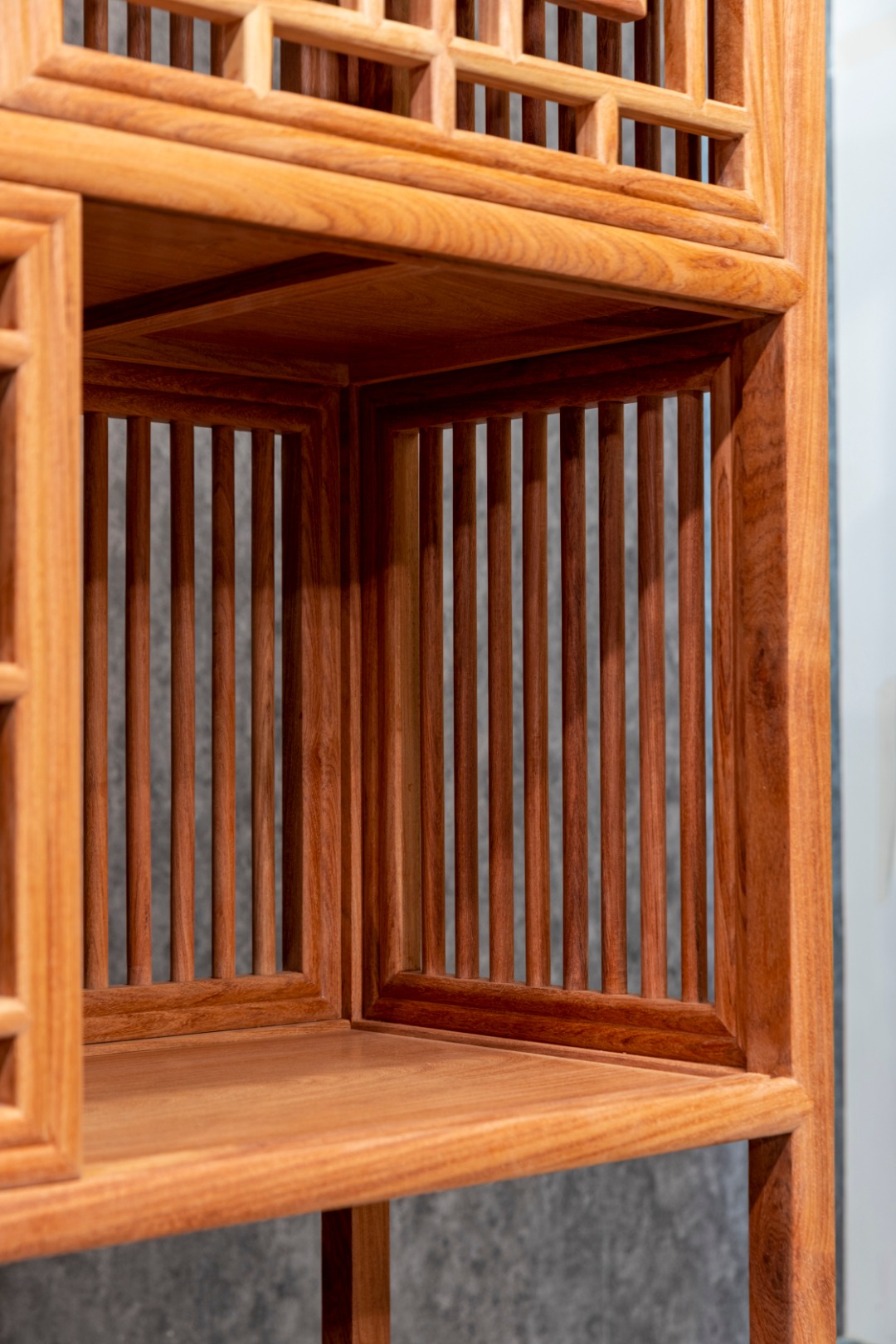 此器原型似例来自《明式家具研究》丁12一件直棂步步紧门透棂架格。改良复刻,据王世襄《明式家具研究》丁12所提:“正面底层使用了两块相当宽的角牙,未能令人惬意。如四面都采用最常见的素牙条和素牙头,效果定会好一些。”红桥红将原器底部四面改素牙款。此器汲取了王老见地,器型更为典雅、轻盈。