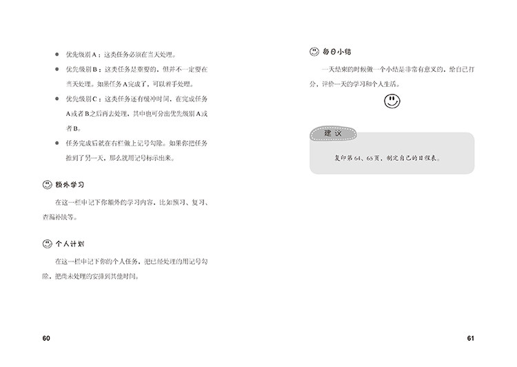 ● 第三章将让你了解成功管理时间的基础知识,教你如何以最佳的状态开始一天的生活,如何设定事情的优先级别,以及如何克服拖沓和压力,独立掌控时间。