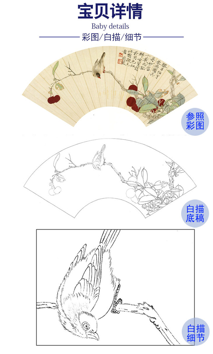 于非闇工笔花鸟白描底稿《朱英飞禽》扇面小品-多种白描尺寸可选-YF65