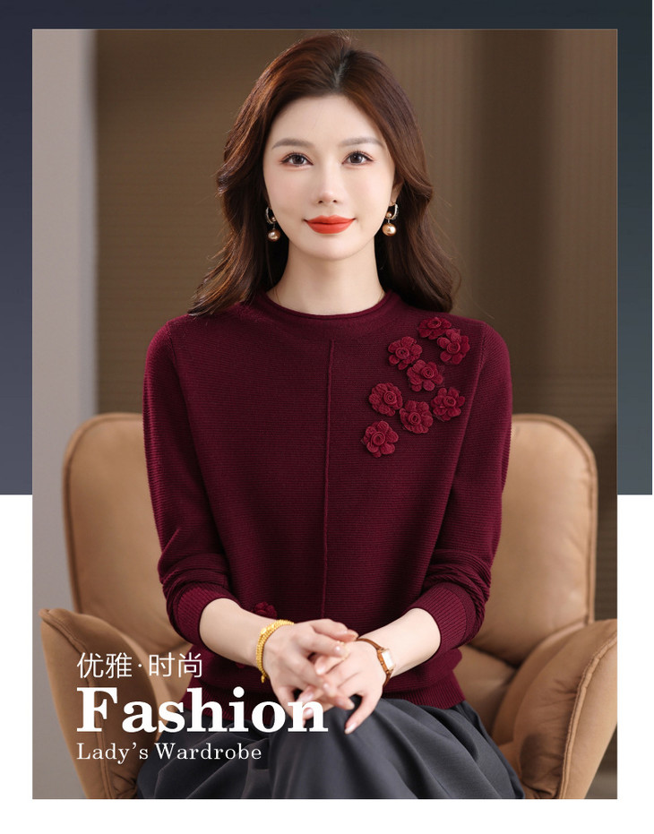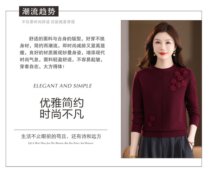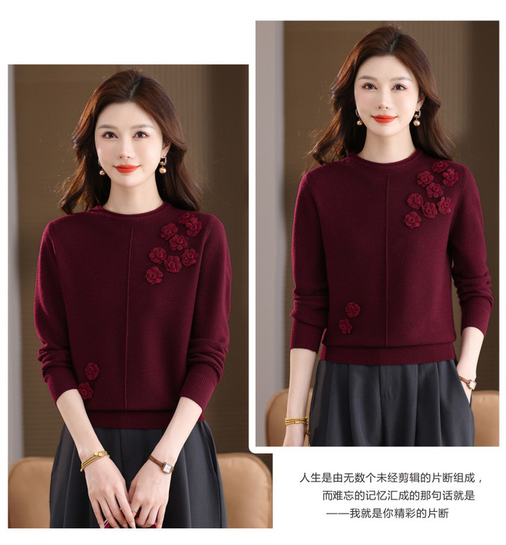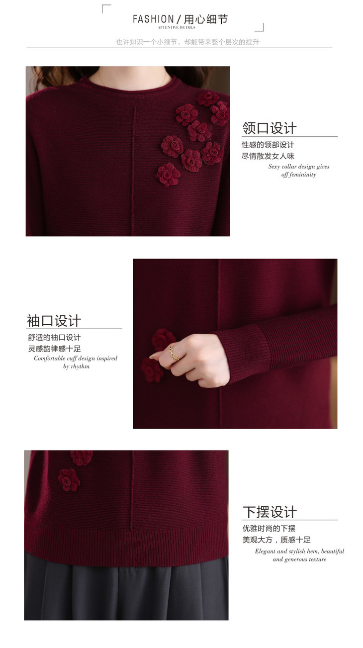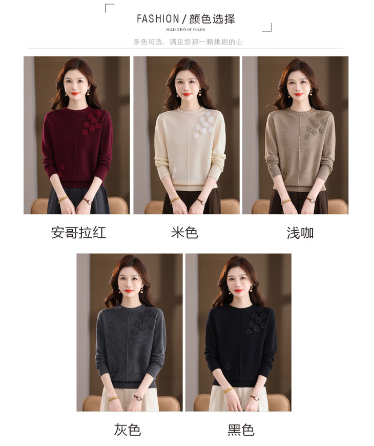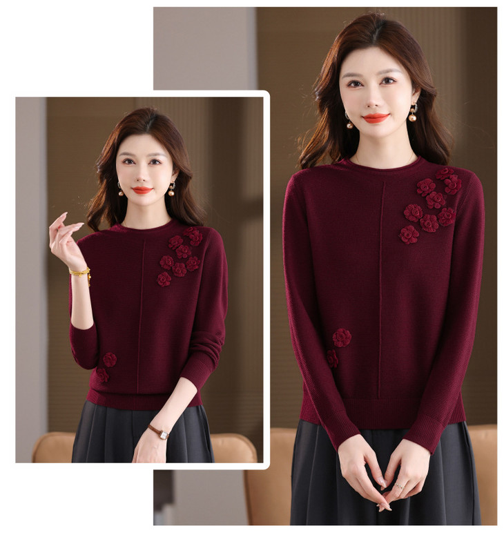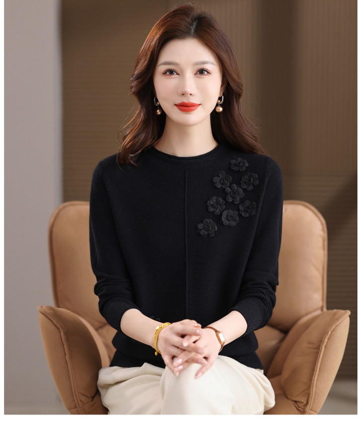 法式复古立体玫瑰刺绣针织衫,显瘦圆领长袖打底上衣CC-QQH-9237