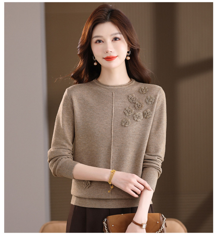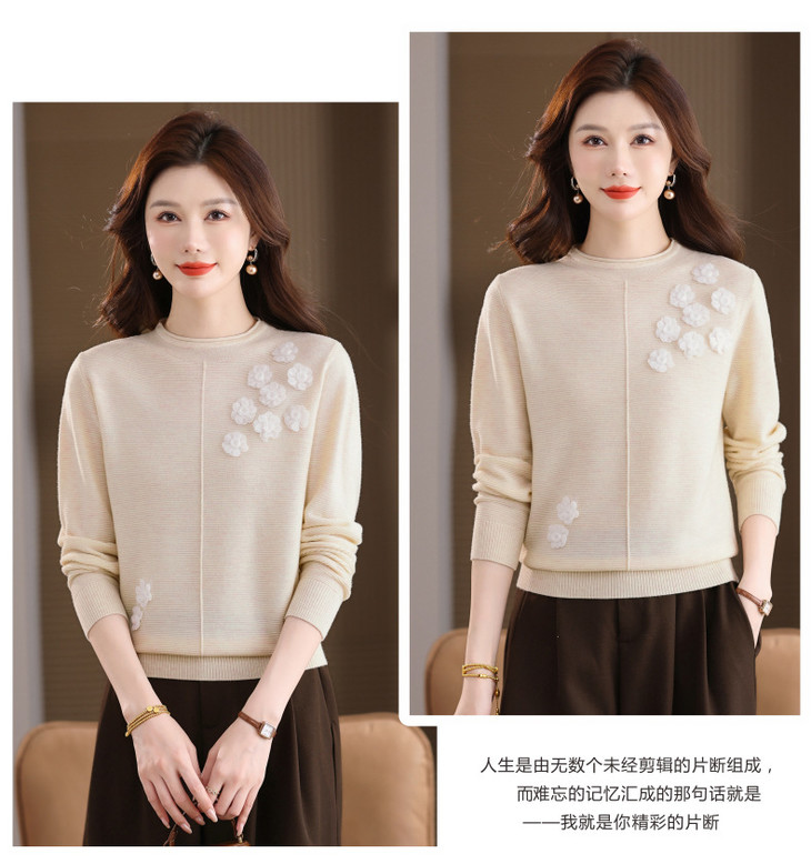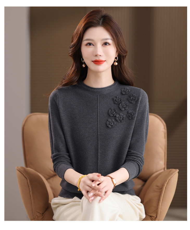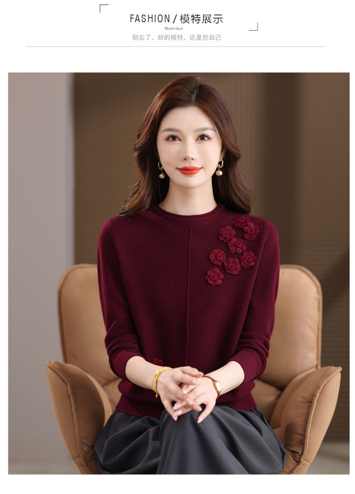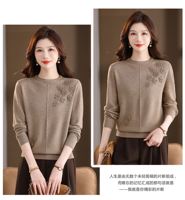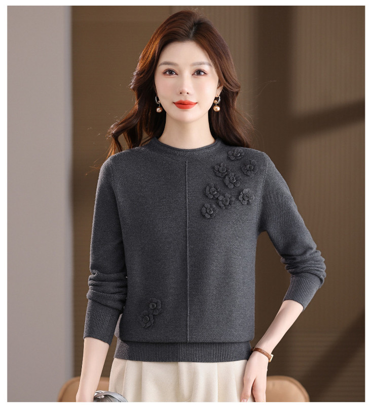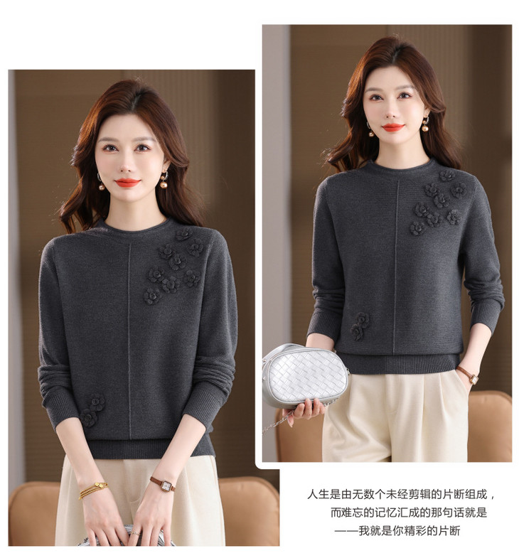 法式复古立体玫瑰刺绣针织衫,显瘦圆领长袖打底上衣CC-QQH-9237
