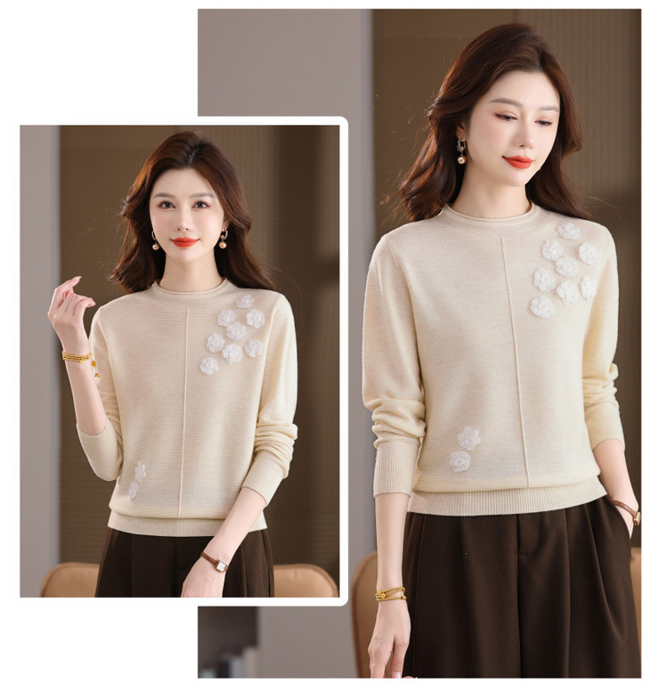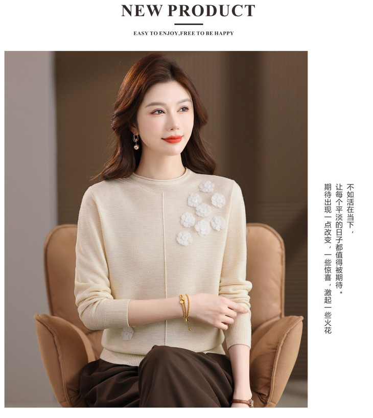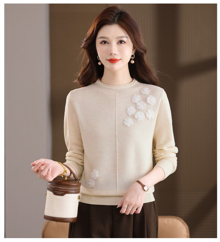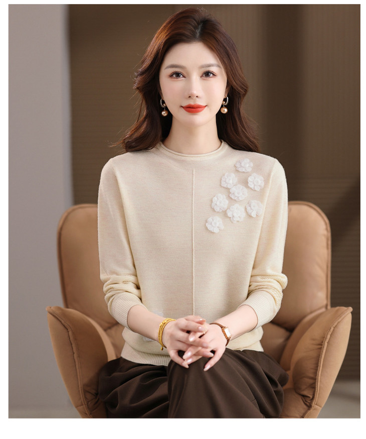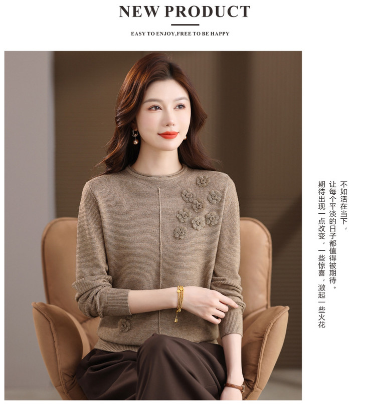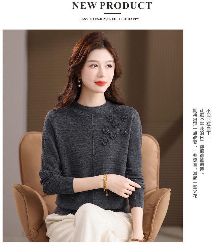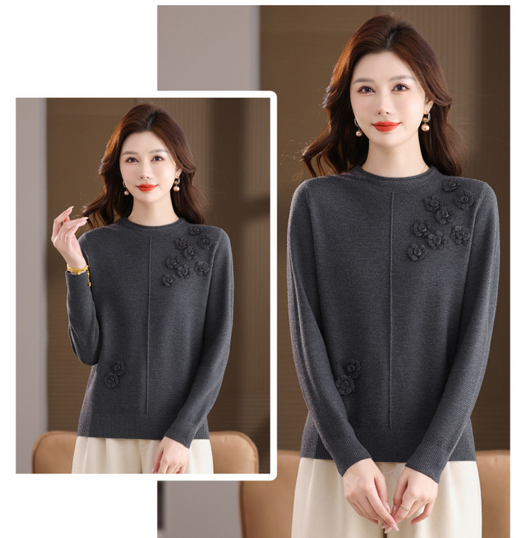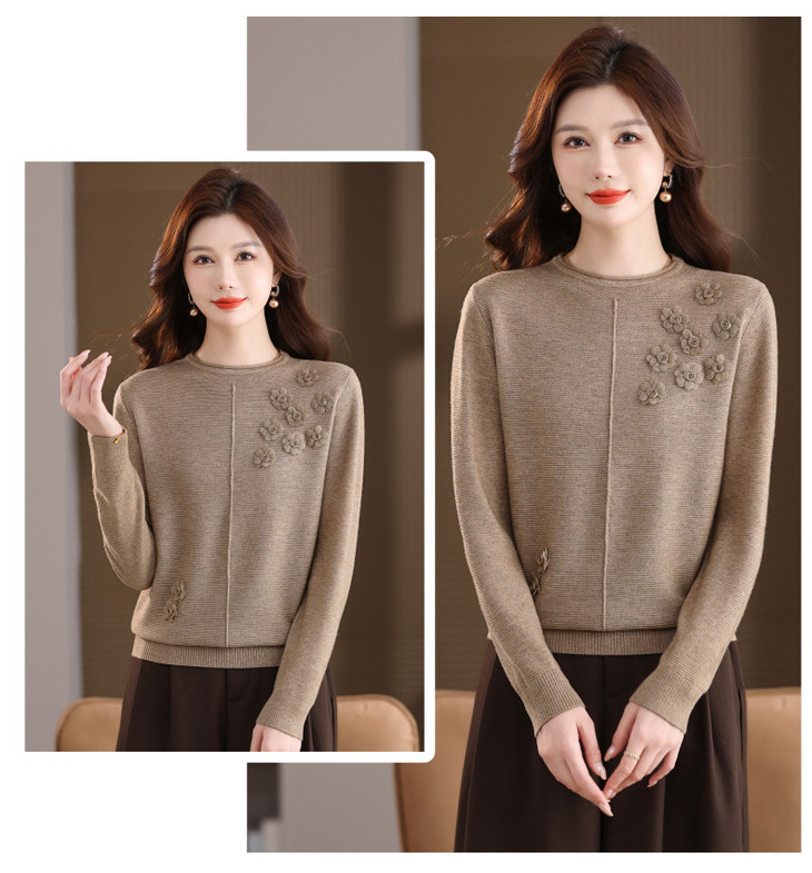 法式复古立体玫瑰刺绣针织衫,显瘦圆领长袖打底上衣CC-QQH-9237