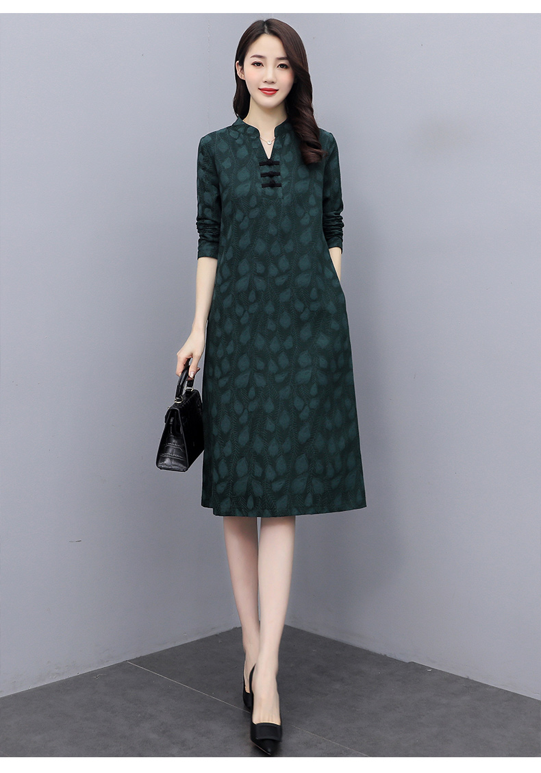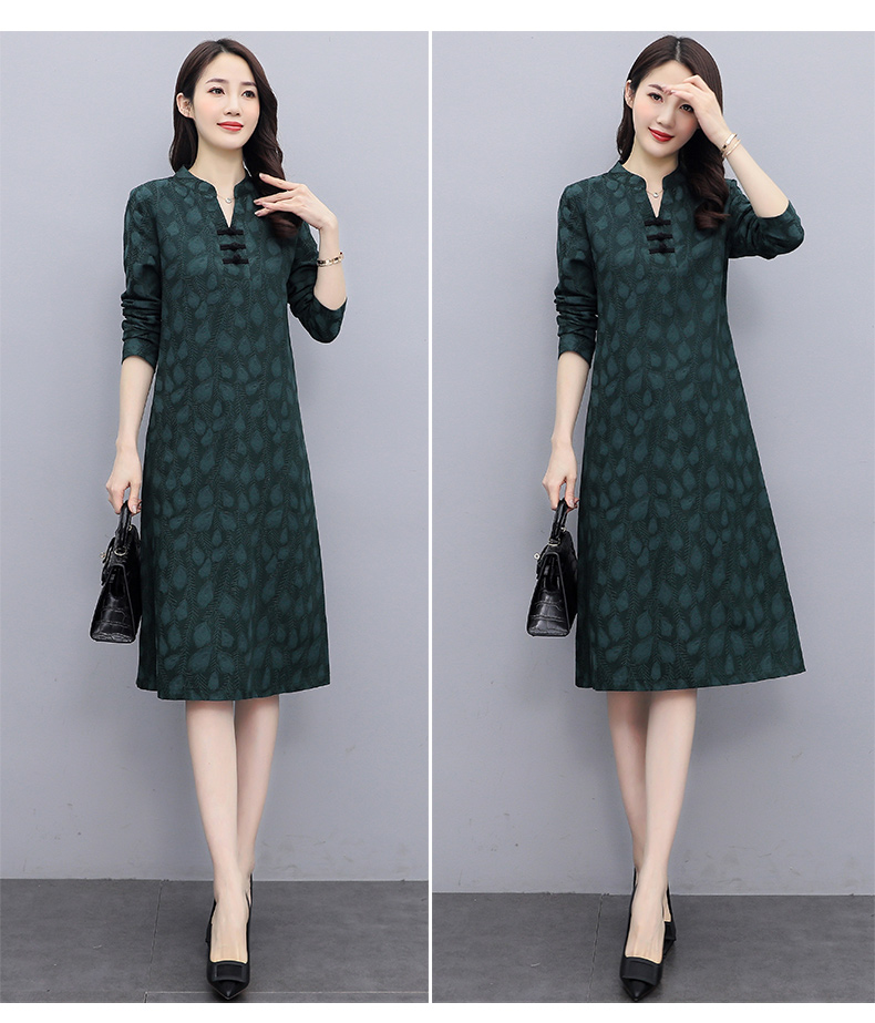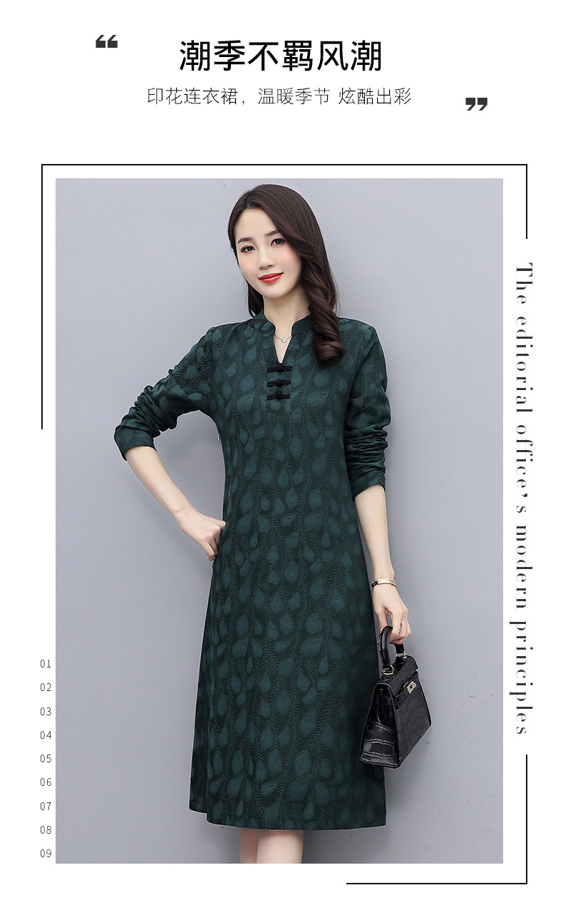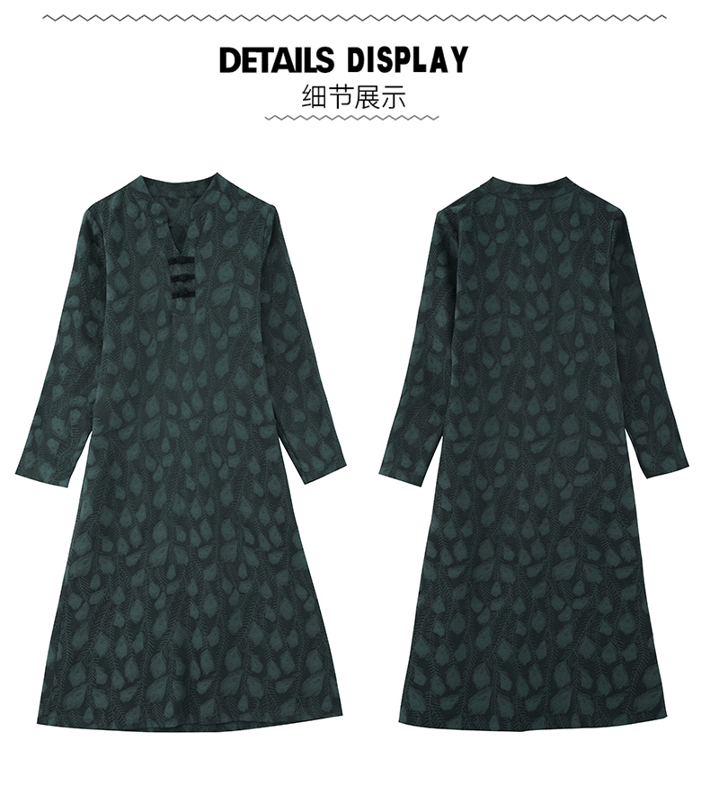 优雅气质,V领撞色盘扣中长款复古连衣裙HR-XYUX3213