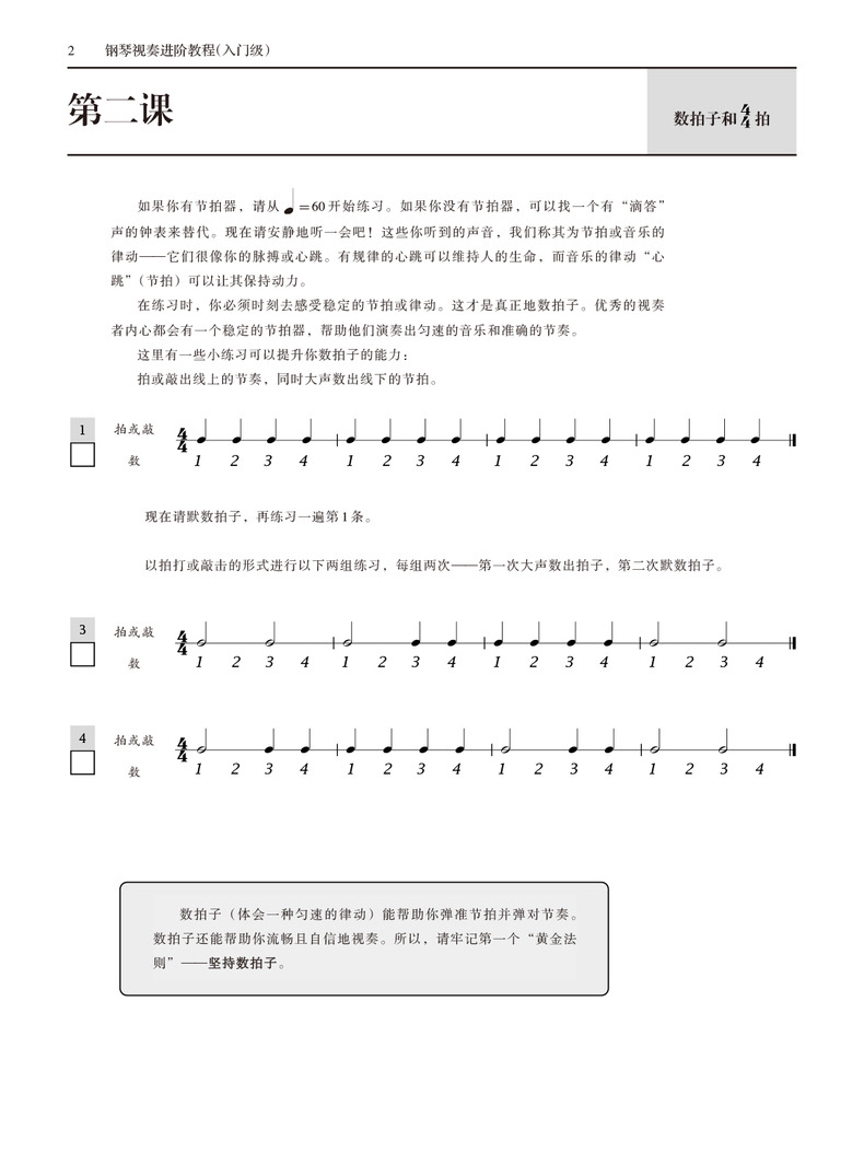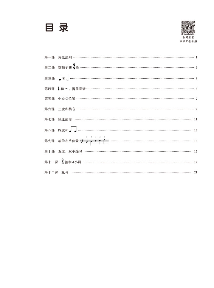 《钢琴视奏进阶教程》是由保罗·哈里斯教授编著的英皇考级三位一体考试中钢琴视奏类的优秀辅导教材,这套教材在世界几十个国家广泛应用,深受教师推崇、学生喜爱。本书是“钢琴视奏进阶教程”中的入门教程,旨在通过著名音乐教育家保罗·哈里斯广受好评且已成系统的“Improve Your Sight-reading!”(“钢琴视奏进阶”)教学方法,全面提高入门级学生的钢琴视奏能力。全书的内容是循序渐进的,每个课时都通过“节奏练习”“旋律练习”“准备练习”(带有趣味性的小问题)和“开始视奏”这四个模块,一步一步地训练学生对乐曲的整体把握。 |
