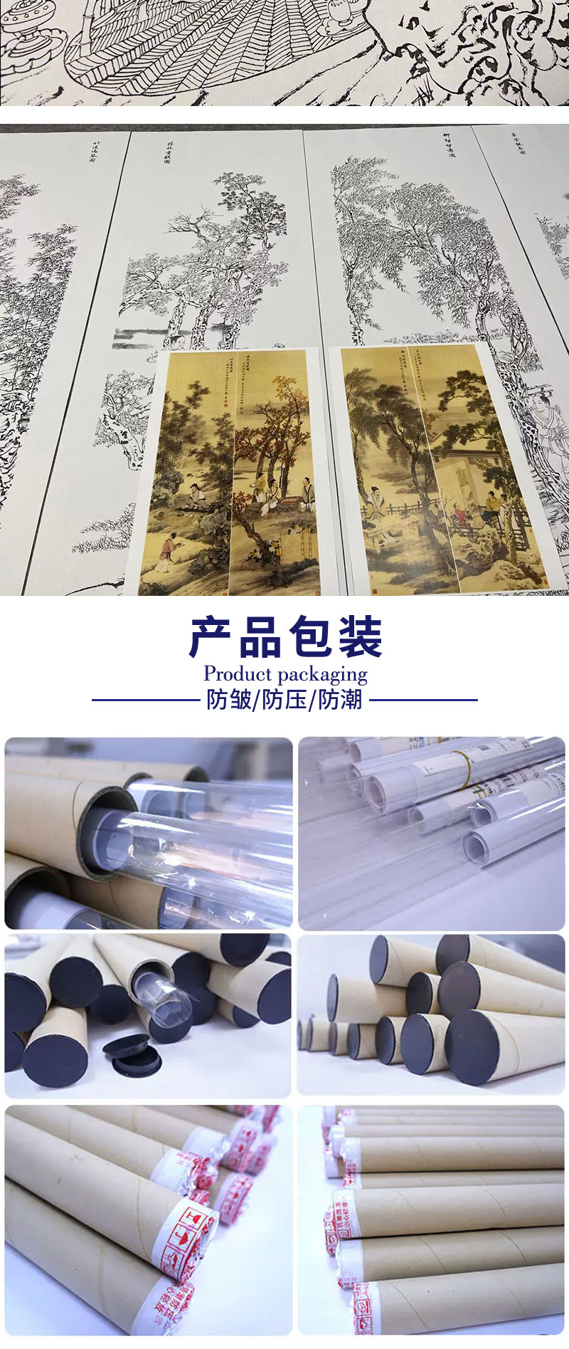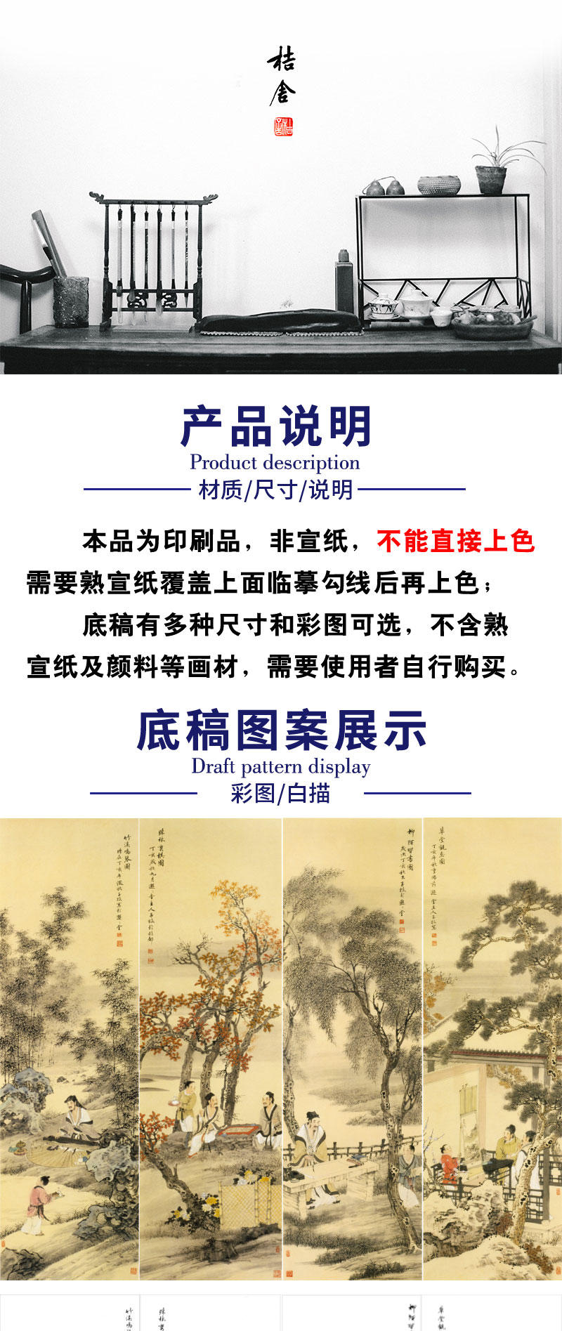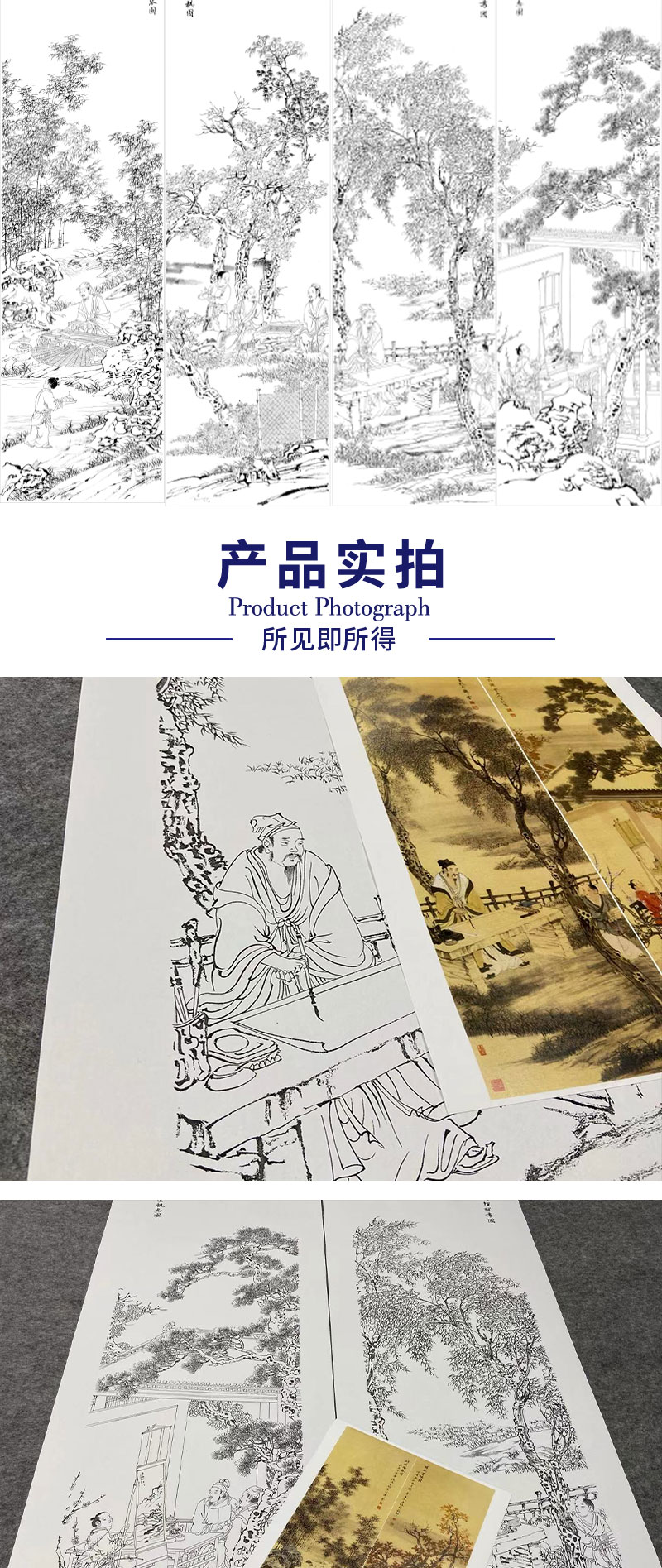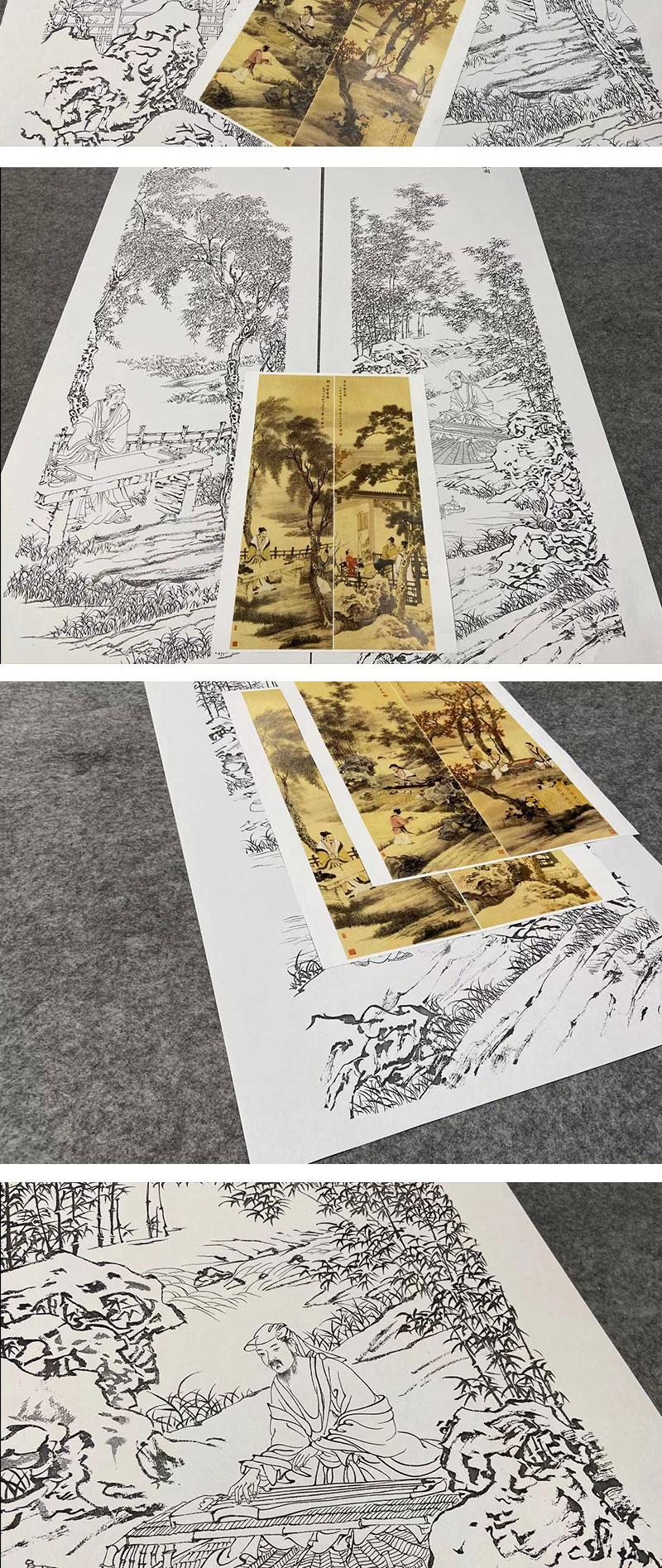 【四条屏】李子牧工笔画白描底稿山水人物图《琴棋书画》临摹勾线高清打印稿TP42