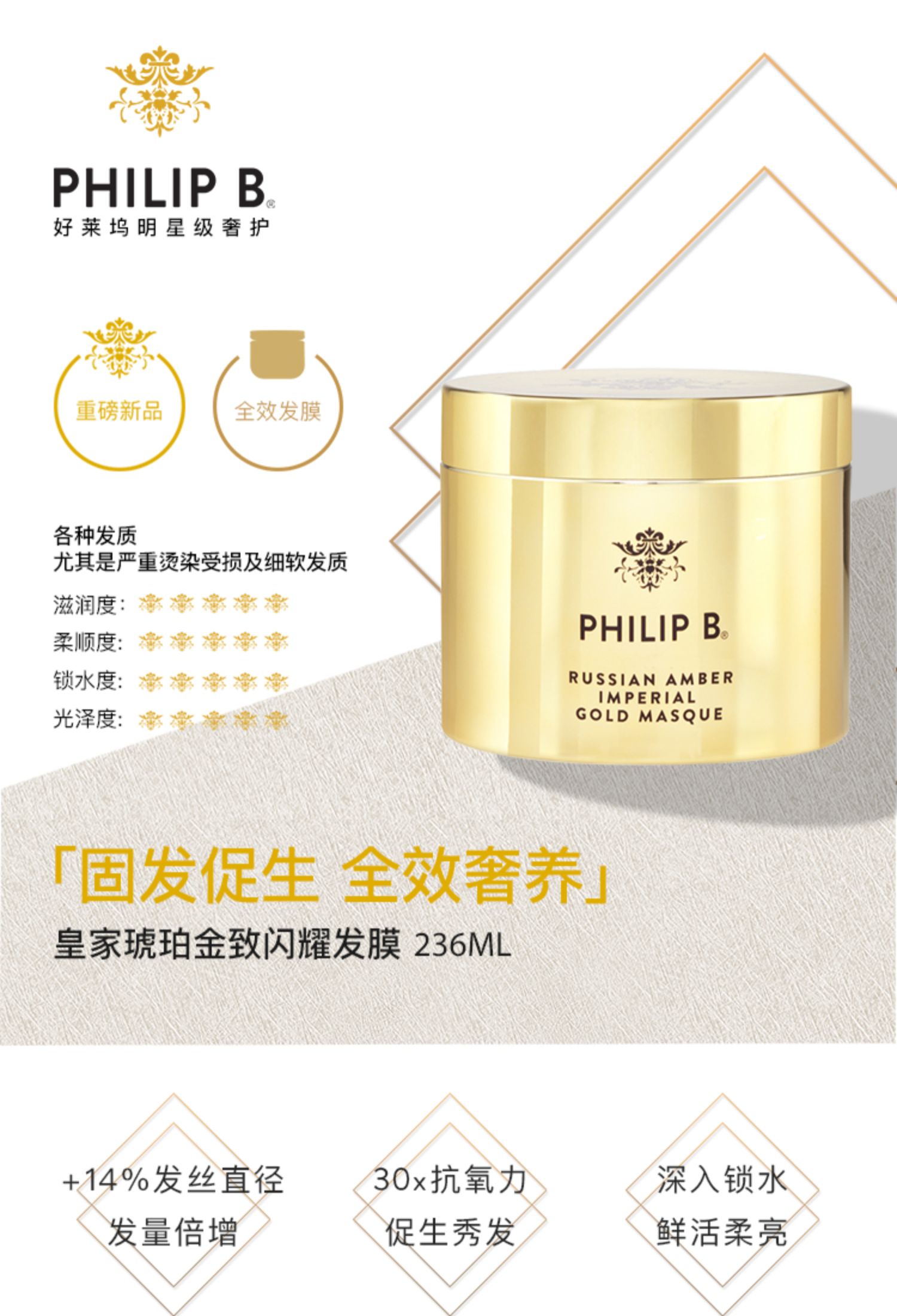 PHILIP B皇家琥珀黄金护发膜236ml 全效奢养强韧发丝修复受损