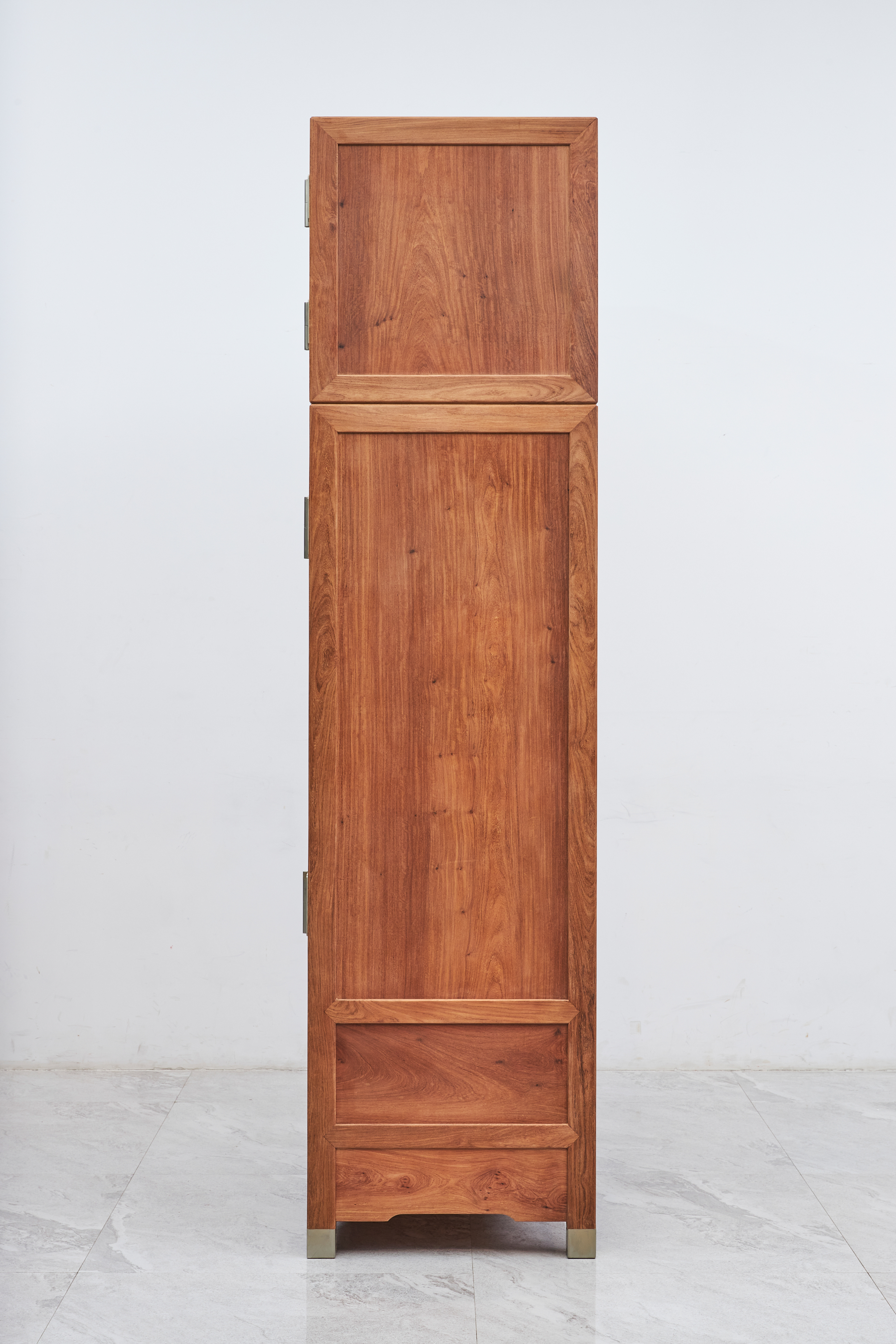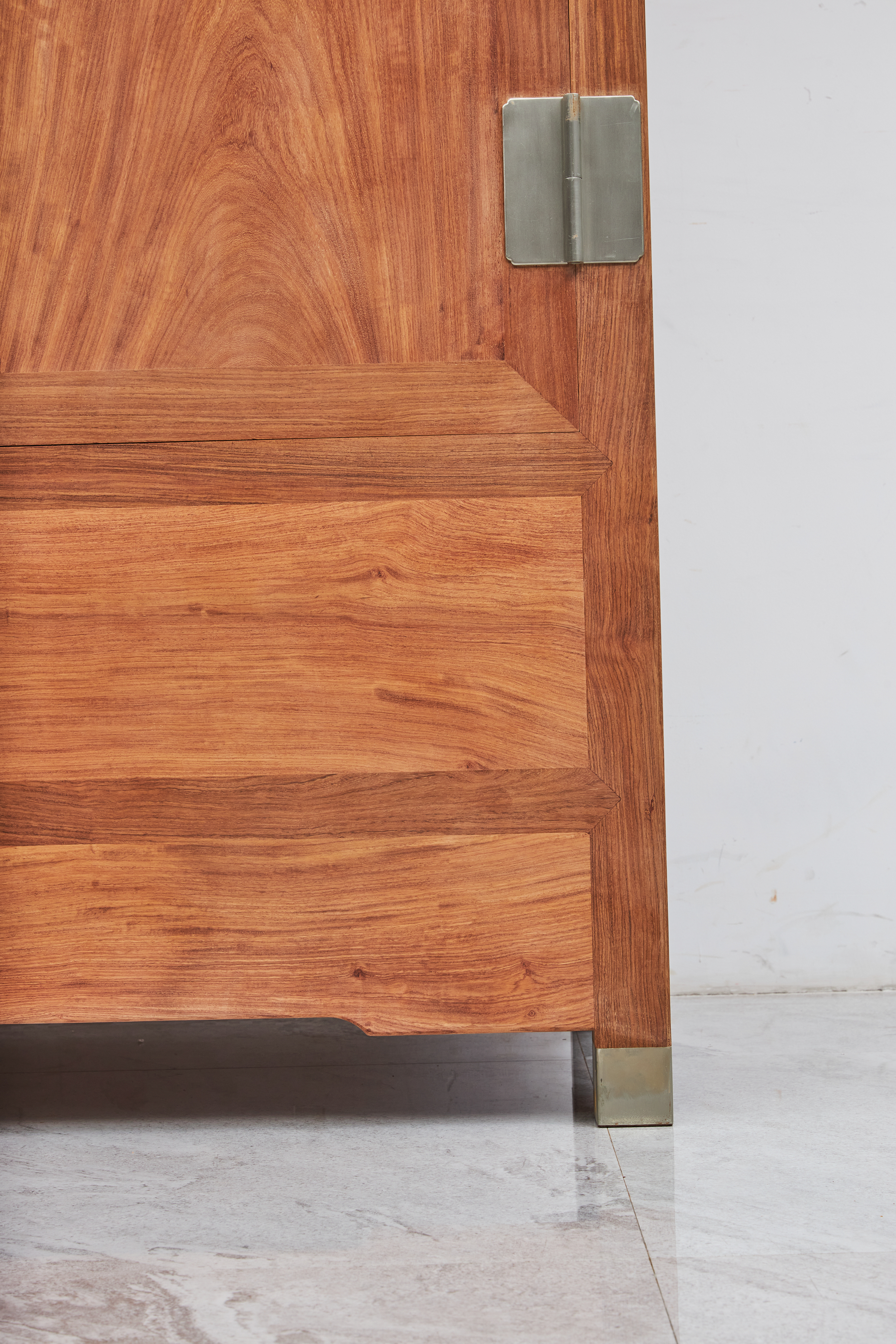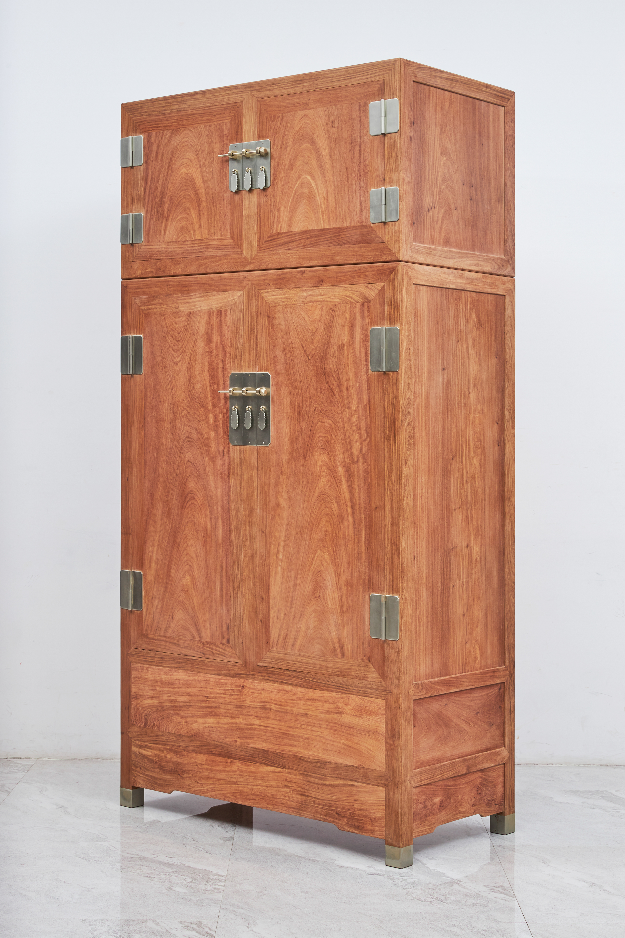 此器考虑当代生活实用性,一件内设屉板、抽屉,分隔出实用空间,另一件仅设可拆卸挂衣杆,与顶箱一样空敞,四件柜正面装板平镶,侧、背微微落堂,都是传统造法,方材大框起小委角线,形成观面的细致层次感,四足包铜,在搬动时起到更好的保护作用。成对摆放时,整体气势磅礴、雄伟壮观、重而不拙。