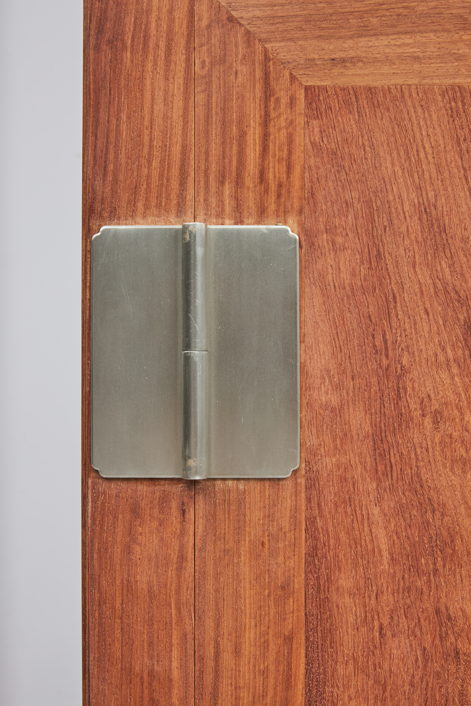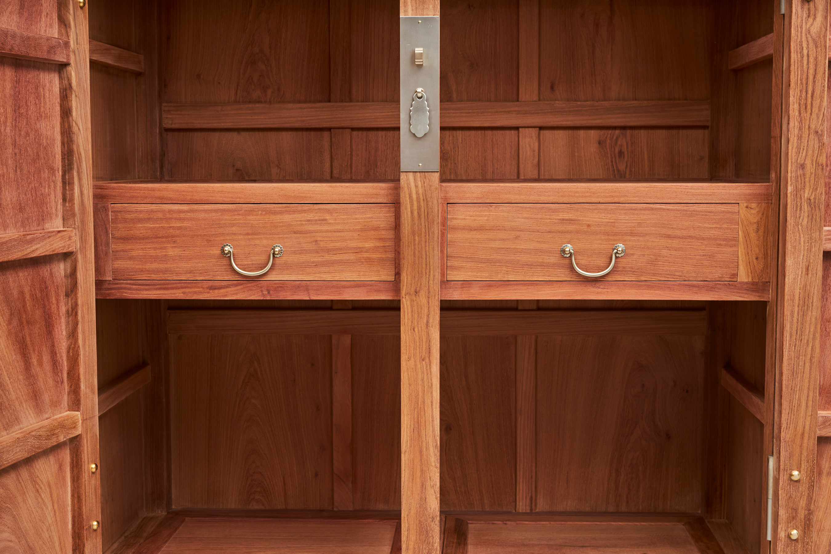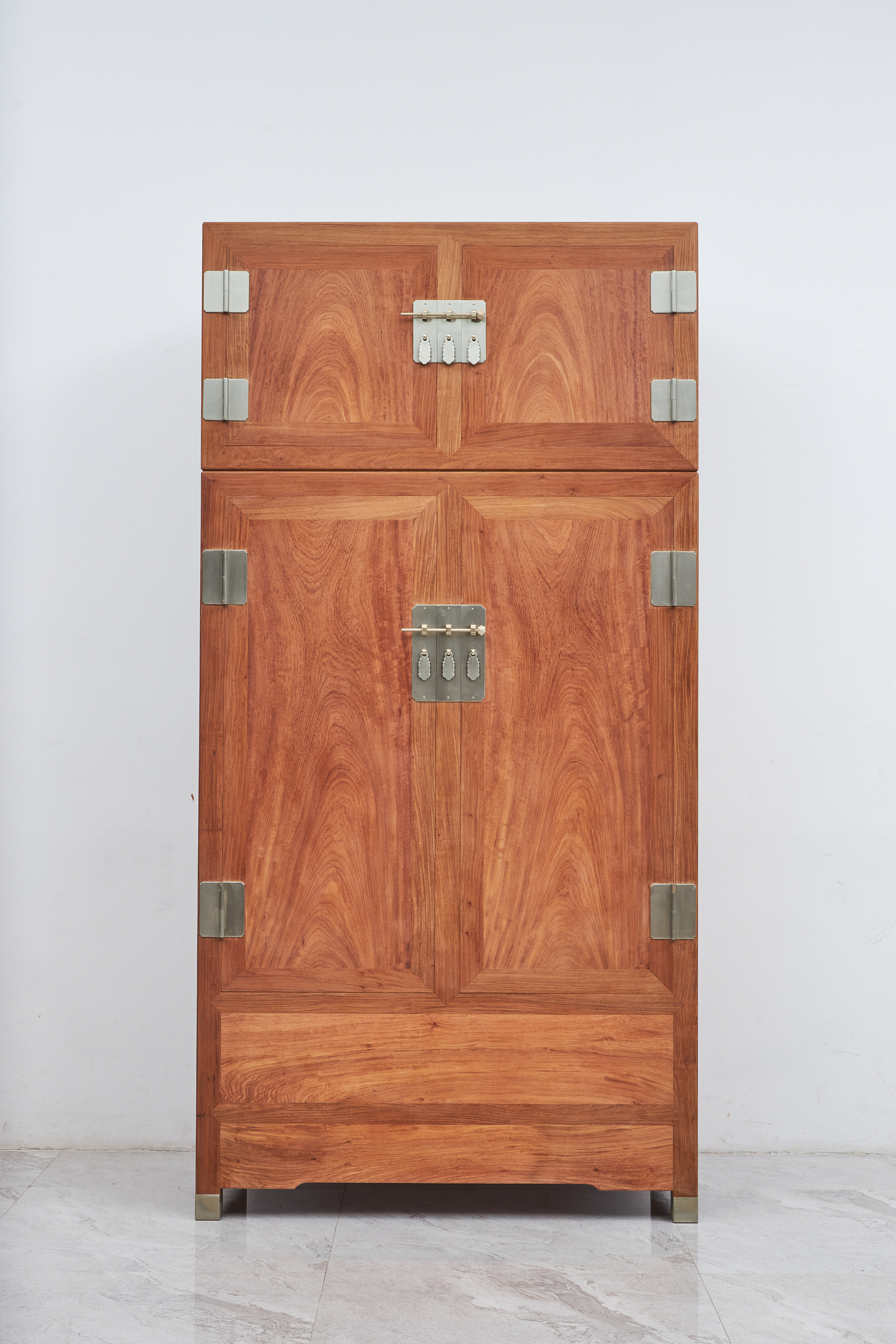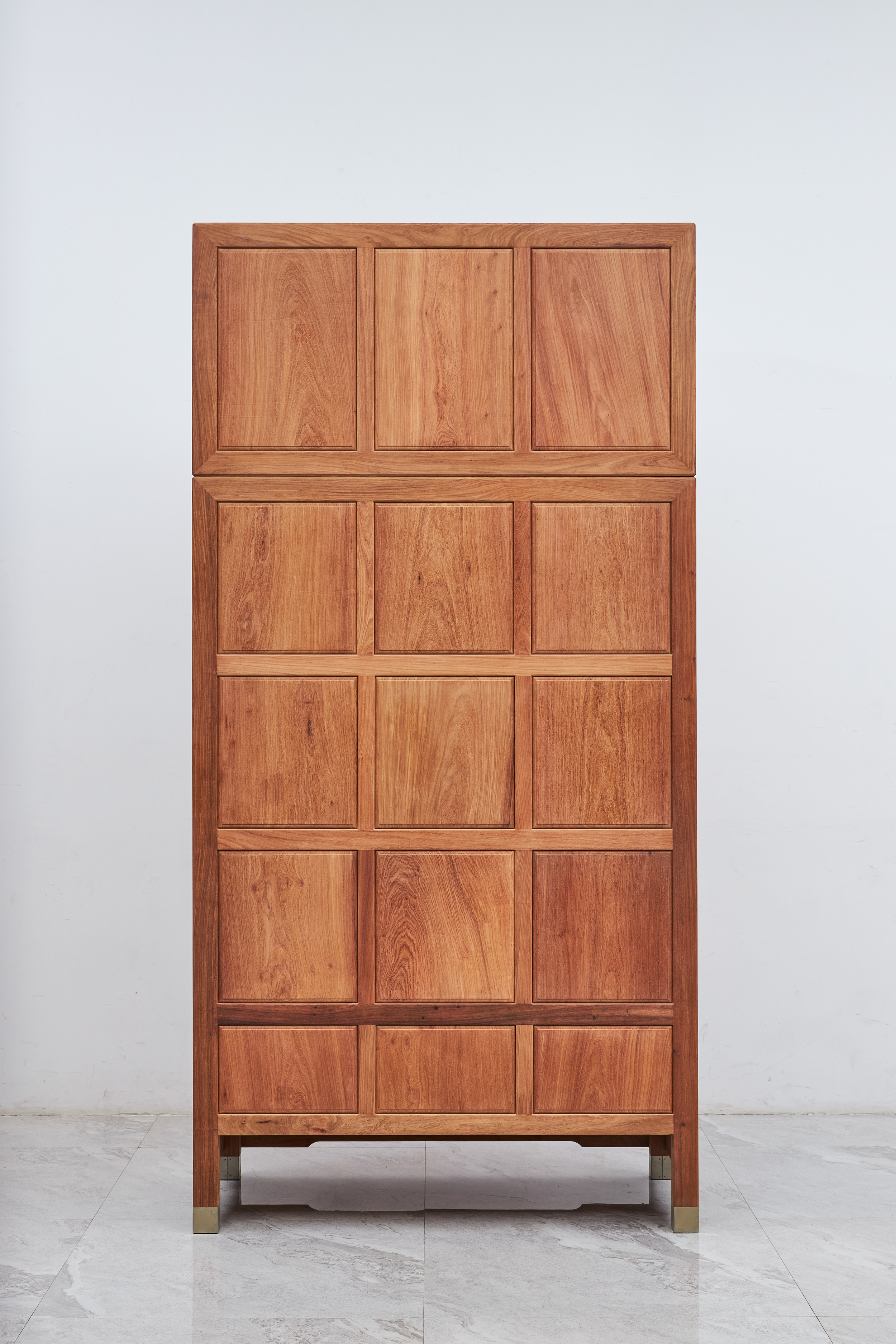 此器考虑当代生活实用性,一件内设屉板、抽屉,分隔出实用空间,另一件仅设可拆卸挂衣杆,与顶箱一样空敞,四件柜正面装板平镶,侧、背微微落堂,都是传统造法,方材大框起小委角线,形成观面的细致层次感,四足包铜,在搬动时起到更好的保护作用。成对摆放时,整体气势磅礴、雄伟壮观、重而不拙。