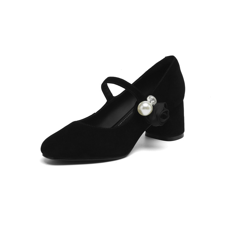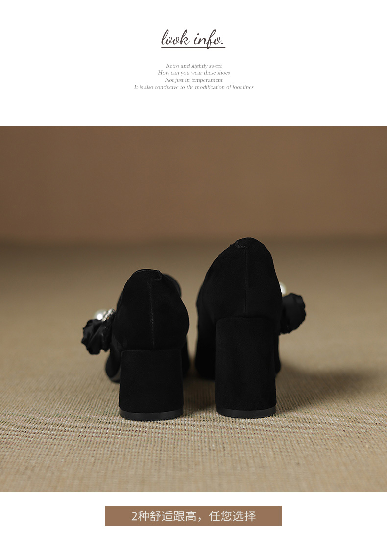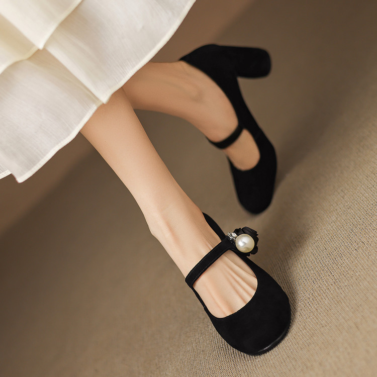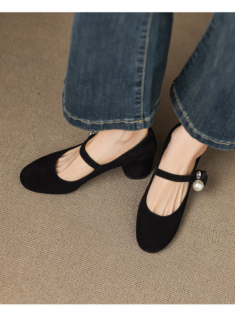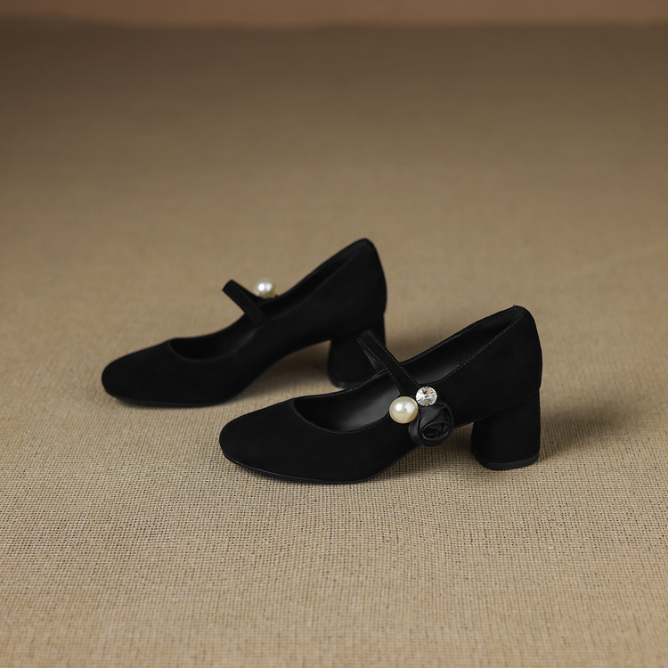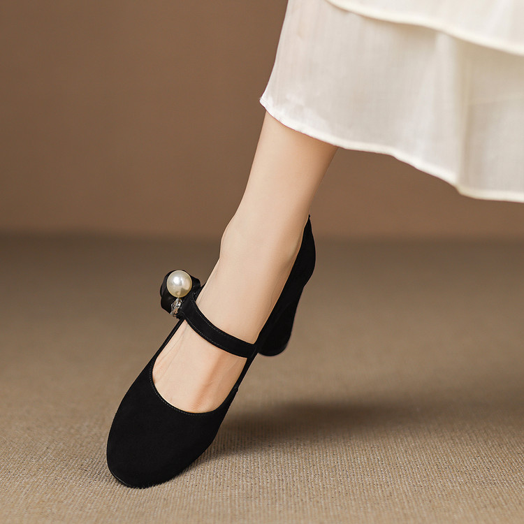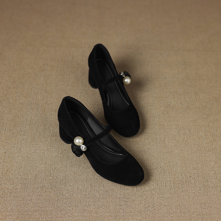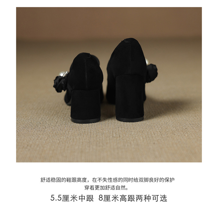 【预售5天】经典复古风黑色羊反皮粗跟珍珠一字带高跟单鞋百搭玛丽珍高跟鞋MNLS&D2533