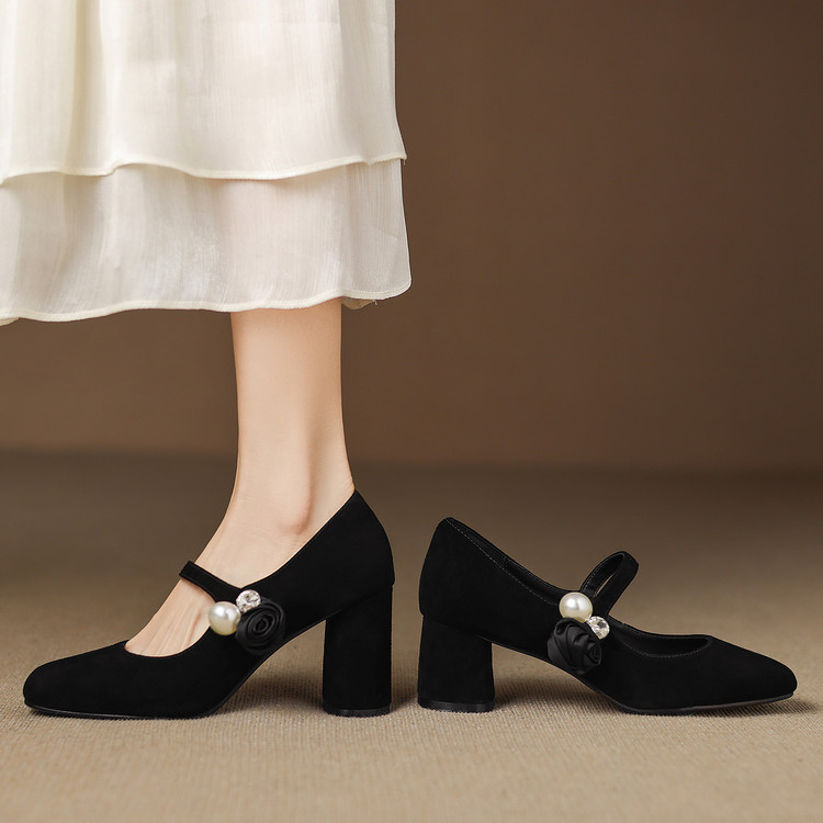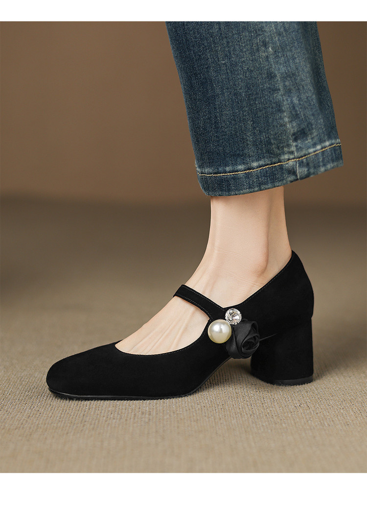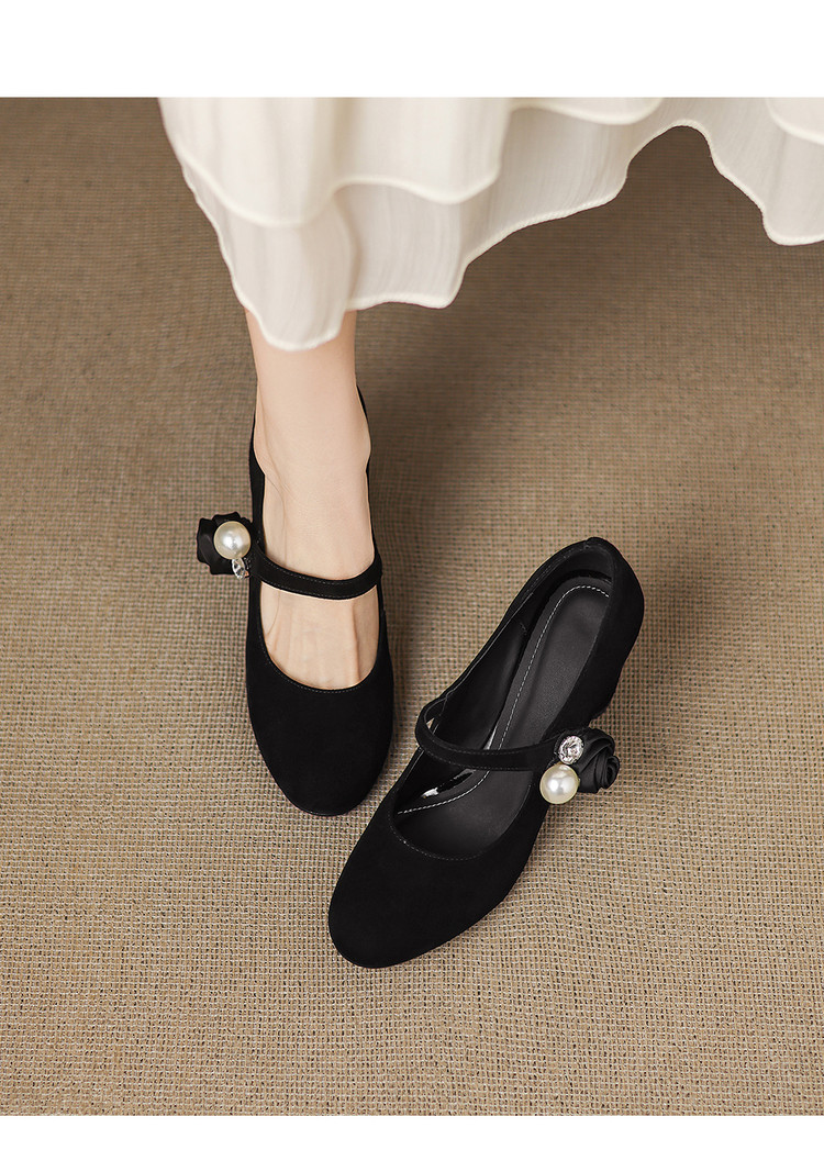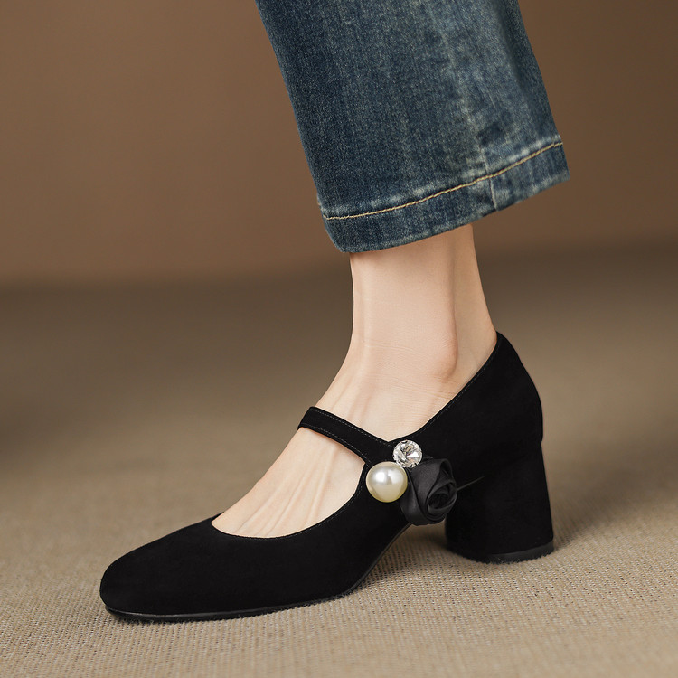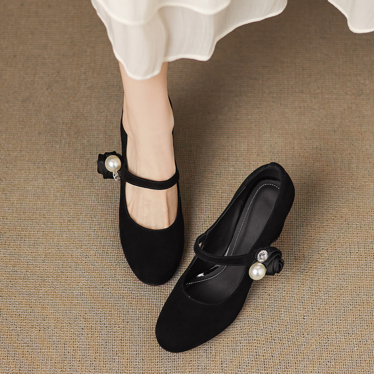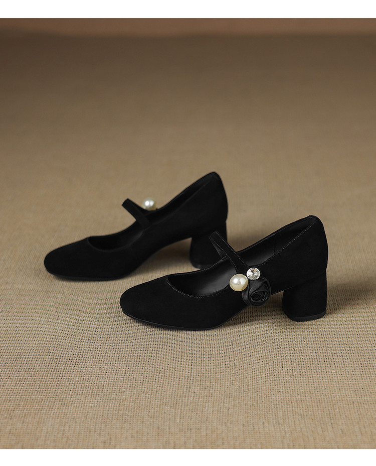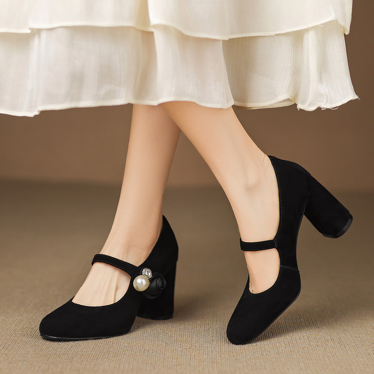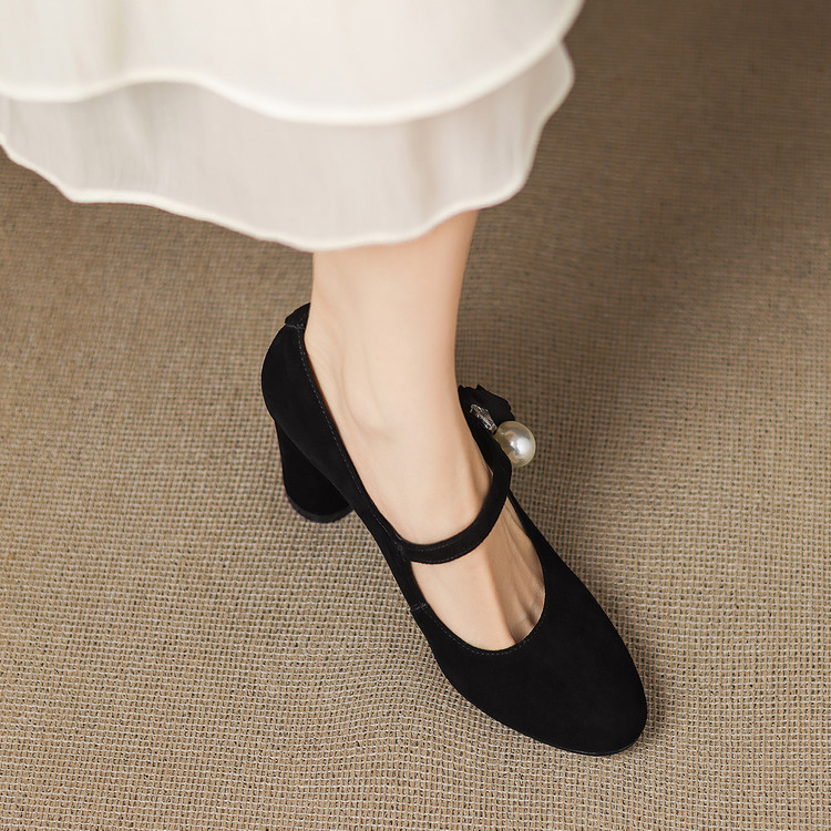 【预售5天】经典复古风黑色羊反皮粗跟珍珠一字带高跟单鞋百搭玛丽珍高跟鞋MNLS&D2533