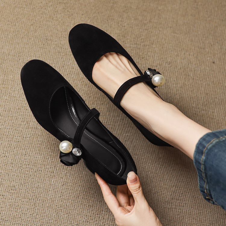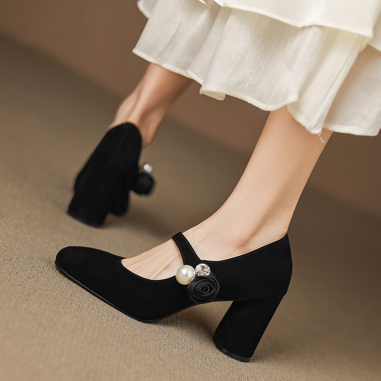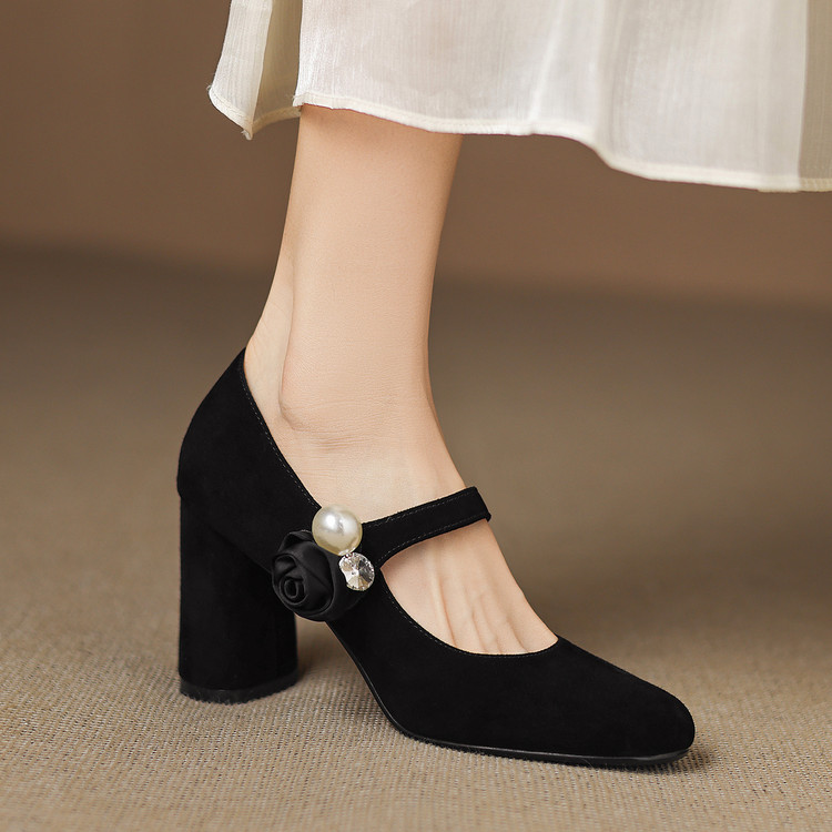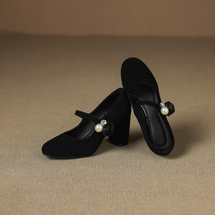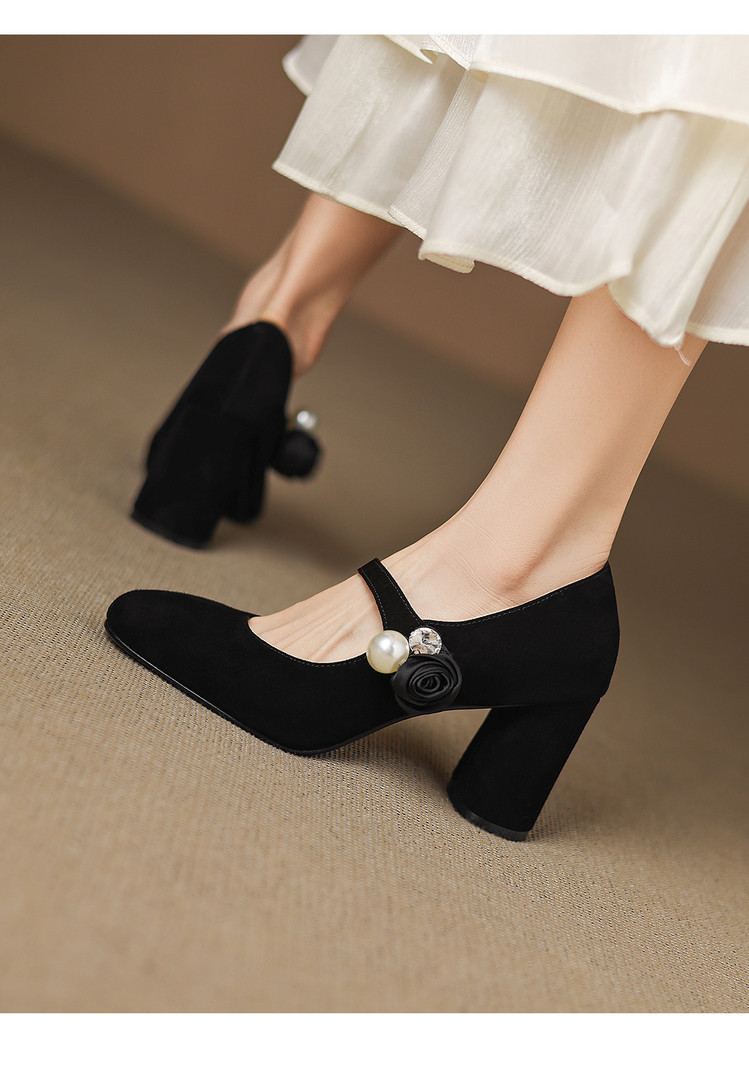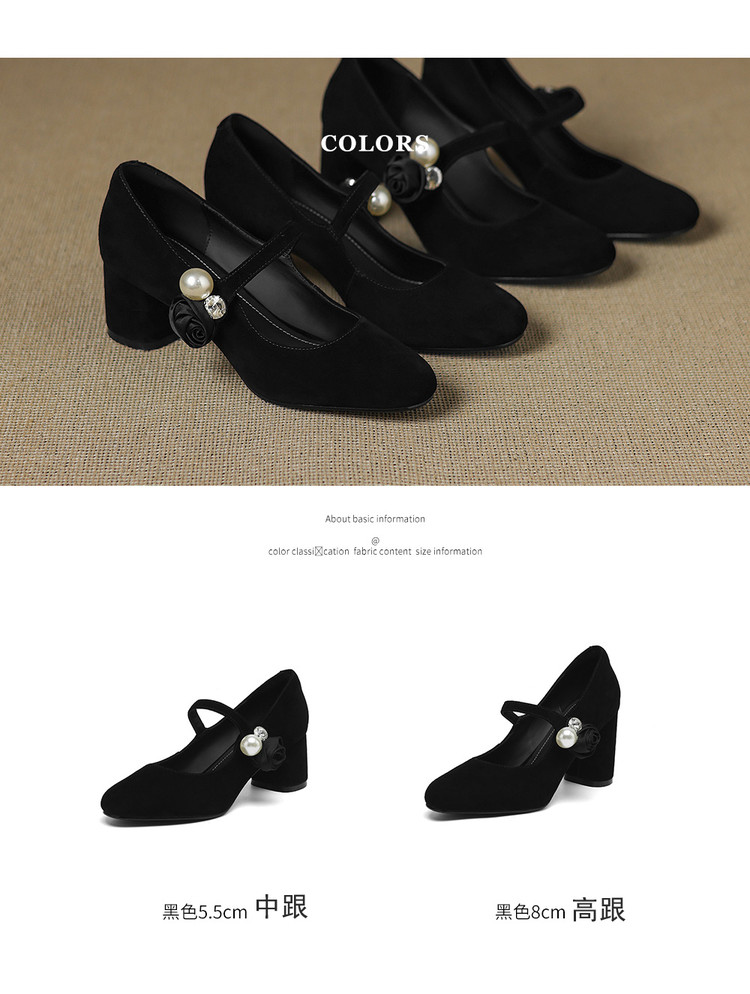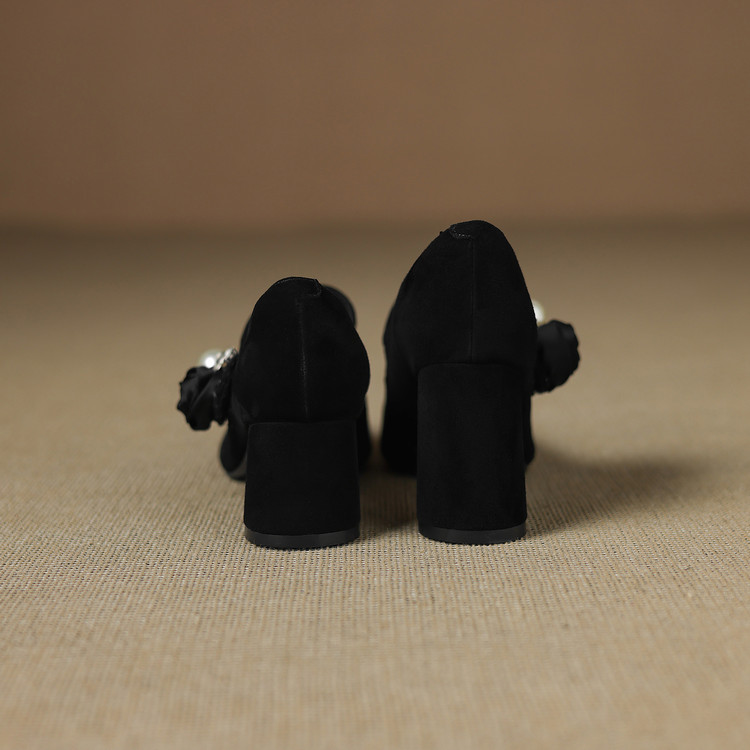 【预售5天】经典复古风黑色羊反皮粗跟珍珠一字带高跟单鞋百搭玛丽珍高跟鞋MNLS&D2533