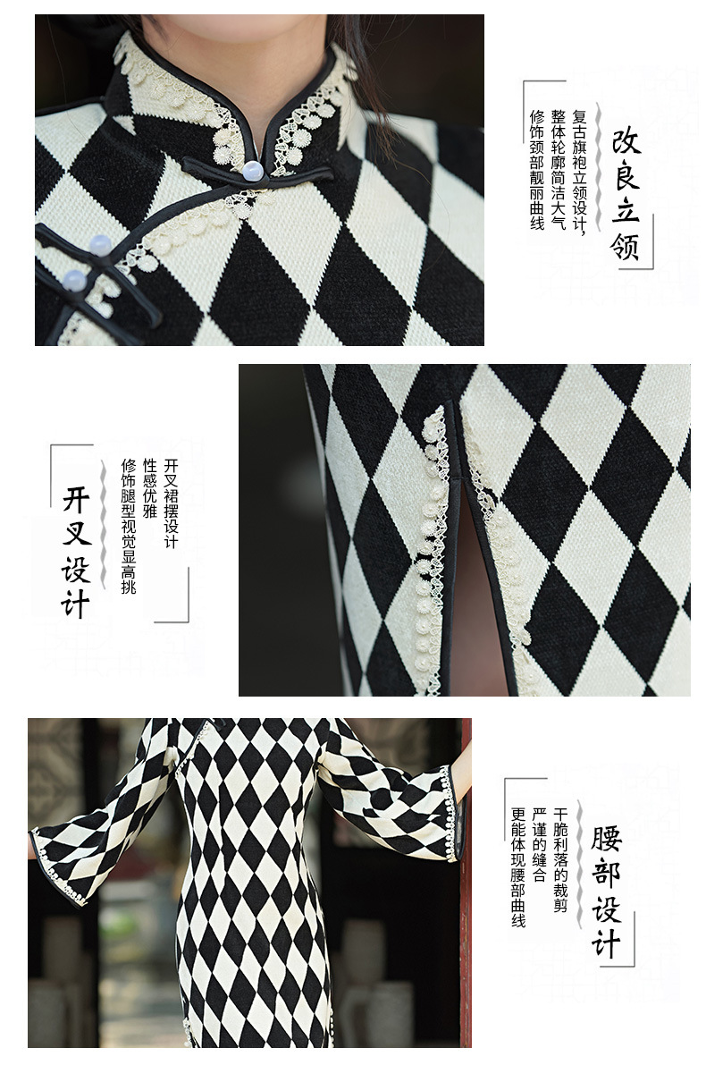 GSJ-3107秋冬款上新改良旗袍喇叭袖复古高开叉性感修身裙
