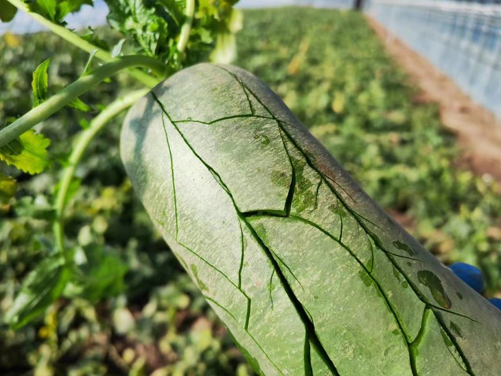 夏天会进行高温闷棚,杀灭大部分的虫卵和病菌。立秋后,撤掉棚膜,全棚覆盖防虫网后开始种植。生长中后期,不使用任何化学品进行增甜。利用冬季低温,让萝卜慢慢积累甜度,还会特意冻两次萝卜,利用自然胁迫的方式,让萝卜轻微受冻,从而把更多的淀粉转化为糖,让萝卜更甜更酥脆。
